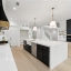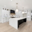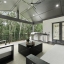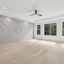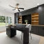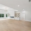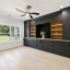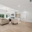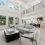 The living room serves as the heart of the home, crowned with coffered ceilings and framed by windows that bathe the space in natural light. A striking fireplace with custom built-ins and a bold accent wall creates a dramatic focal point, while designer lighting enhances the atmosphere both day and night. Just beyond, a well-appointed wet bar along the back wall—conveniently located by the breakfast area—offers the perfect touch for entertaining, whether serving morning coffee or evening cocktails.