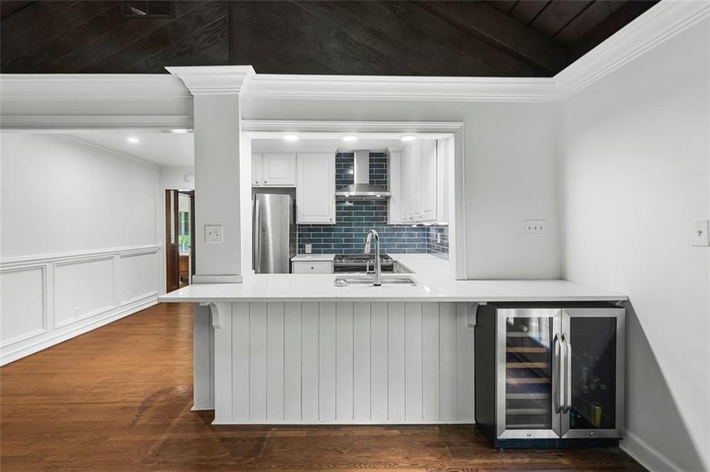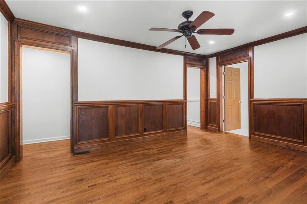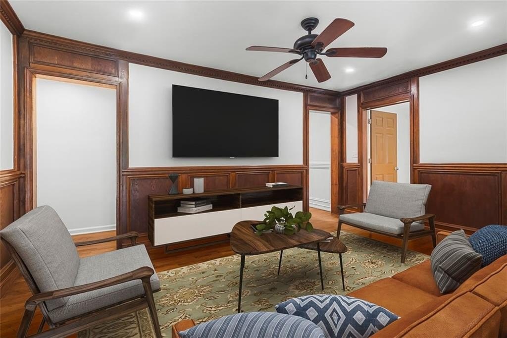 You’ll find original hardwood floors and rich wood paneling in the living room, adding warmth and timeless character throughout.