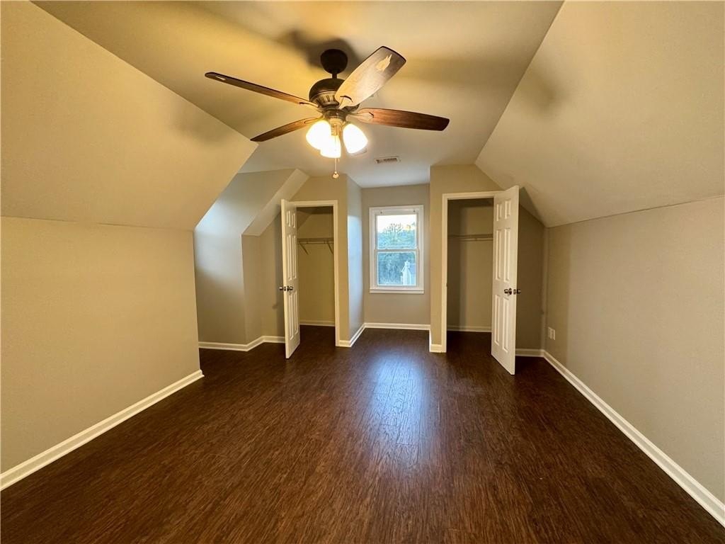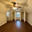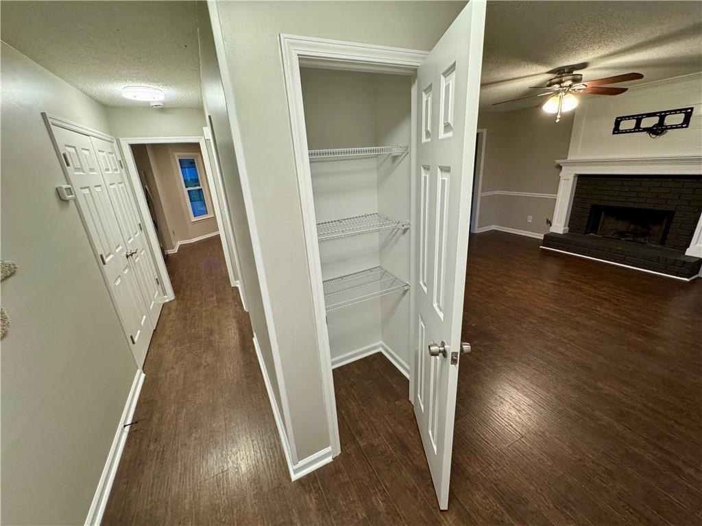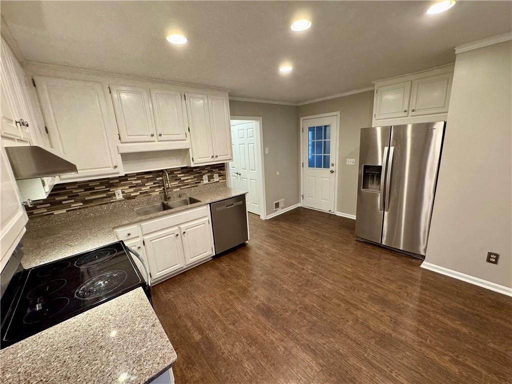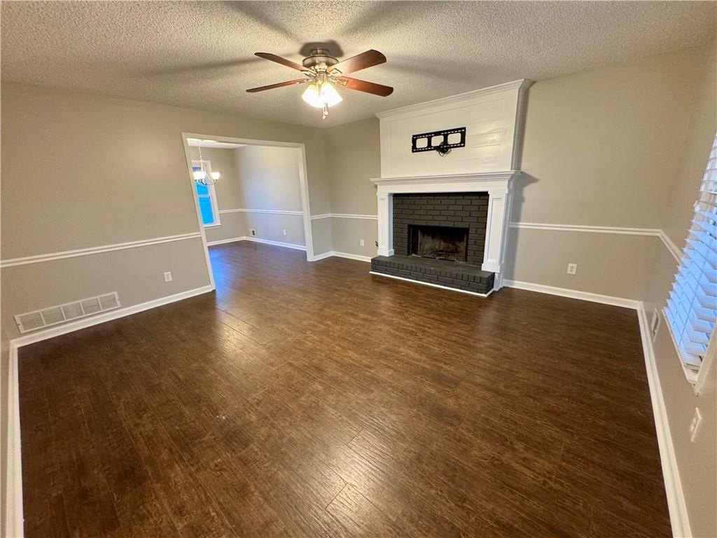 The kitchen features solid surface counters, a new tile backsplash, and a full stainless steel Whirlpool appliance package including refrigerator. The family room is centered around a wood-burning fireplace, and each bedroom is complete with new ceiling fans.