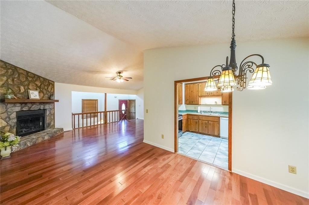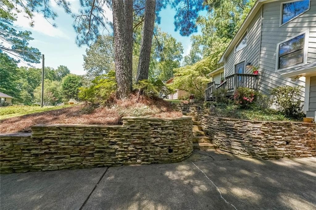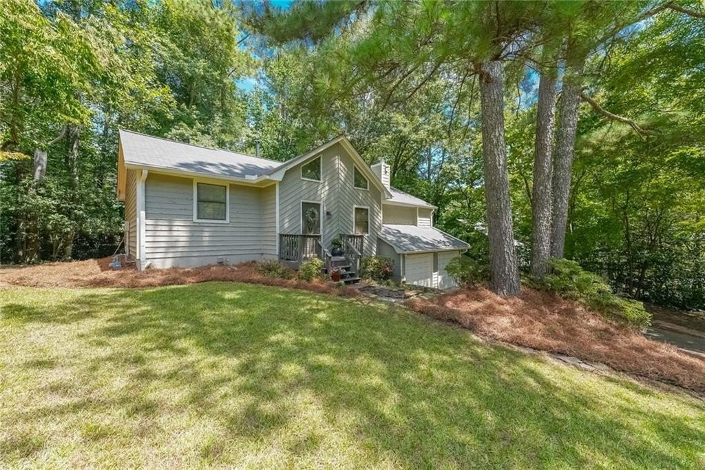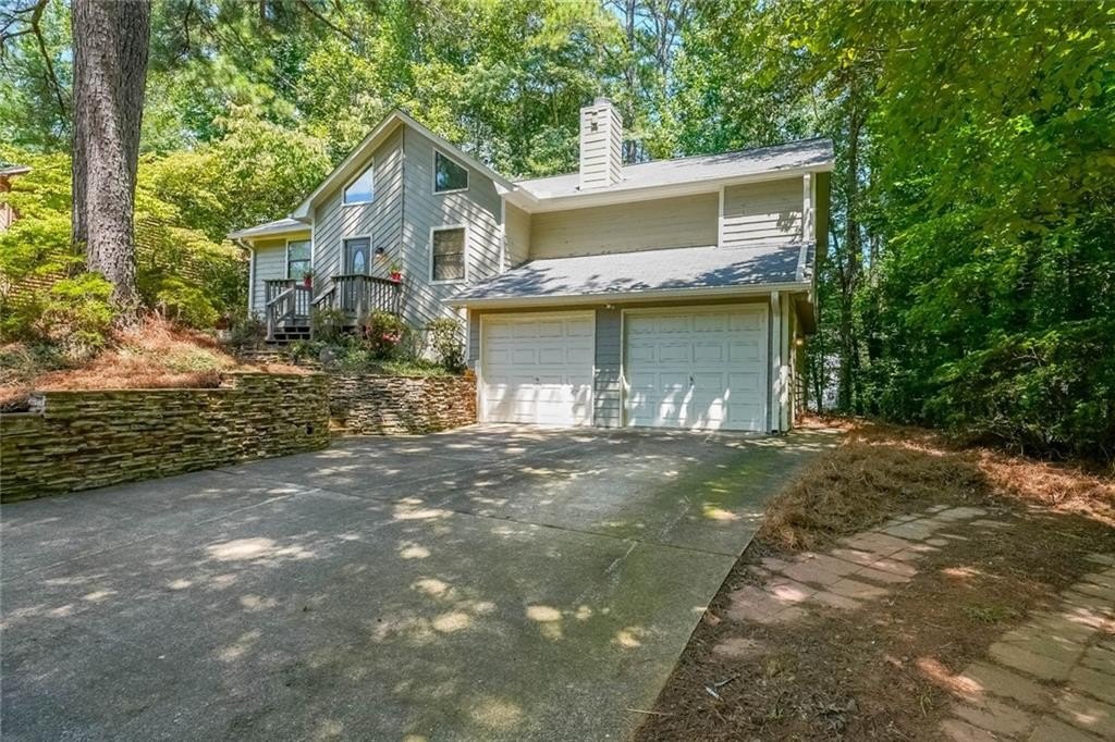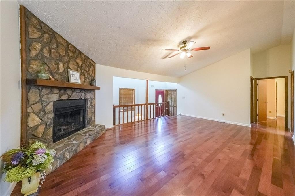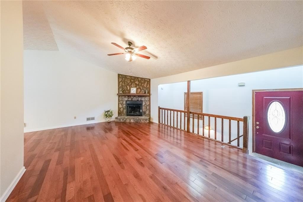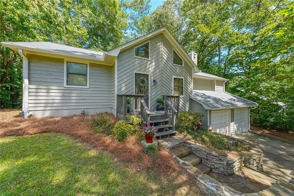 Welcome Home! This beautiful, freshly painted exterior home offers elegant stonework walls, stairs, and walkway. As you enter, the home opens up with cathedral ceilings and tasteful hardwood flooring throughout most of the main level. Stone fireplace adorns this X-Large room. The kitchen has newer stove/oven, vaulted ceiling with skylight and tile flooring. French doors open to wooded, private lot & deck w/built in seating. Both baths are updated w/tile floors. The guest bath has a skylight too! Several rooms have newer interior paint. The basement is partially finished. All you need is some flooring and a few ceiling tiles. Other great features are newer roof (2023), wider gutters (2022), Aquaguard regrade & straps on laundry room wall (lifetime warranty - transferable), laundry room drywall (2024), new carpet on stairs and entry (2024), new disposal (2024), chimney siding replacement & new exterior paint (2024). Updates to electrical panal (2025).