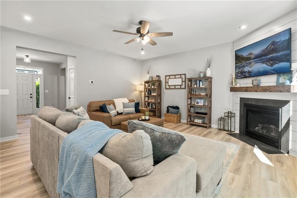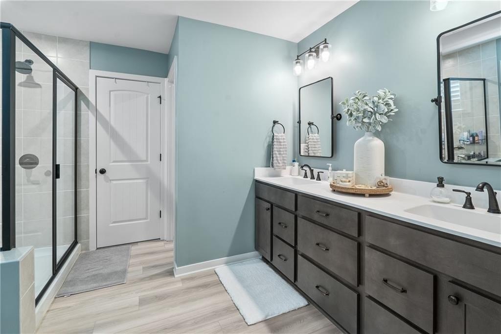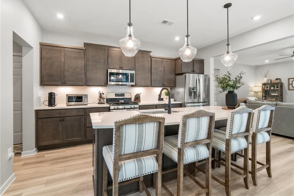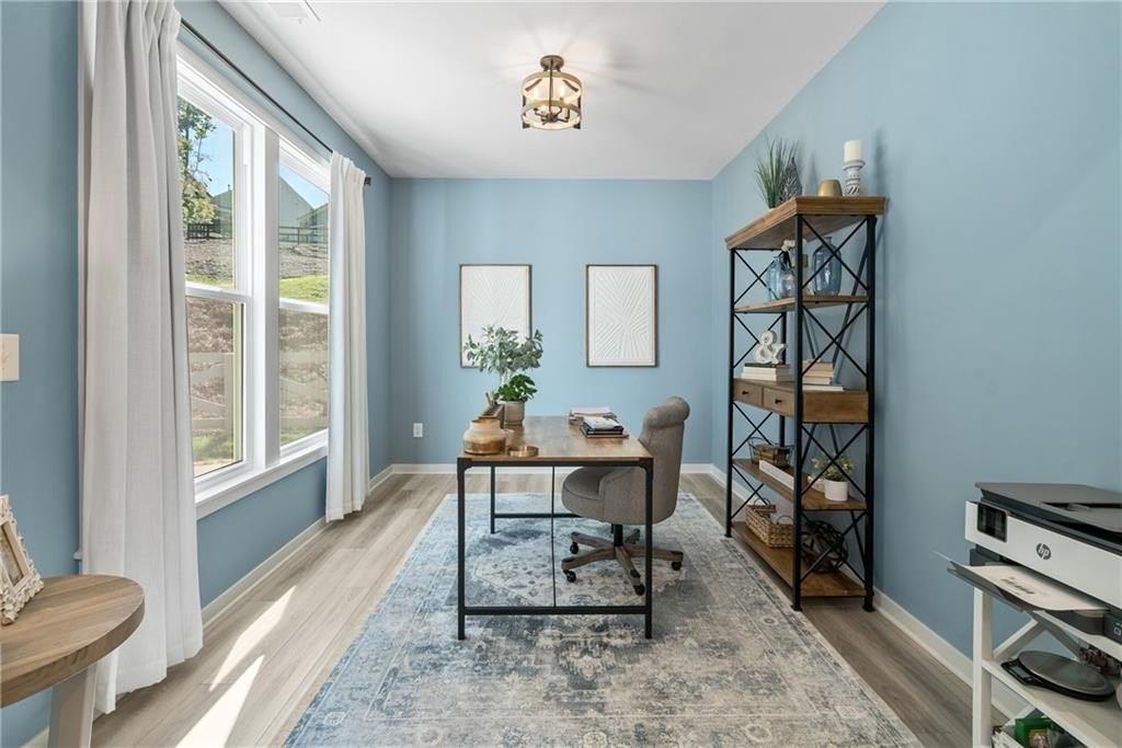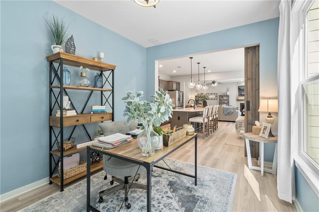 Better than new! This beautifully designed home offers 4-bedroom, 2.5-baths and features bright and airy rooms filled with natural light from numerous windows, creating a warm and inviting atmosphere throughout. The kitchen boasts an oversized island, quartz countertops, a spacious walk-in pantry for all of your culinary needs, and a large dining area-perfect for everyday living and entertaining. A dedicated home office or flex space with barn doors provides privacy when needed while the versatile loft provides the ideal spot for movie nights, gaming, or a quiet place to read. The primary bedroom is generously sized with a spa like bathroom, dual sinks, large shower and huge walk in closet. All secondary bedrooms are nicely sized and include spacious closets, ensuring comfort and functionality for everyone. Additional highlights include a mudroom, extra storage in the garage, and a fully fenced backyard with an extra-large flagstone patio-ideal for entertaining or relaxing. The level, private lot backs up to Eagles Beak Park and the Etowah River, offering serene views and easy access to nature. Enjoy the neighborhood amenities, including swim, tennis, pickleball, clubhouse, and playground-all in the sought-after community of River Rock!