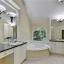 The expansive primary suite is a true retreat with a fireplace, tray ceilings, and a lovely bay window. The en suite bathroom delivers more “wow” moments with soaring vaulted ceilings, a private window above the soaking tub & separate vanities.