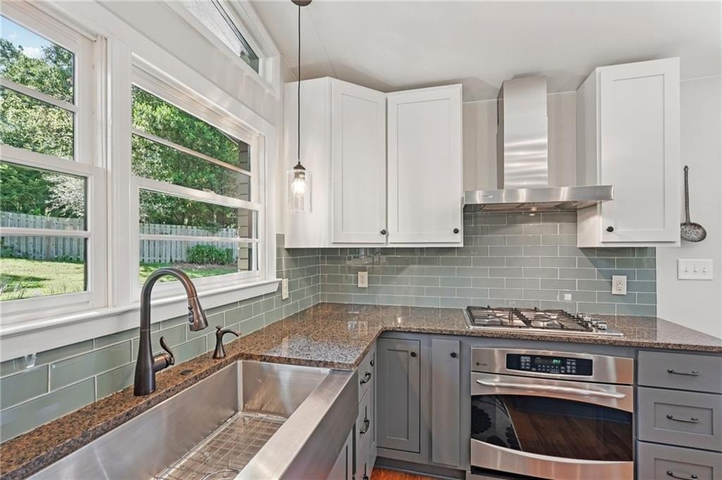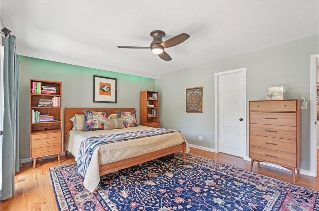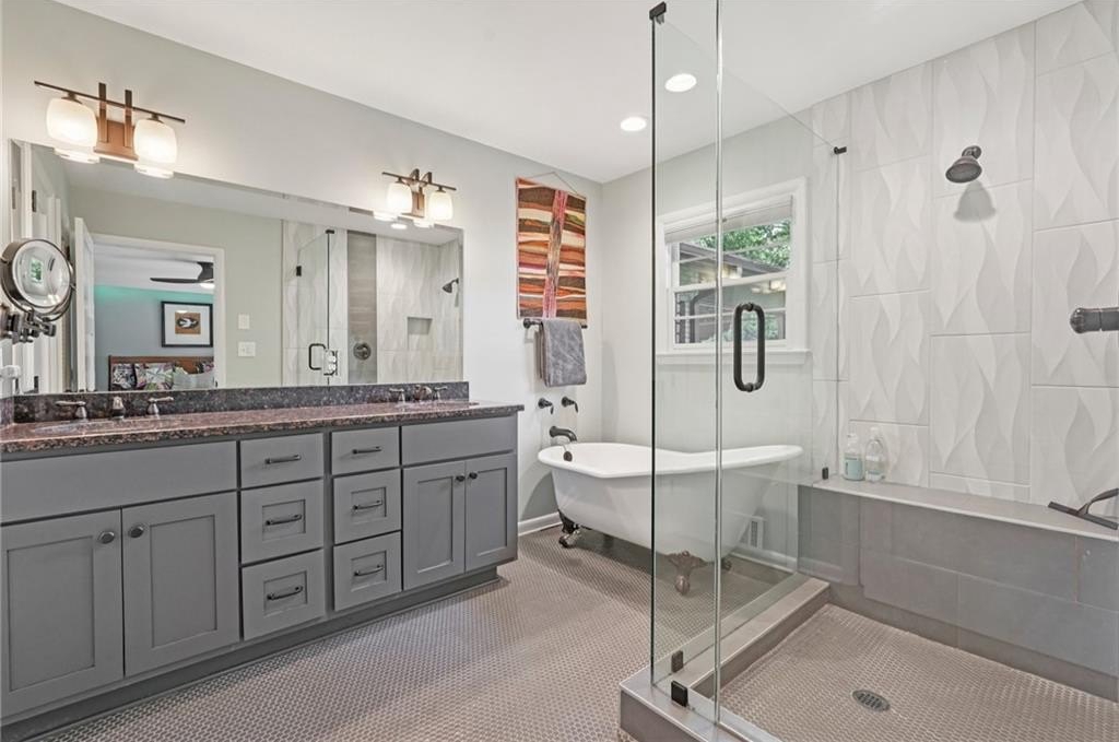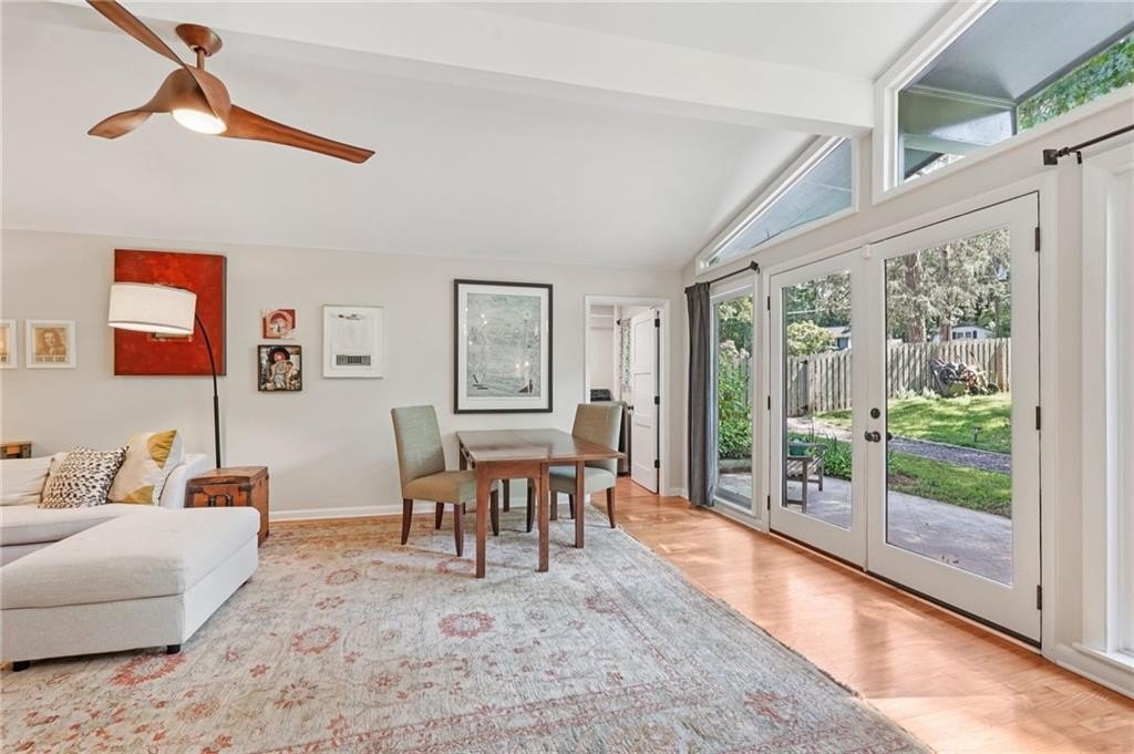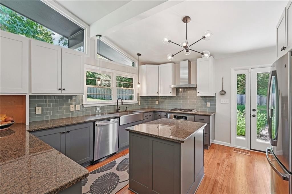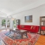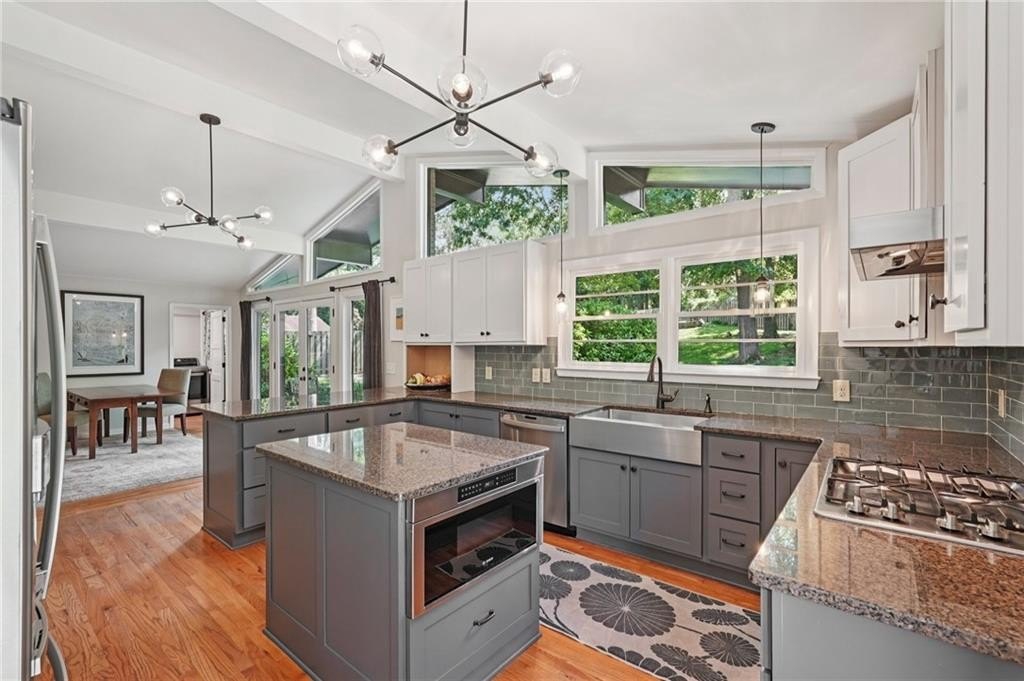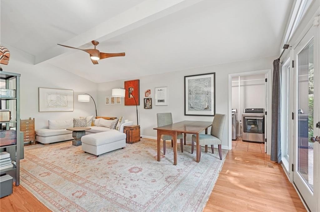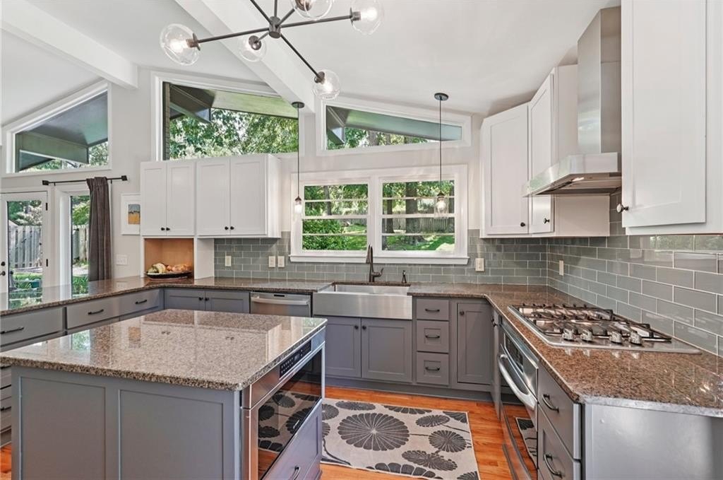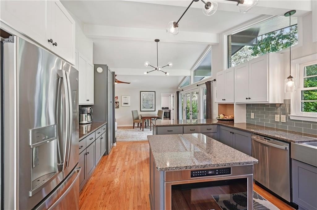 Inside, timeless architecture meets thoughtful updates. The renovated kitchen features stainless steel appliances, geometric backsplash and minimalist cabinetry with modern hardware. Bathrooms have been reimagined with crisp finishes, while refinished hardwood floors and custom retro-inspired lighting celebrate the home’s authentic character.