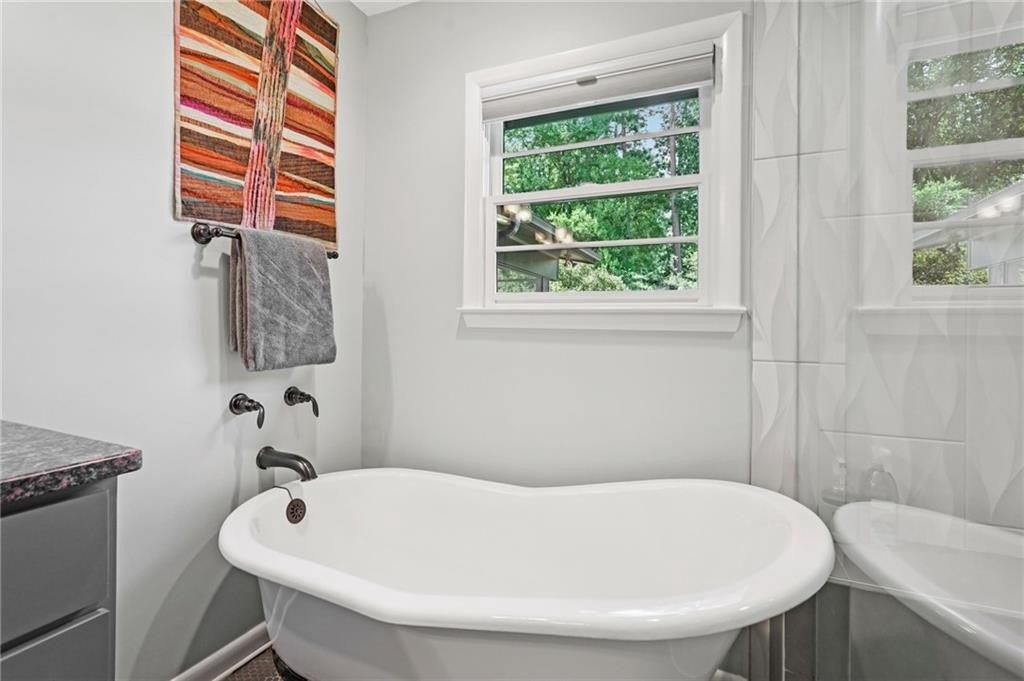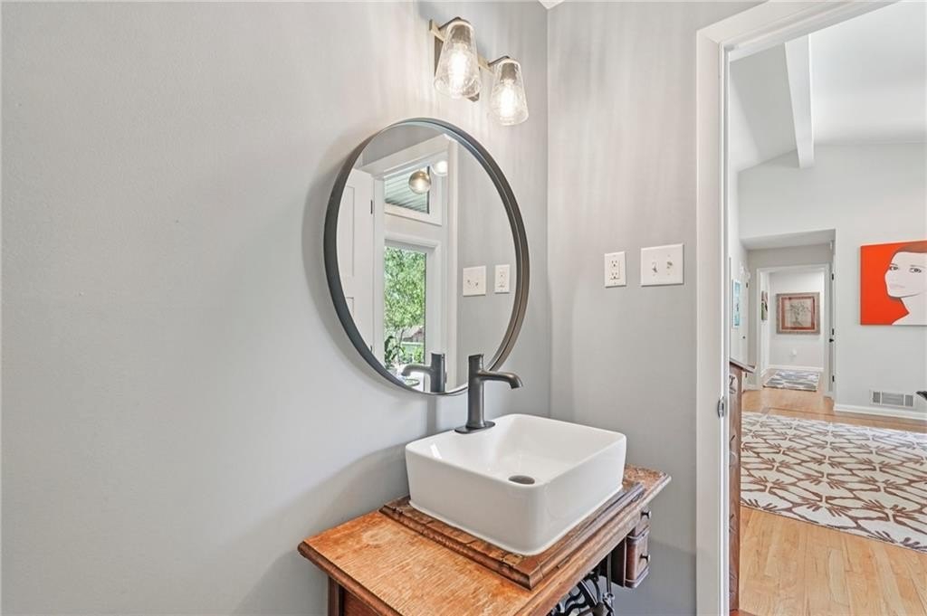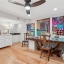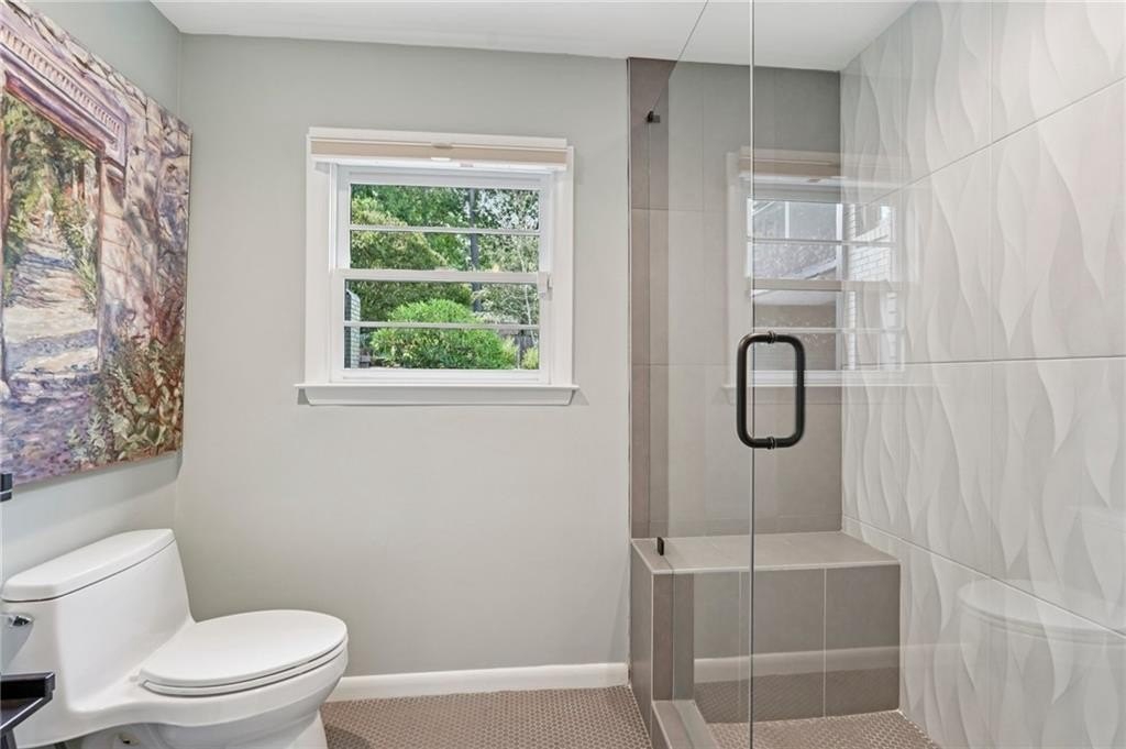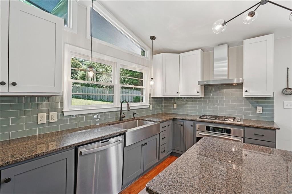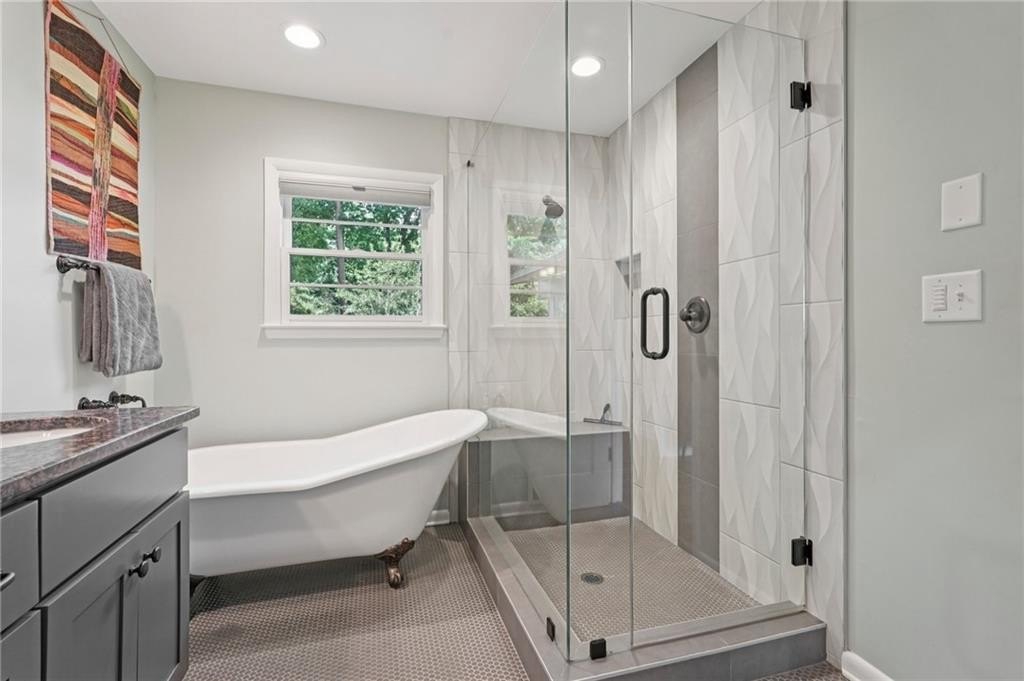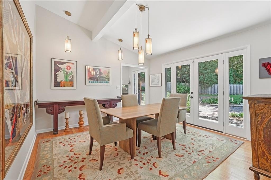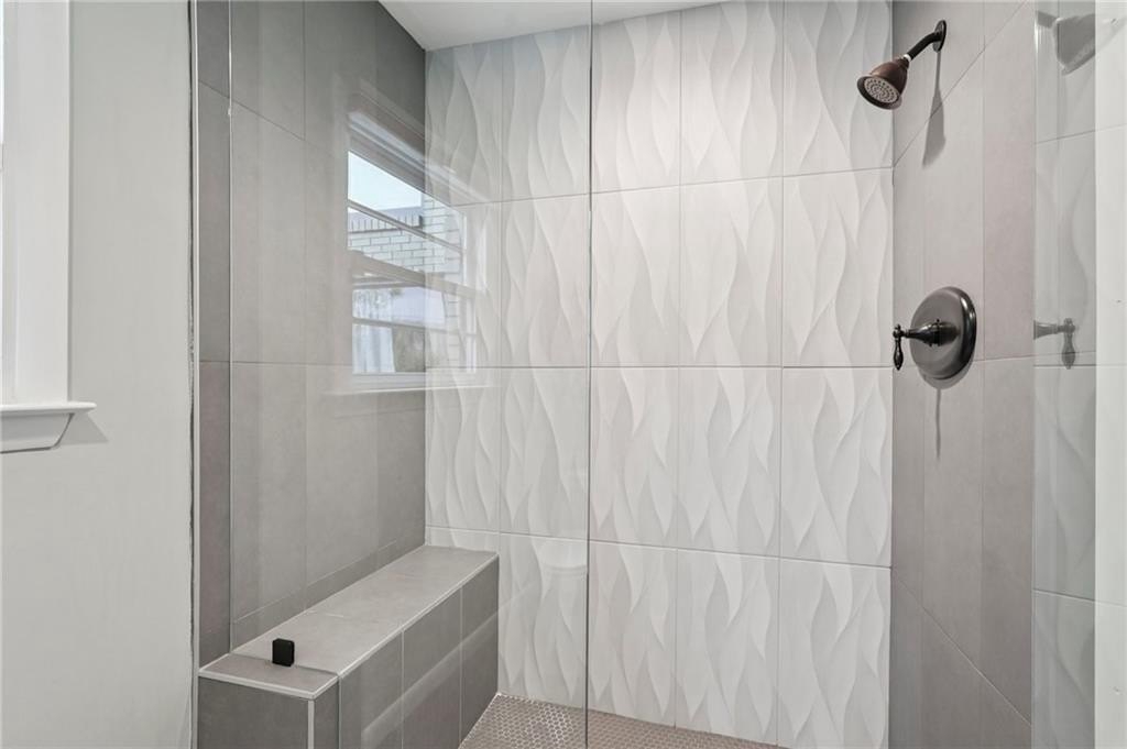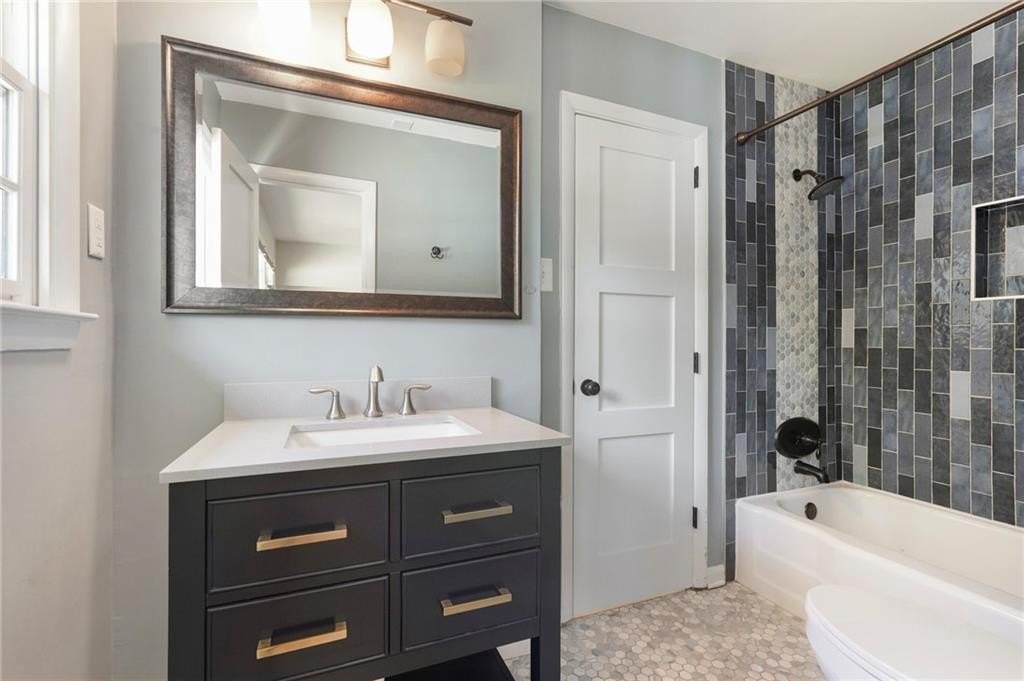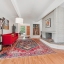 Inside, timeless architecture meets thoughtful updates. The renovated kitchen features stainless steel appliances, geometric backsplash and minimalist cabinetry with modern hardware. Bathrooms have been reimagined with crisp finishes, while refinished hardwood floors and custom retro-inspired lighting celebrate the home’s authentic character.