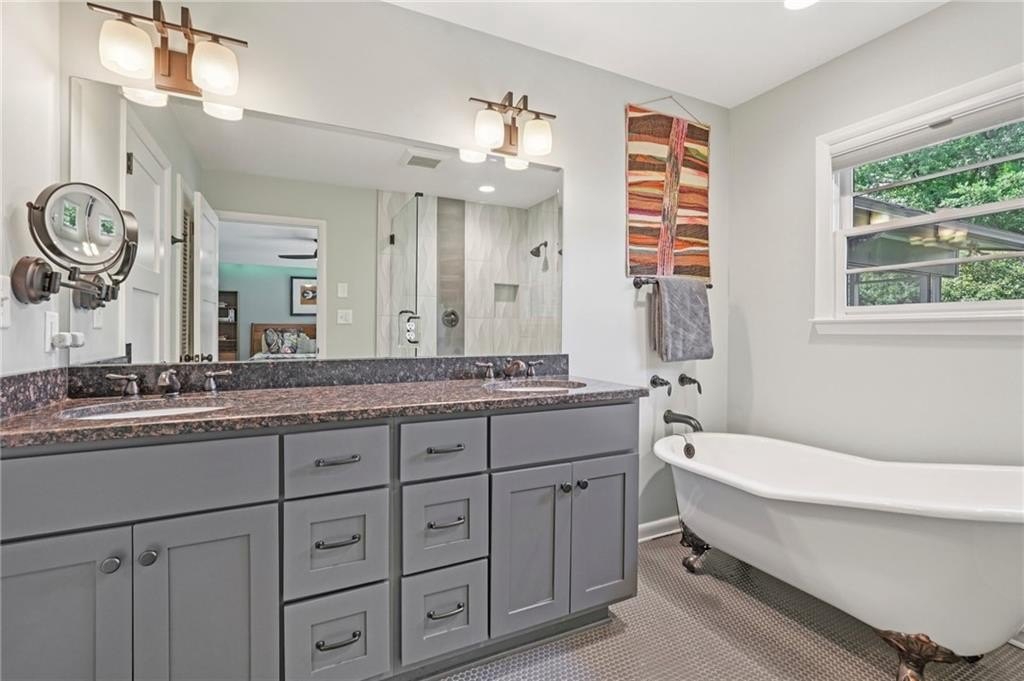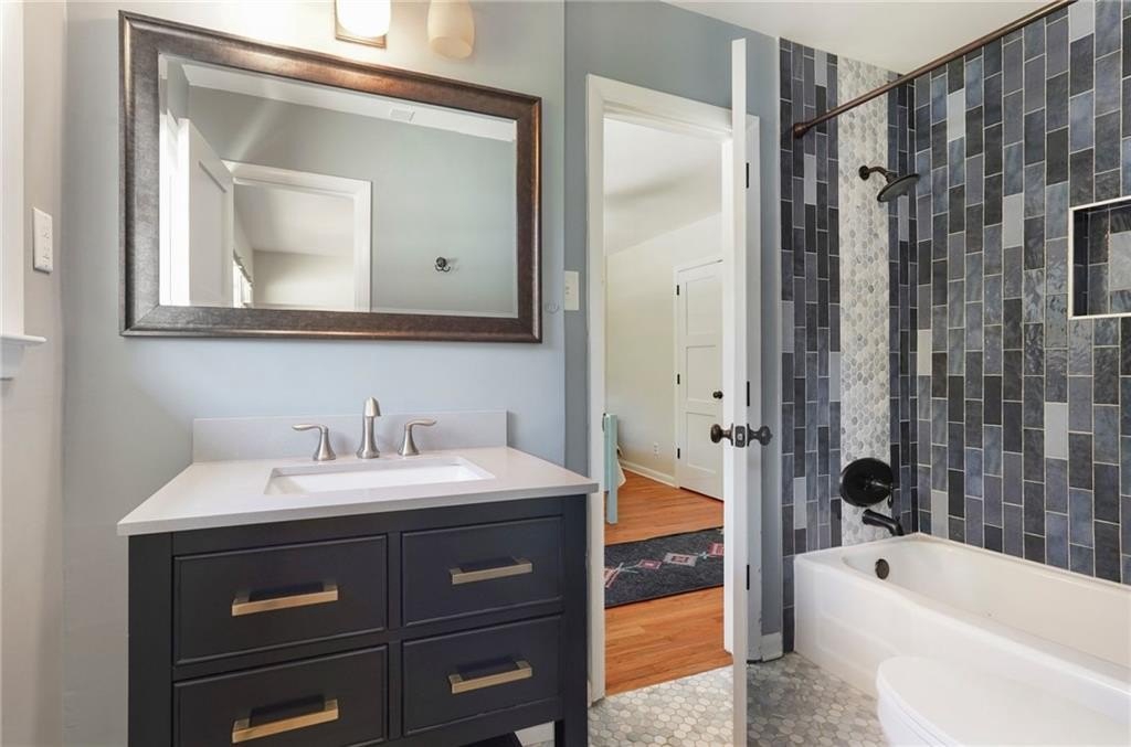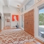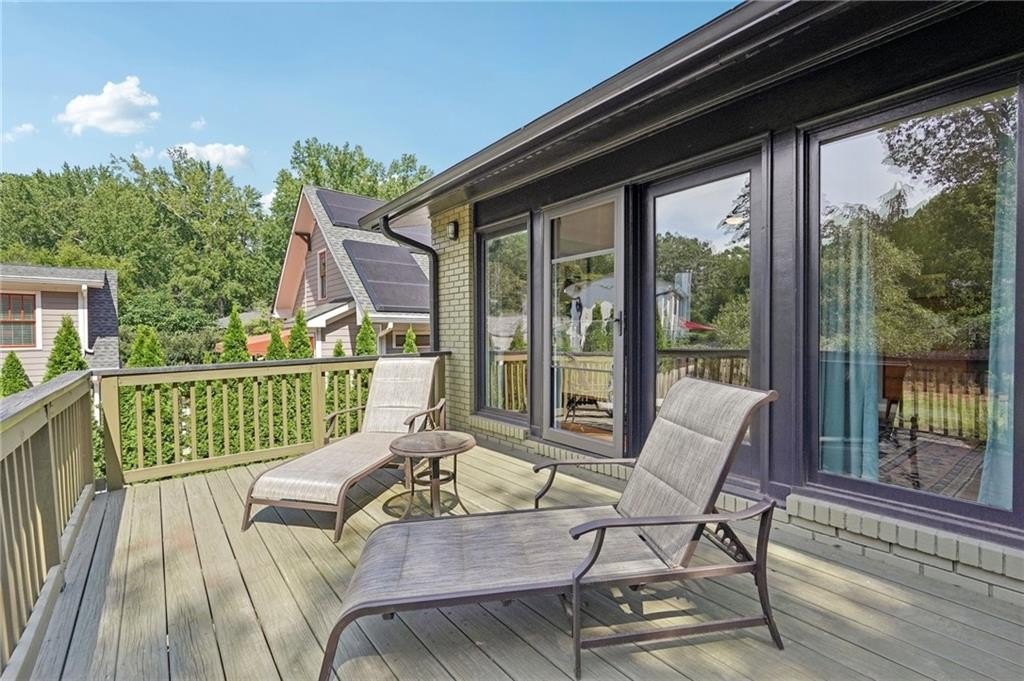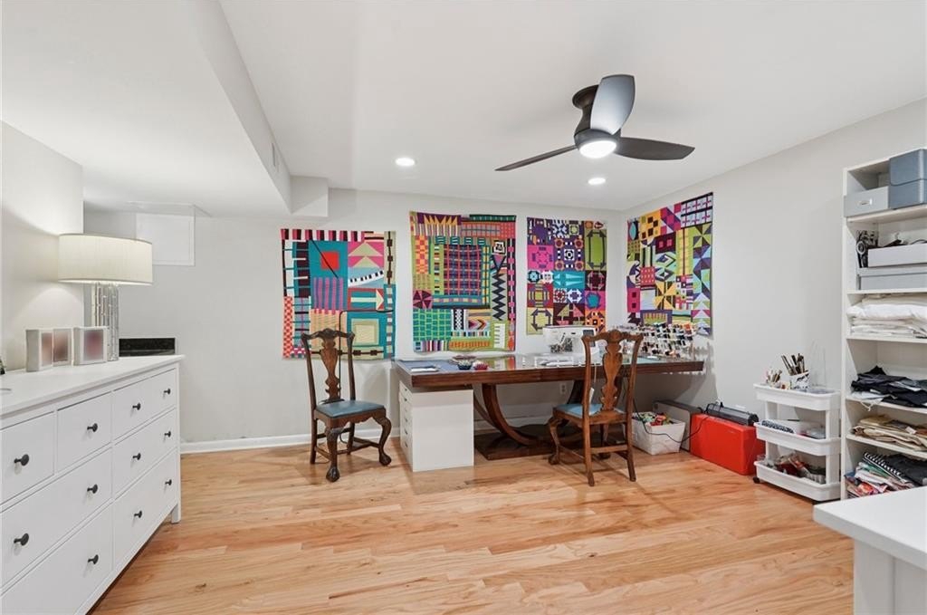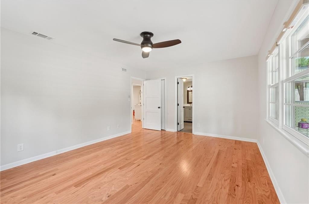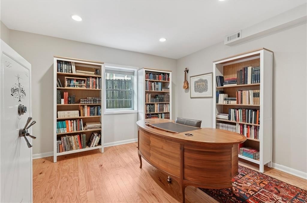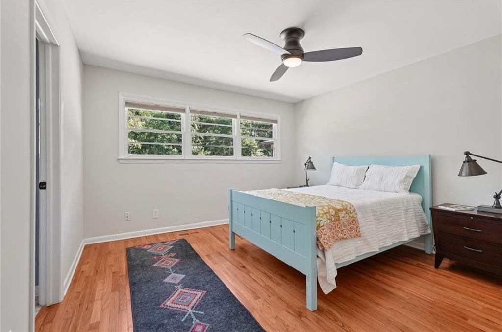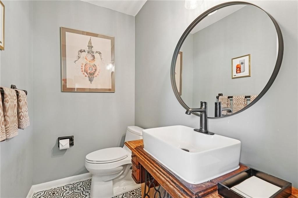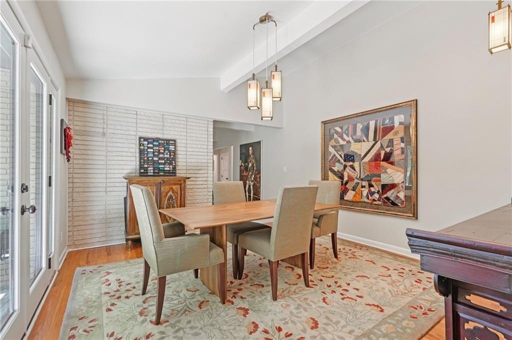Inside, timeless architecture meets thoughtful updates. The renovated kitchen features stainless steel appliances, geometric backsplash and minimalist cabinetry with modern hardware. Bathrooms have been reimagined with crisp finishes, while refinished hardwood floors and custom retro-inspired lighting celebrate the home’s authentic character.