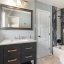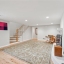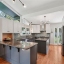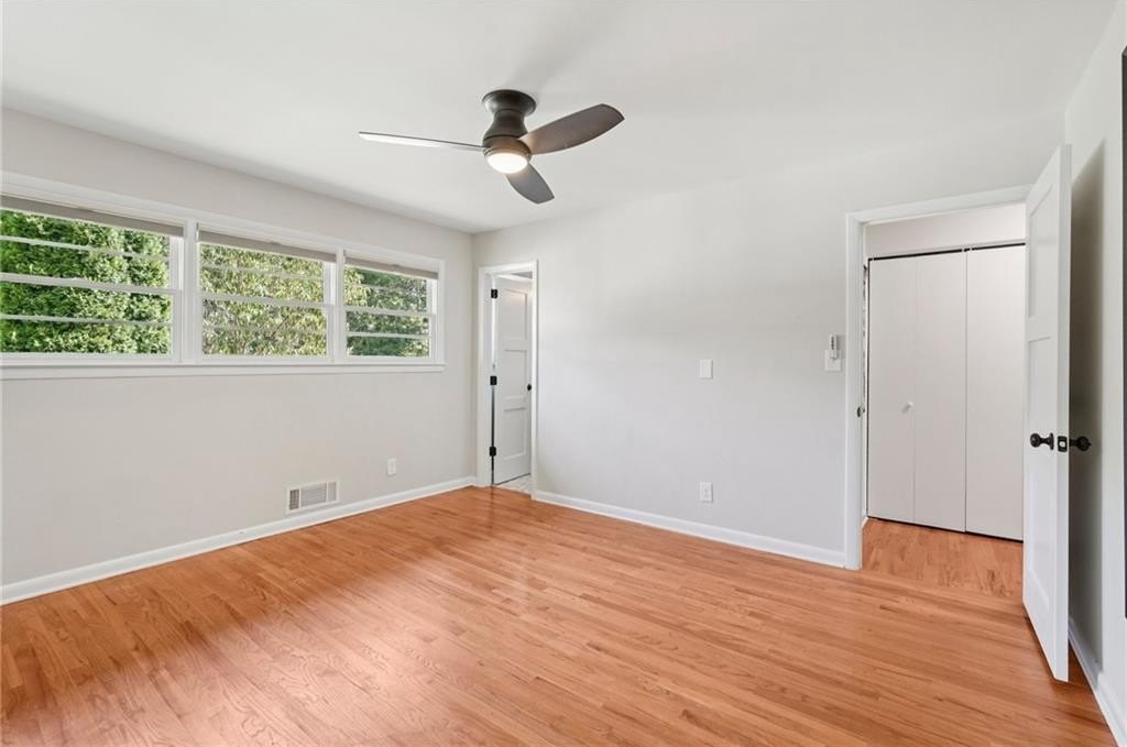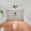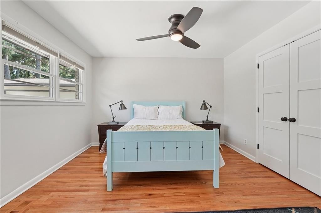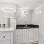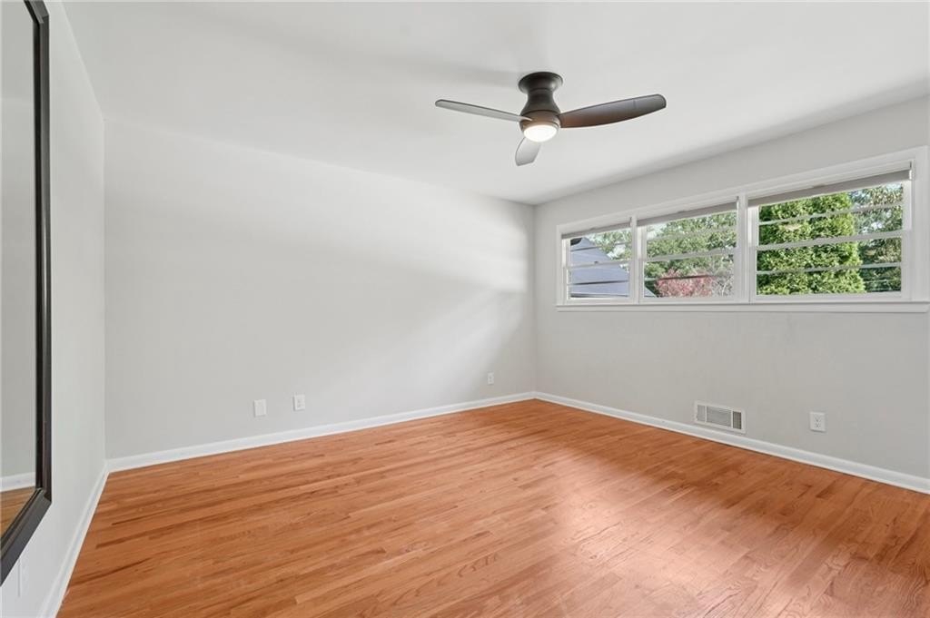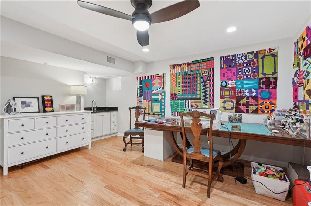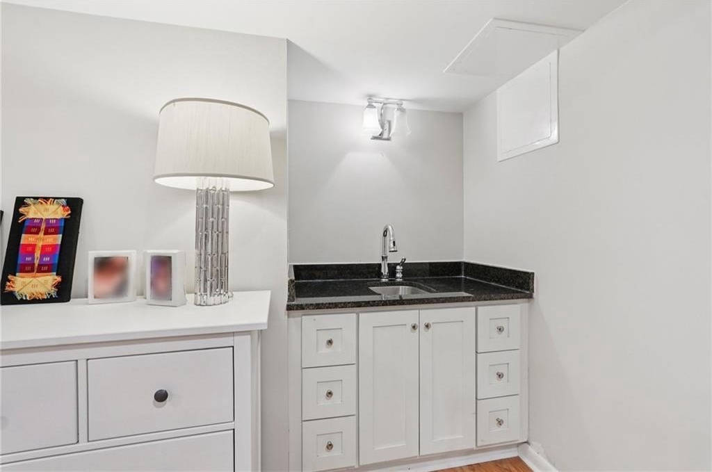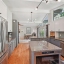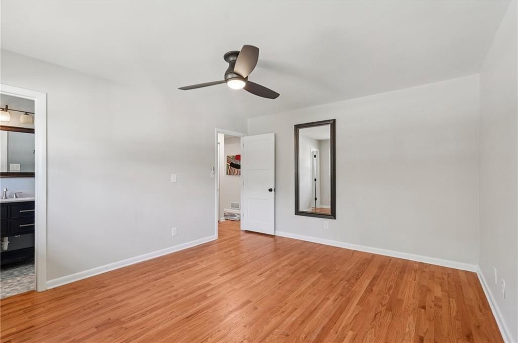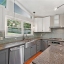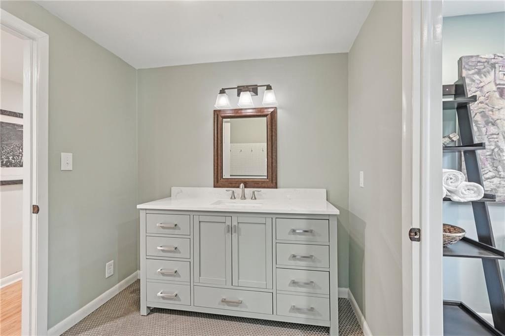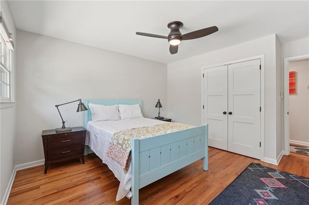 Inside, timeless architecture meets thoughtful updates. The renovated kitchen features stainless steel appliances, geometric backsplash and minimalist cabinetry with modern hardware. Bathrooms have been reimagined with crisp finishes, while refinished hardwood floors and custom retro-inspired lighting celebrate the home’s authentic character.