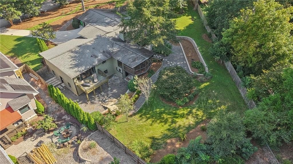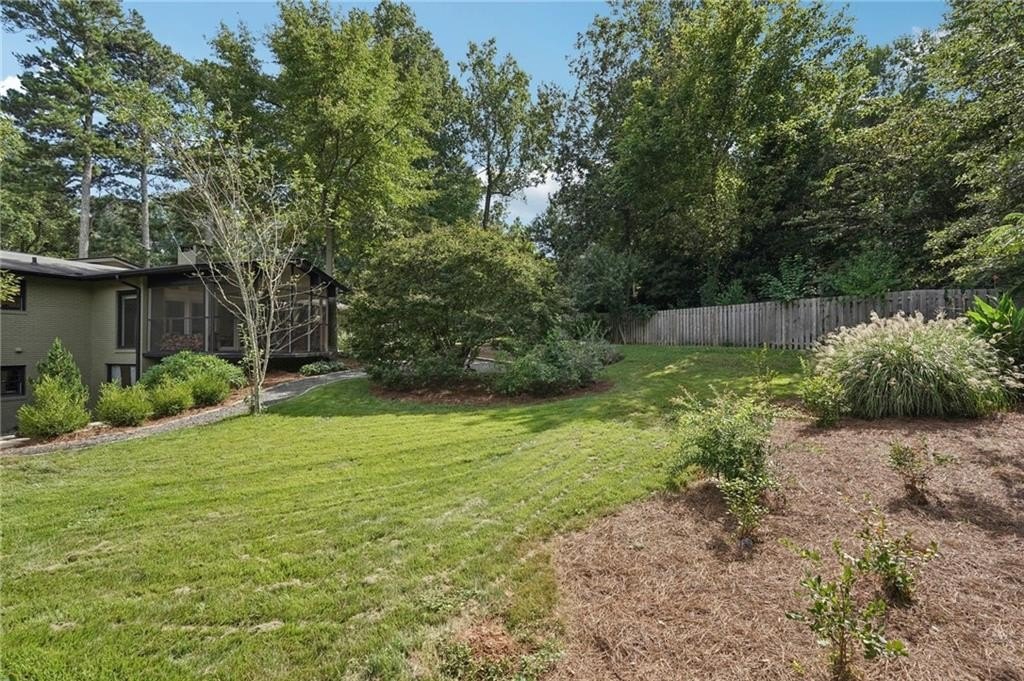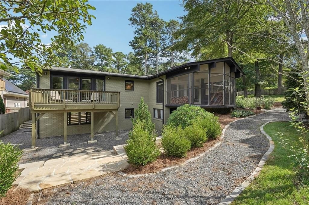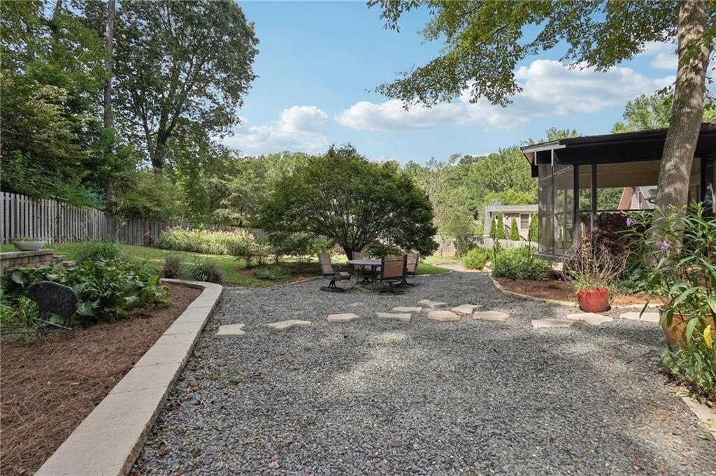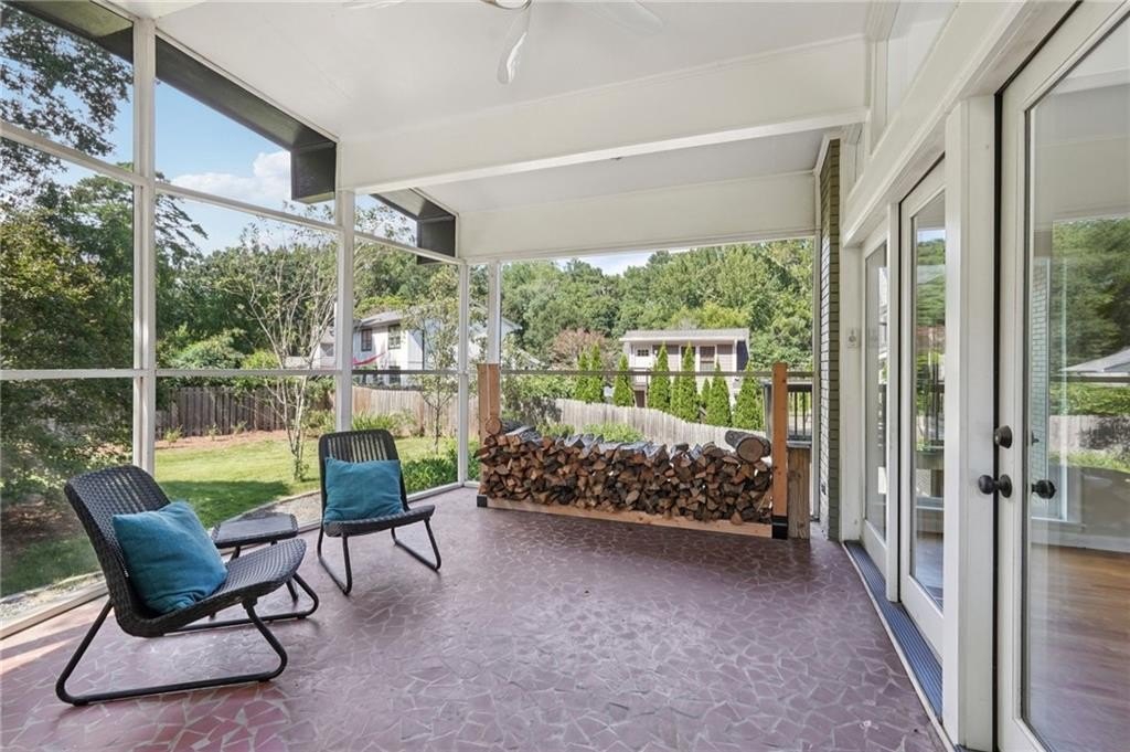 At the center of it all is the spacious, light-filled living room with its *floating fireplace*, opening seamlessly to a delightful screened-in porch that overlooks the lush, fenced-in backyard—a perfect extension of your living space.