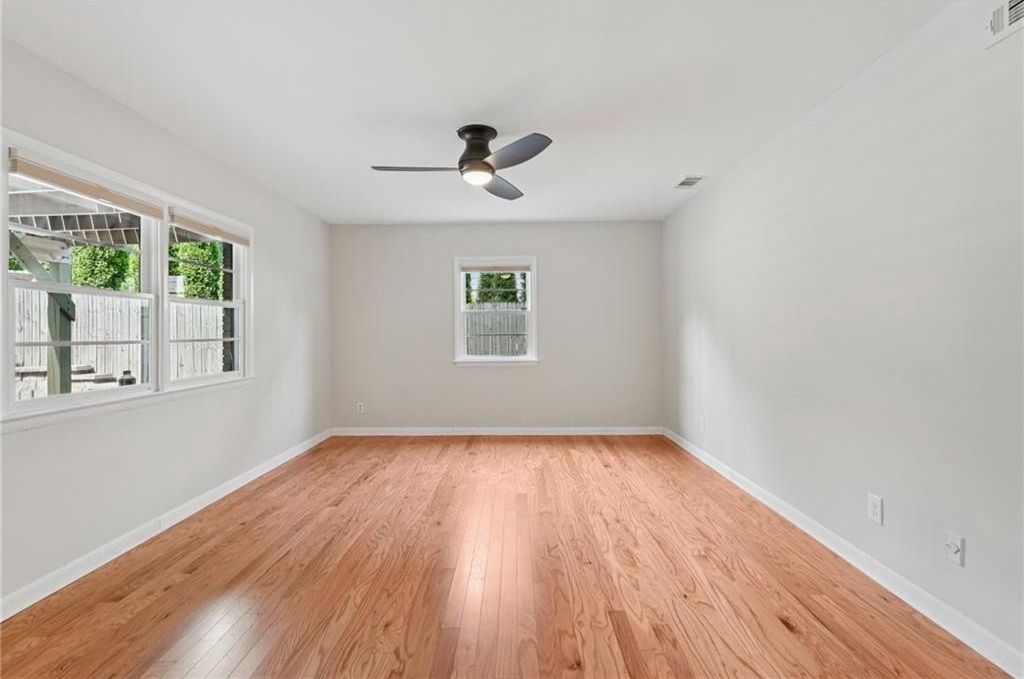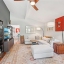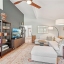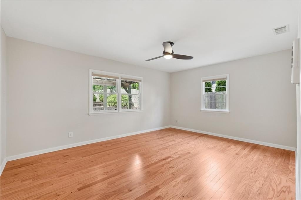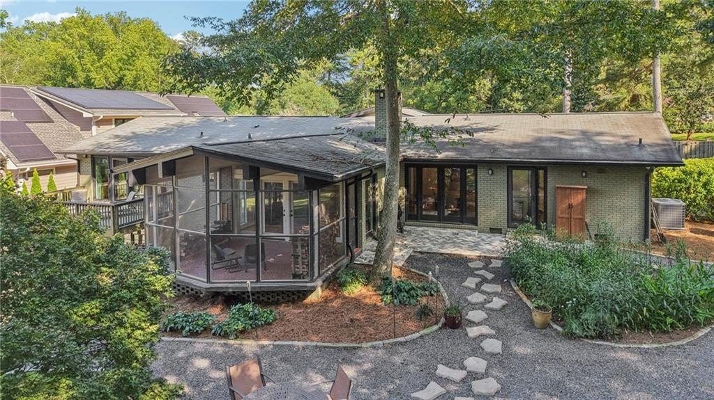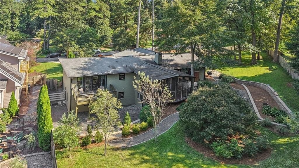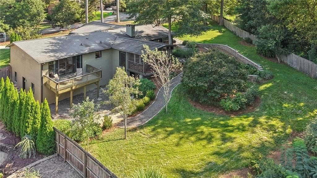 At the center of it all is the spacious, light-filled living room with its *floating fireplace*, opening seamlessly to a delightful screened-in porch that overlooks the lush, fenced-in backyard—a perfect extension of your living space.