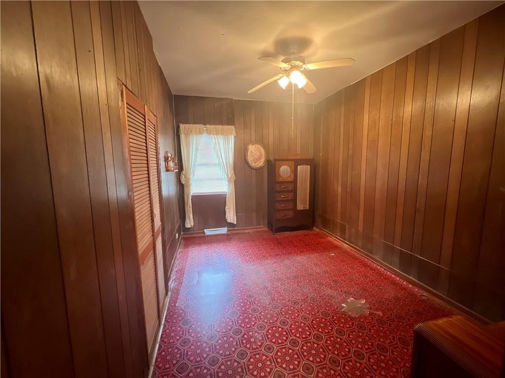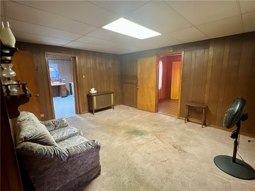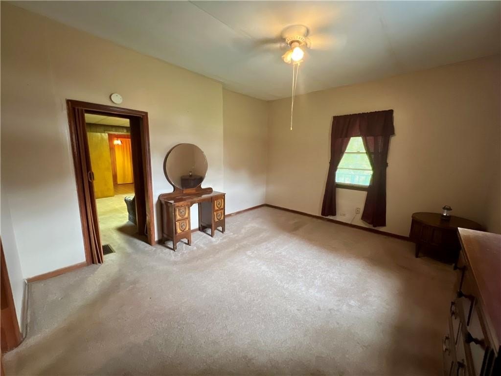Inside, the main bedroom is generously sized and shares a bathroom with the second main-floor bedroom. Underneath the existing carpet, you’ll discover beautiful original hardwood floors in both the main bedroom and living room, just waiting to be restored to their former glory. The living room features a drop ceiling, but like other rooms in the house, it has the same higher ceilings, just hidden underneath the drop ceiling.