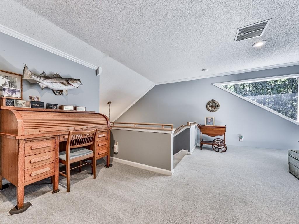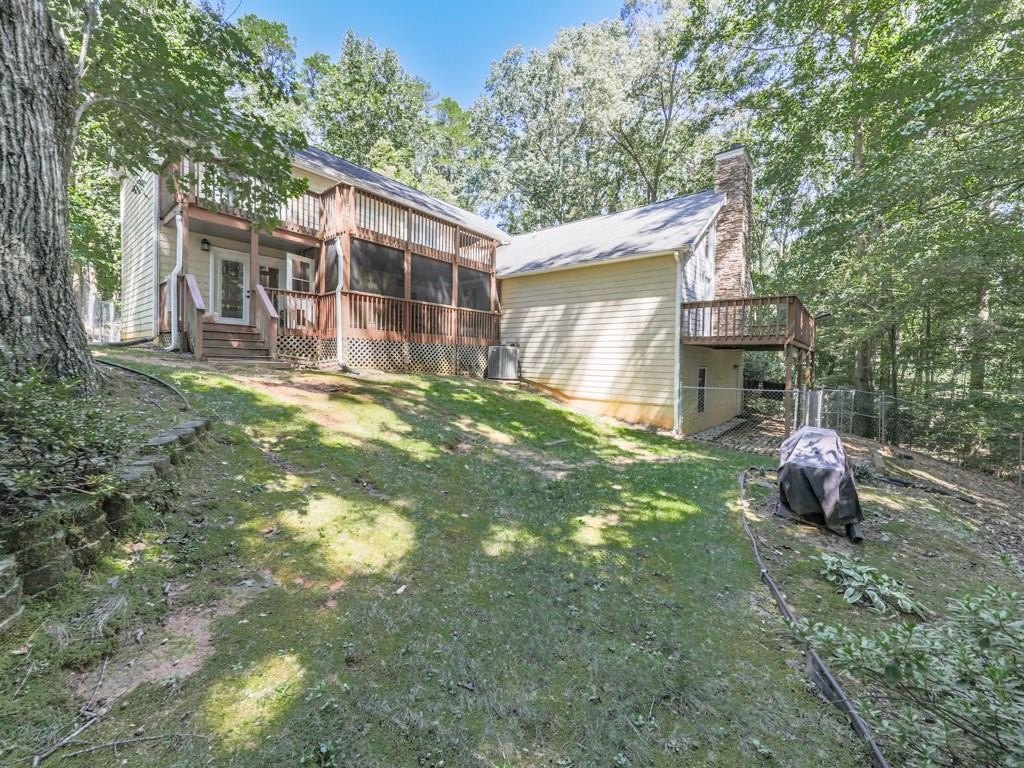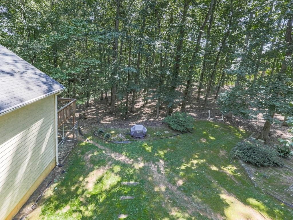 Nestled on over 2 acres of wooded privacy, this solid and inviting home offers the perfect blend of space, charm, and convenience. The open floor plan flows beautifully, starting with a warm and welcoming kitchen featuring solid wood cabinetry, stainless steel appliances, and granite countertops. A huge breakfast/dining room provides plenty of space for gatherings, while the massive family room impresses with its gas log fireplace, soaring vaulted ceilings, and access to a private back deck overlooking the serene setting. Upstairs, you'll find a versatile loft/office and a stunning master retreat with its own private balcony. The spa-like en-suite bath features a clawfoot soaking tub, tiled walk-in shower, and double vanity. Two additional spacious bedrooms are located on the main level along with a covered, screened porch perfect for enjoying the outdoors year-round. The finished basement expands your living options with a large common area, additional bedroom and full bath! Outside, a fenced backyard provides plenty of room to roam, while the long winding driveway crosses a tranquil creek, setting the tone for this peaceful retreat. Located just seconds from Milton, Alpharetta, and Cumming parks, shopping, and activities, this home is a true showstopper-offering the best of privacy, space, and location.