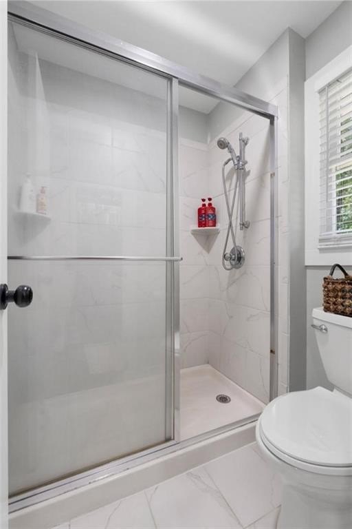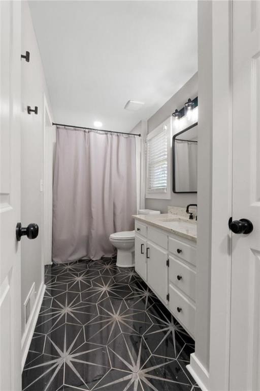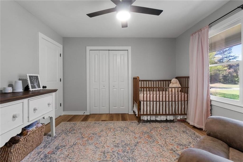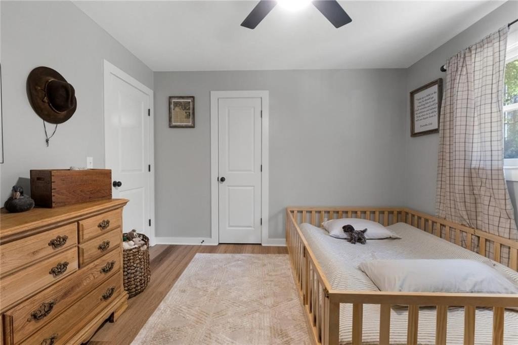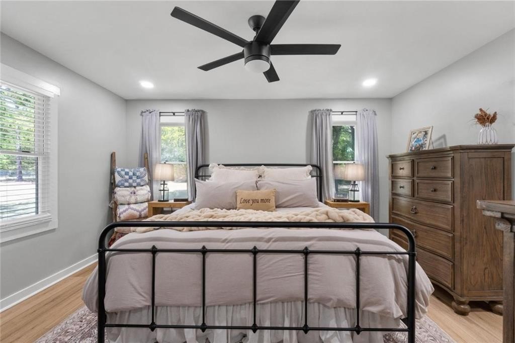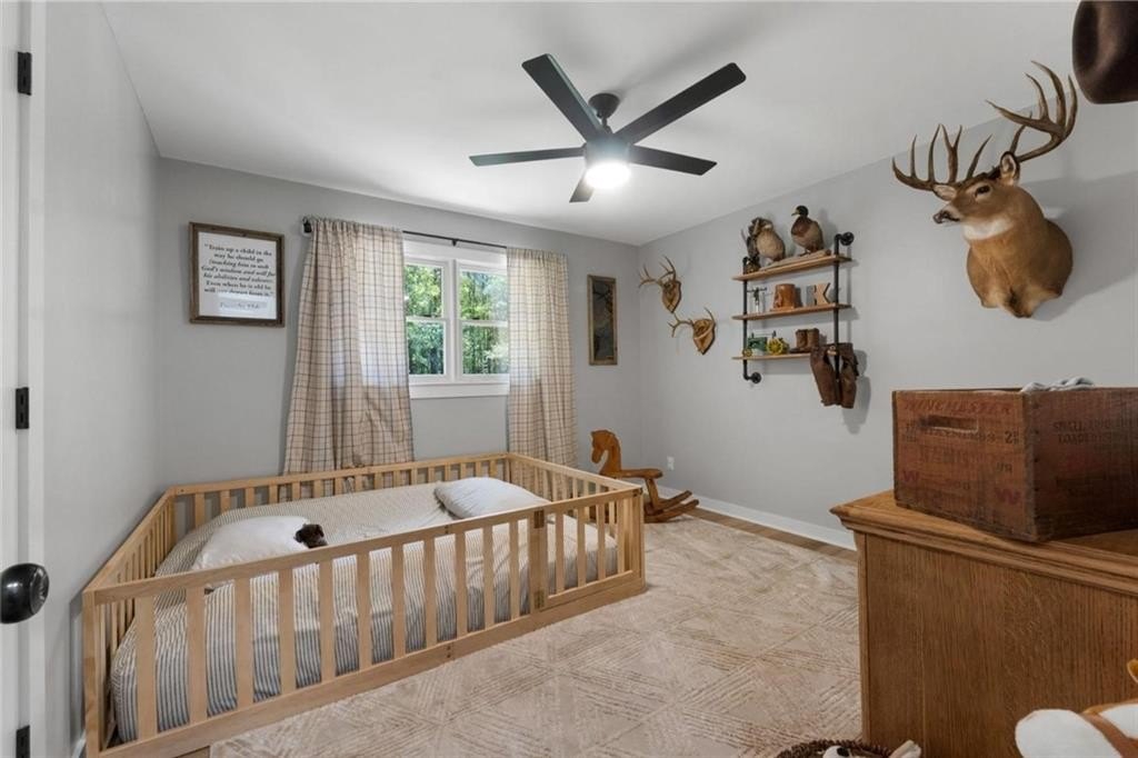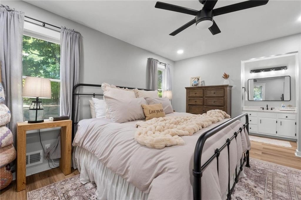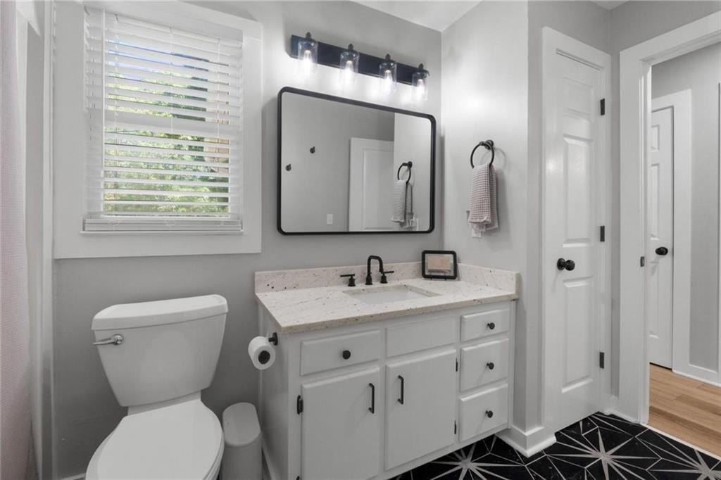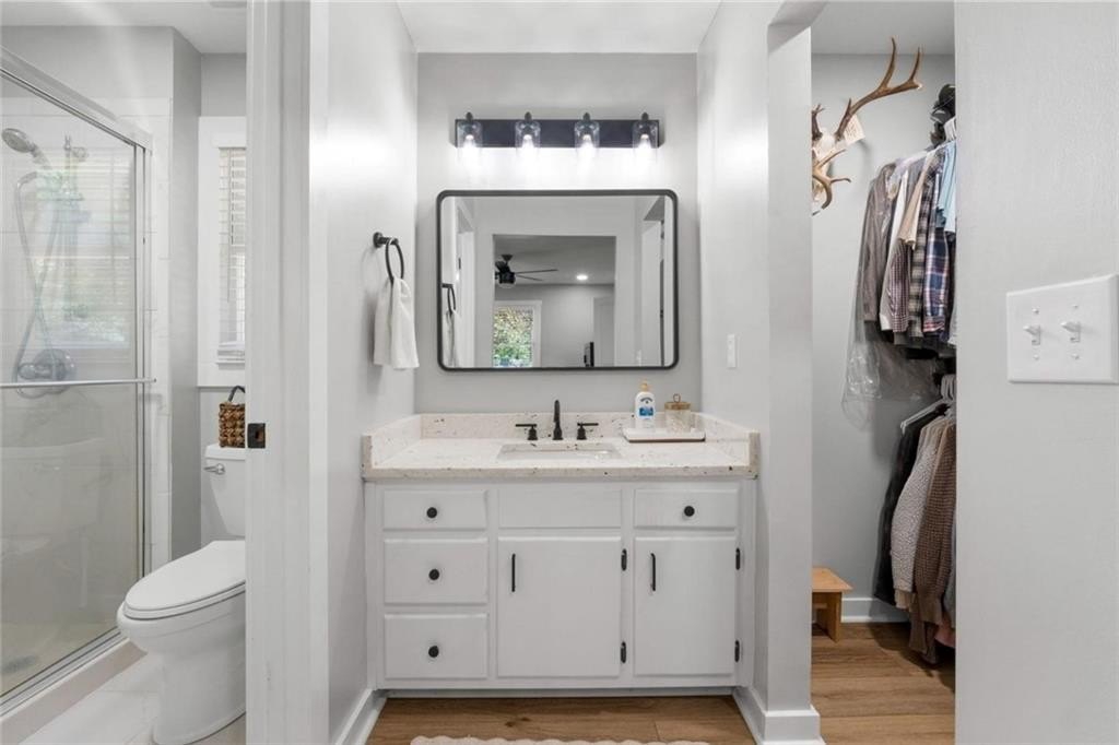 The primary suite features a walk-in closet and an updated bath with a new shower. Two additional bedrooms, each with ample closet space, share a full hall bath.