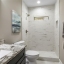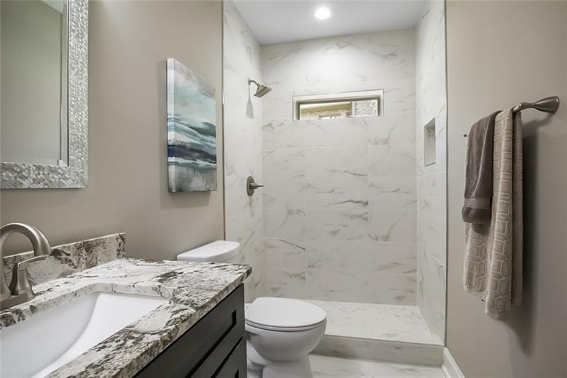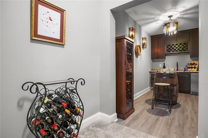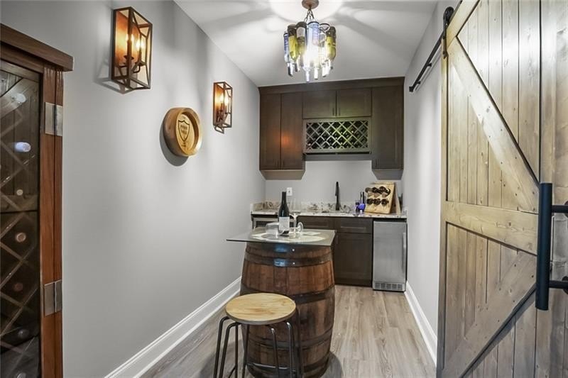 full bath with walk in shower, custom bar area with ice maker and wine refrigerator and