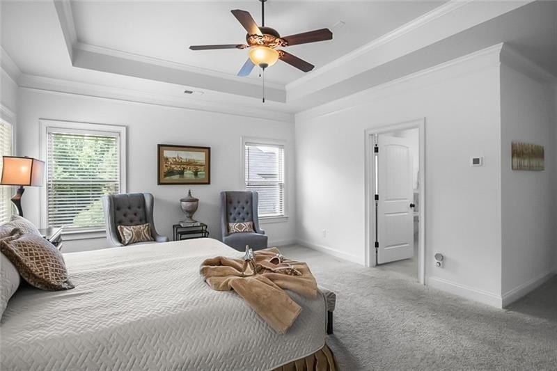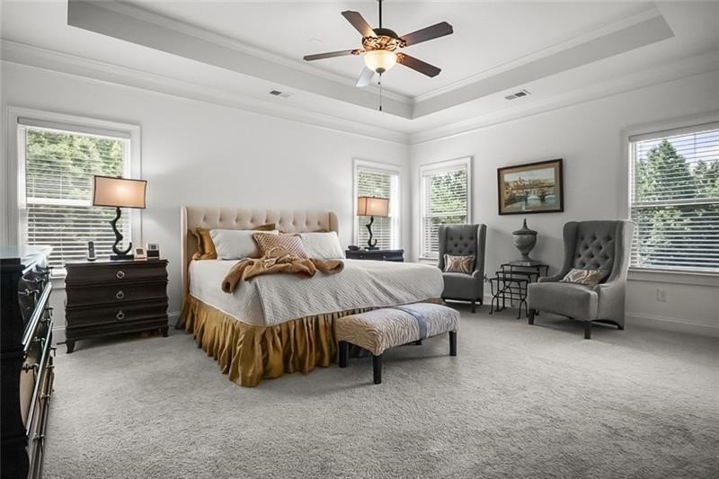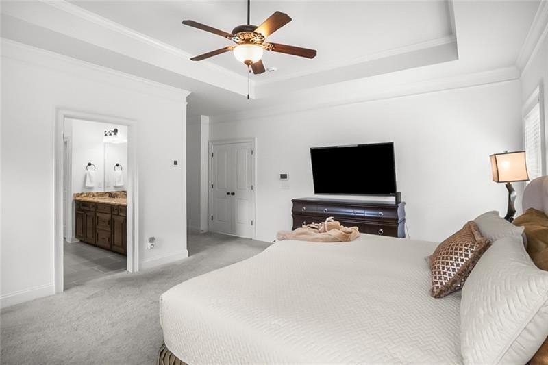 Upstairs features the private master suite with coffered ceiling, ensuite bathroom with