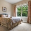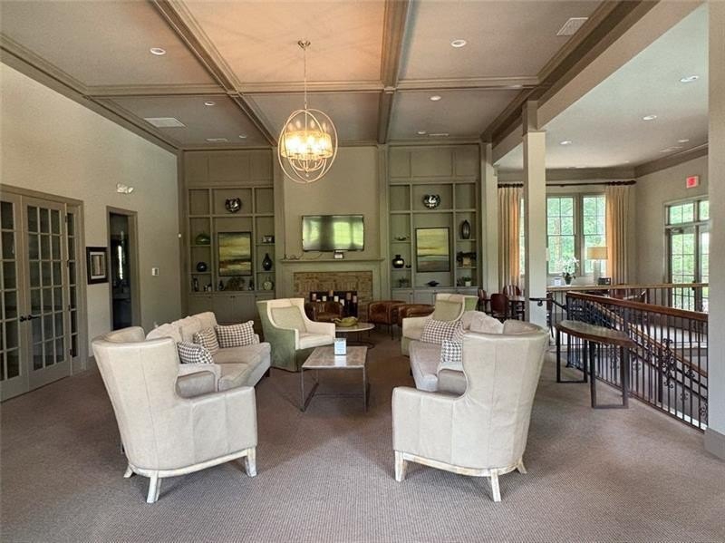 beamed ceiling, fireplace, expansive bay of windows and built-in bookcases. There is