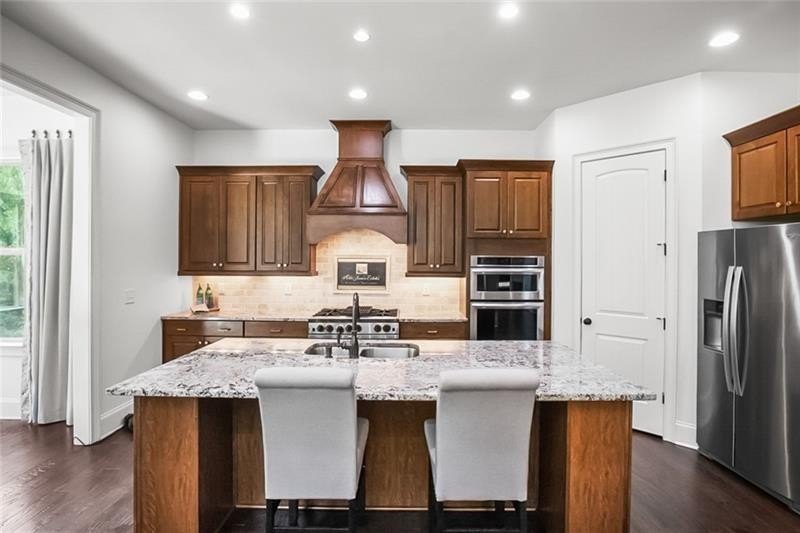 drawers, double ovens and a professional 6 burner gas range. Open to the kitchen is a