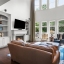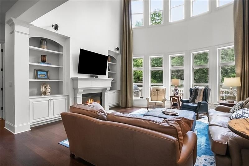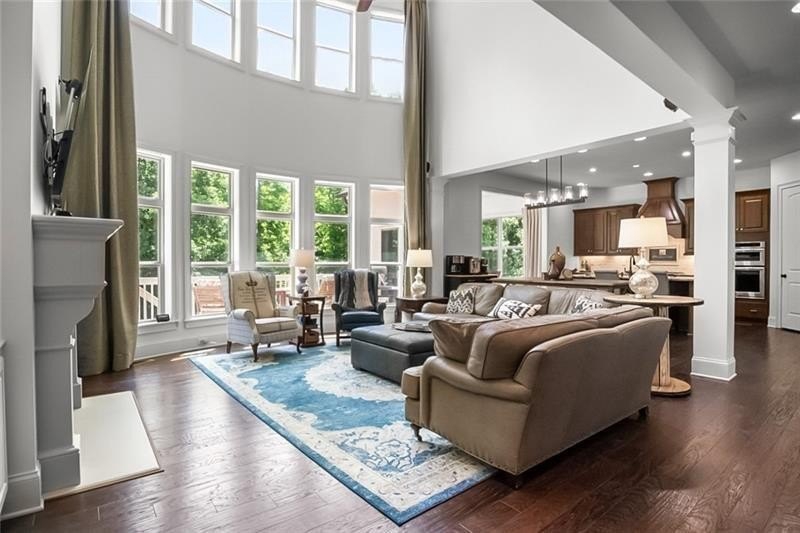 room and living room with fireplace. The floor plan opens to a 2-story family room with