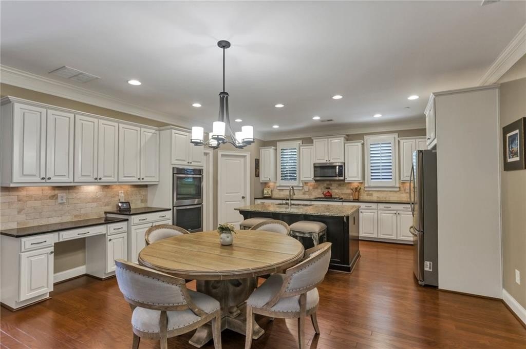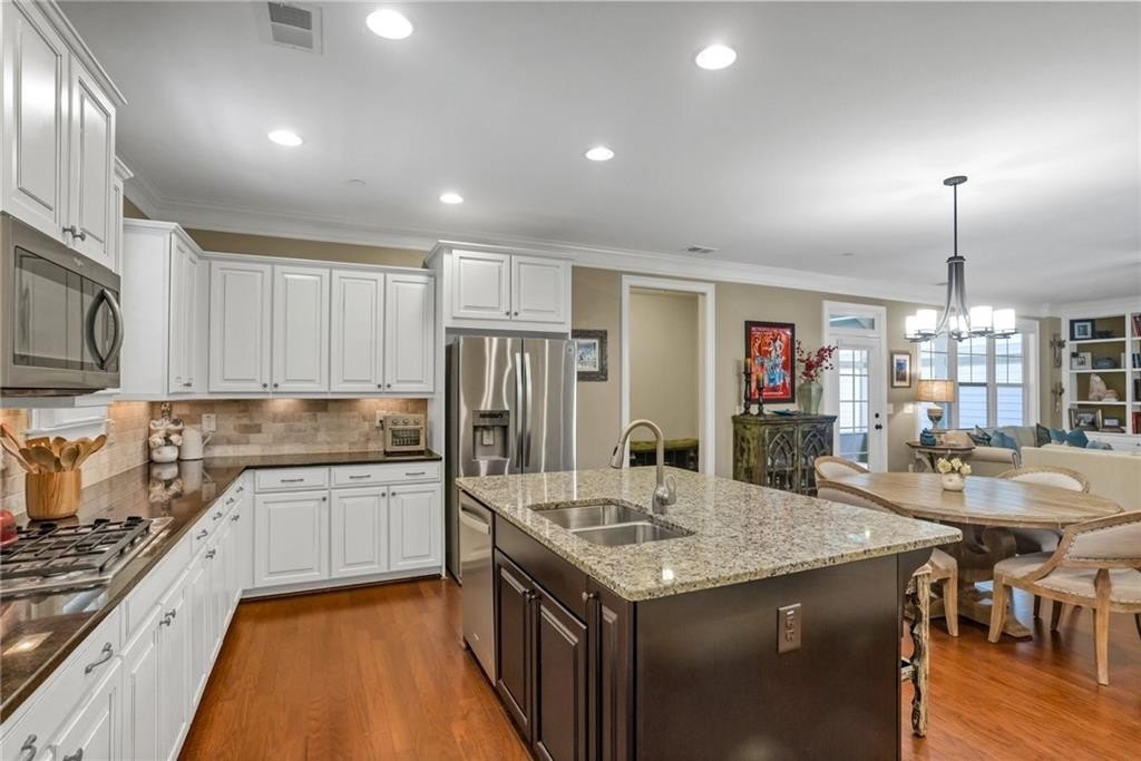 Inside, sophistication meets comfort. Rich hardwood floors and exquisite architectural details set the tone from the moment you arrive. The chef’s kitchen is a true centerpiece, featuring an oversized island, granite countertops, custom tile backsplash, premium stainless-steel appliances, and a generous breakfast area that seamlessly flows into the fireside family room with custom built-ins—perfect for both intimate evenings and grand entertaining.