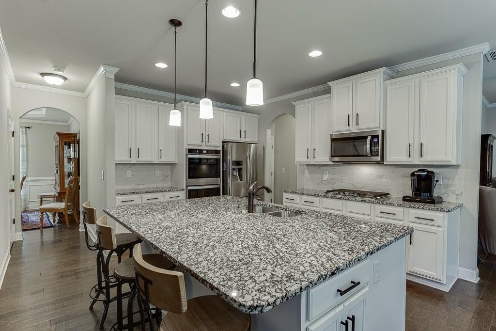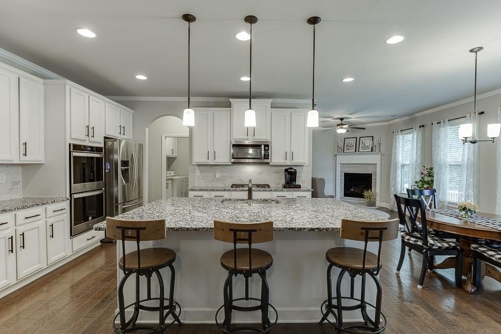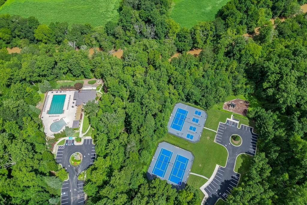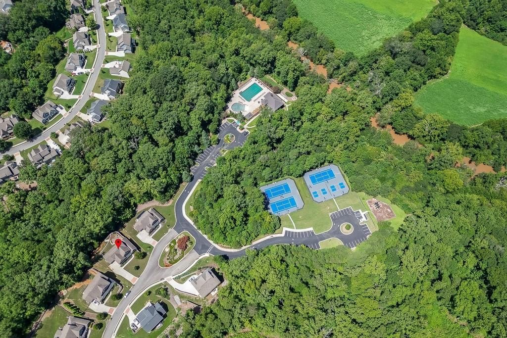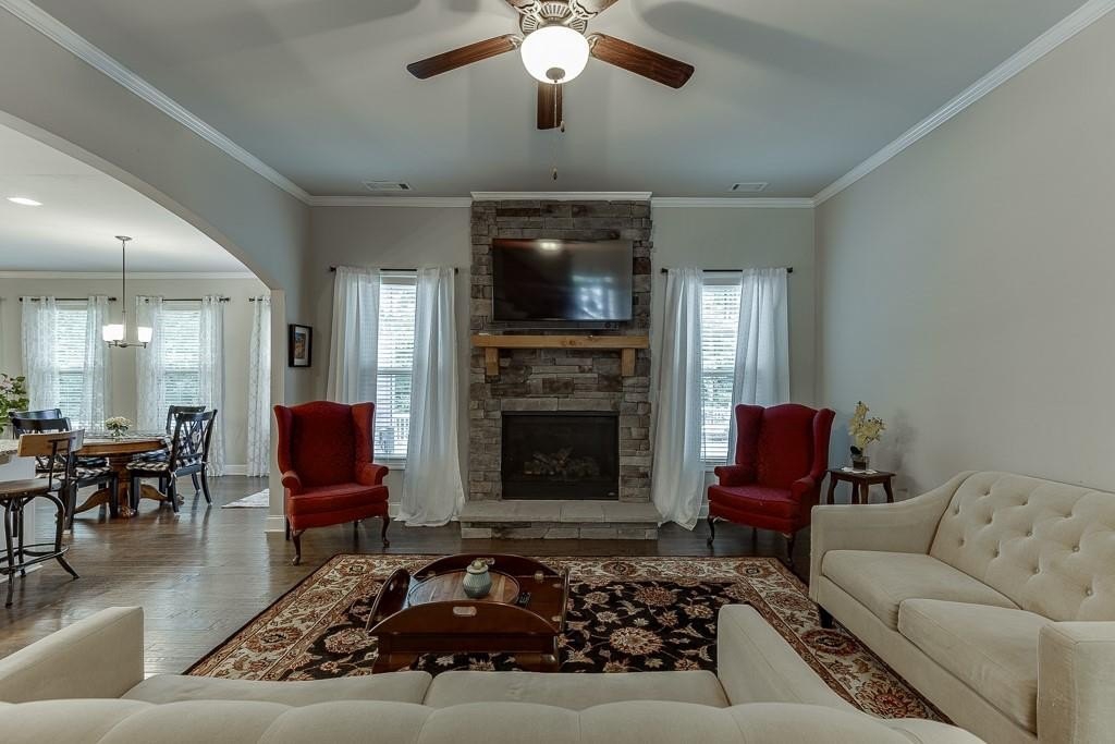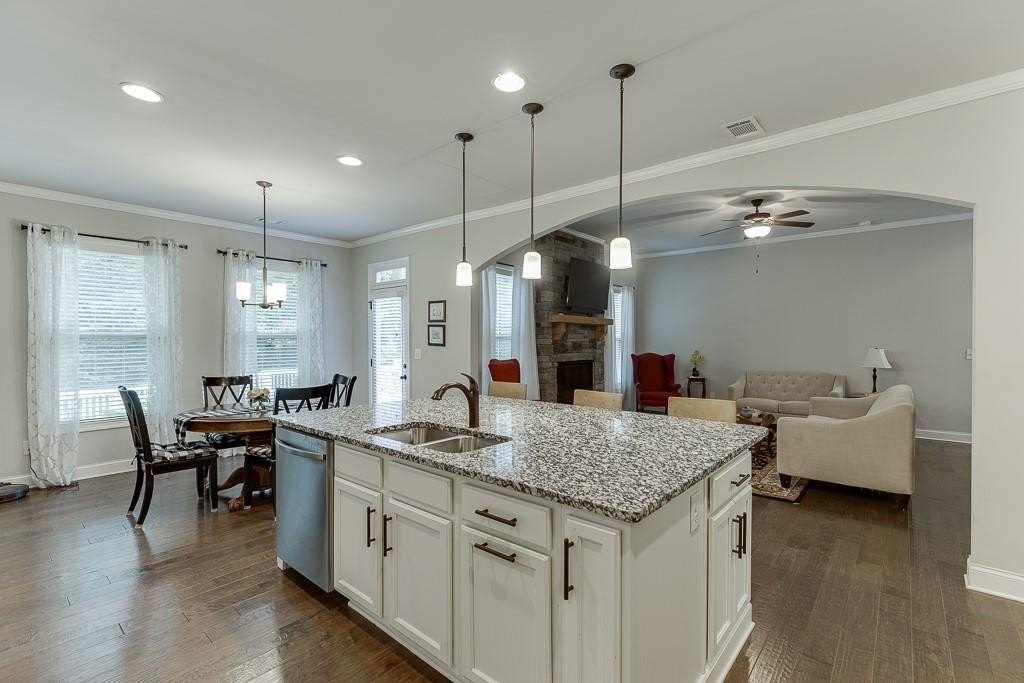 This striking Master on the Main home is perfectly situated on a lovely lot with a beautiful, manicured yard and perfectly level driveway. The exceptional community amenities in River Rock cater to every interest, from a stone fire pit and walking trail along the Etowah River to a large lap pool, kids' splash pad, tennis and pickleball courts, a playground and a well-appointed clubhouse for gatherings and meetings. Step inside and discover a home designed for peace and comfort. The formal dining room sets a sophisticated tone, while the spacious great room, with its rustic stone fireplace, open-concept layout, and beautiful views of the peaceful woods creates a welcoming feeling. The gourmet kitchen is a chef’s dream, featuring a massive island, double ovens, and a huge walk-in pantry perfect for creating memorable meals and entertaining guests. Natural light floods the home through a large bank of windows, offering a cheerful, uplifting atmosphere and serene views of the wooded backyard. Step out onto the expansive paver patio where you can relax, read, or listen to the sounds of nature. This tranquil space is a bird watcher's paradise and offers a welcome escape from your long day.