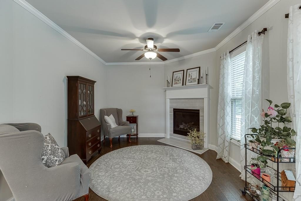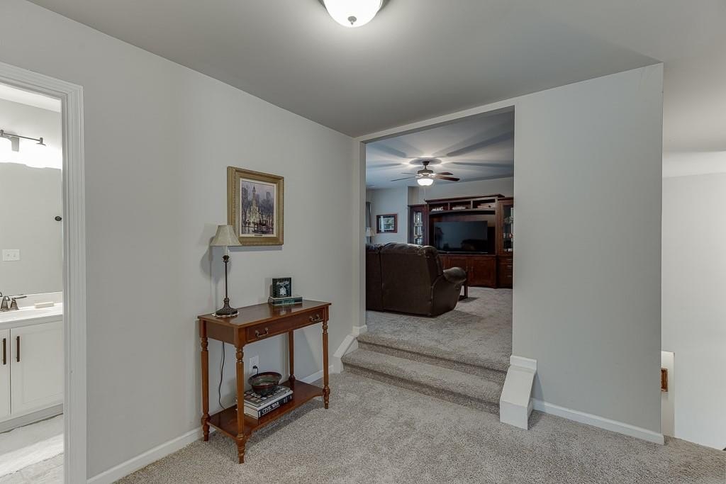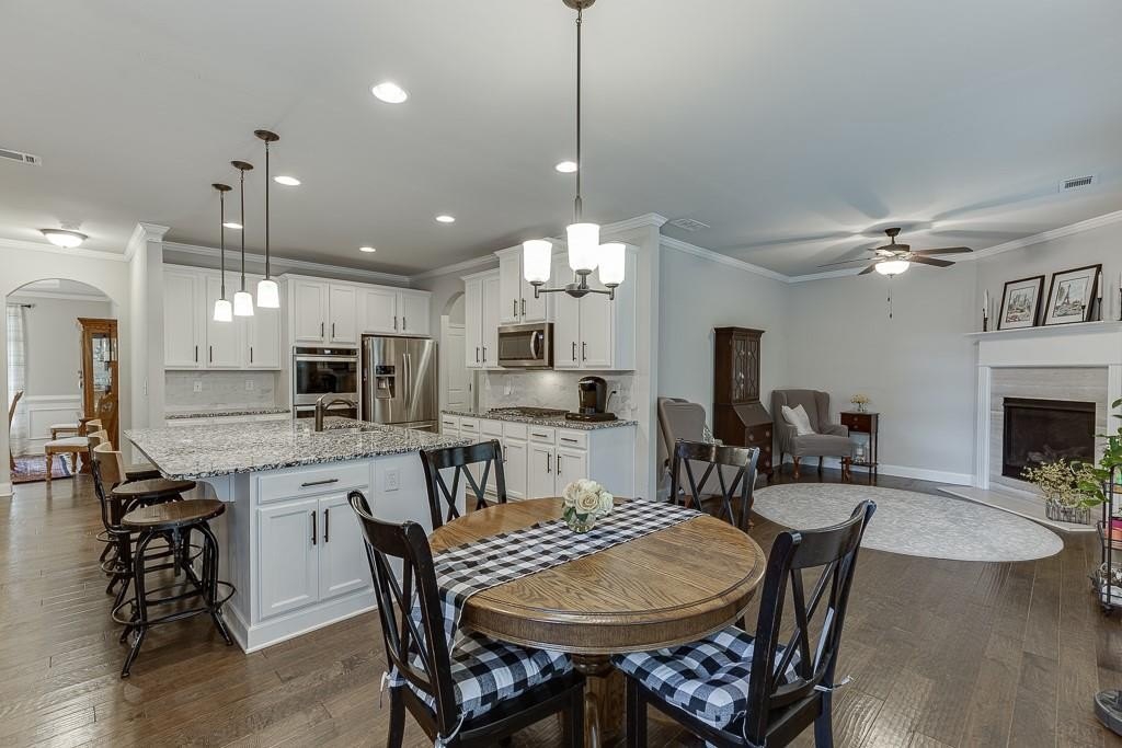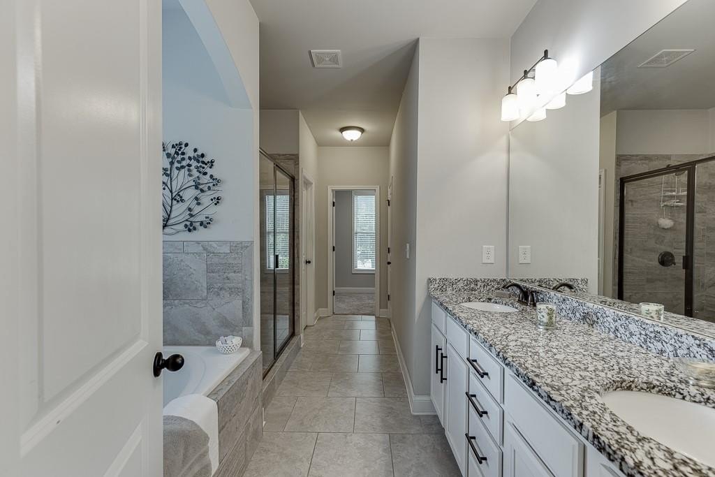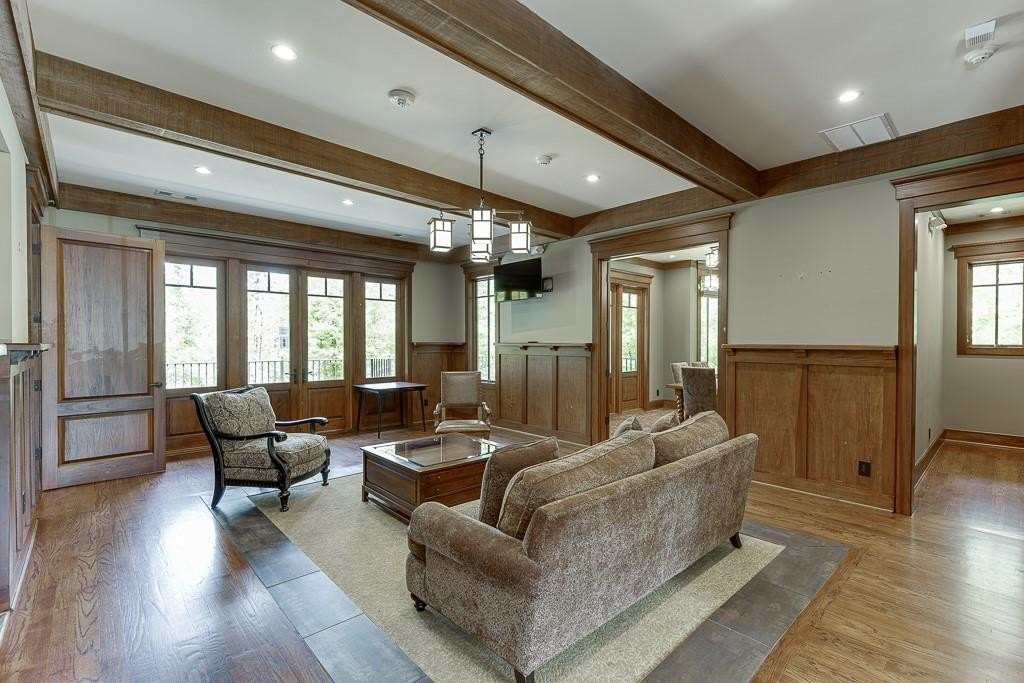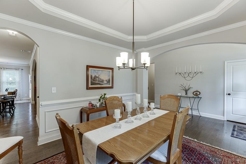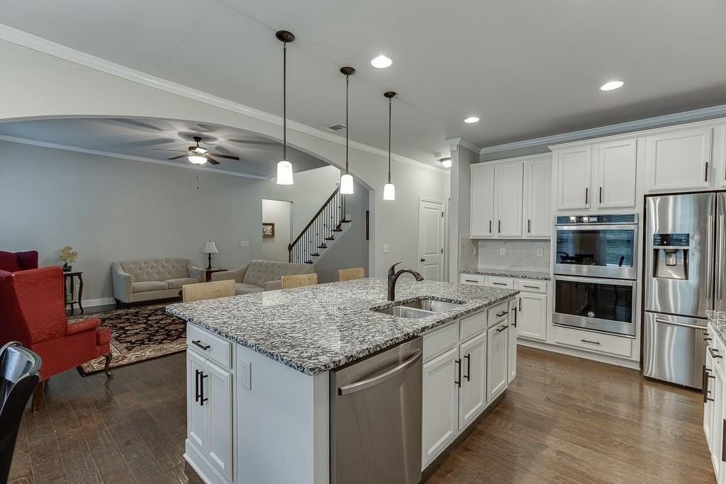 This striking Master on the Main home is perfectly situated on a lovely lot with a beautiful, manicured yard and perfectly level driveway. The exceptional community amenities in River Rock cater to every interest, from a stone fire pit and walking trail along the Etowah River to a large lap pool, kids' splash pad, tennis and pickleball courts, a playground and a well-appointed clubhouse for gatherings and meetings. Step inside and discover a home designed for peace and comfort. The formal dining room sets a sophisticated tone, while the spacious great room, with its rustic stone fireplace, open-concept layout, and beautiful views of the peaceful woods creates a welcoming feeling. The gourmet kitchen is a chef’s dream, featuring a massive island, double ovens, and a huge walk-in pantry perfect for creating memorable meals and entertaining guests. Natural light floods the home through a large bank of windows, offering a cheerful, uplifting atmosphere and serene views of the wooded backyard. Step out onto the expansive paver patio where you can relax, read, or listen to the sounds of nature. This tranquil space is a bird watcher's paradise and offers a welcome escape from your long day.