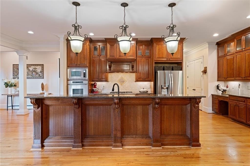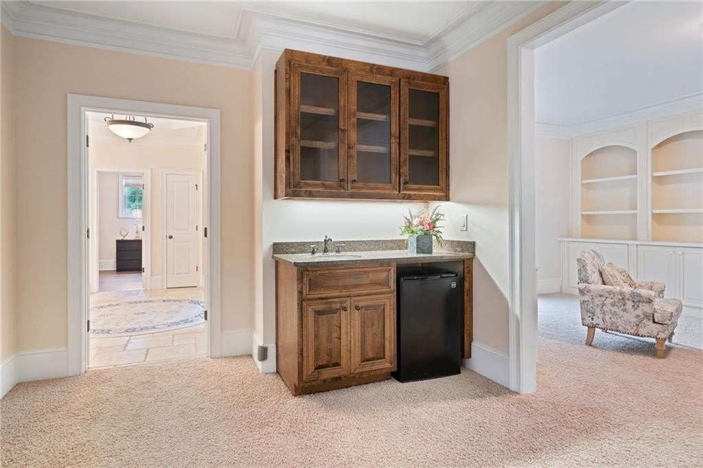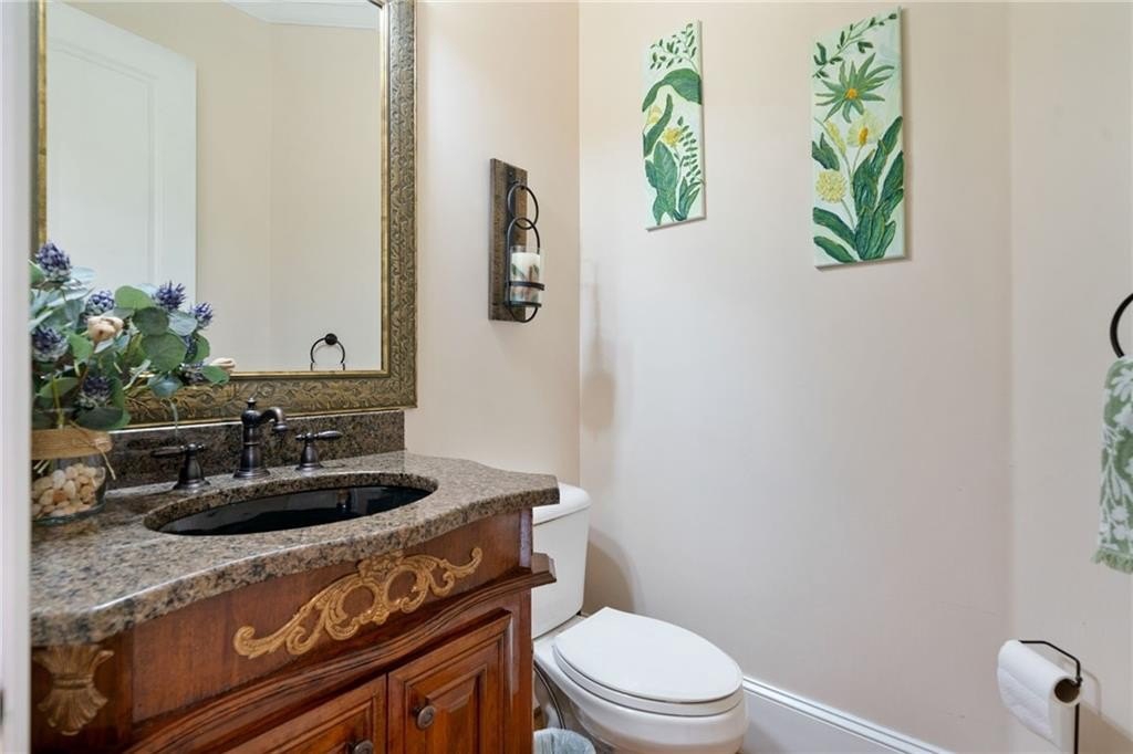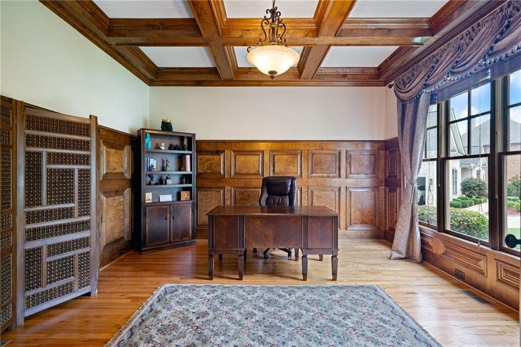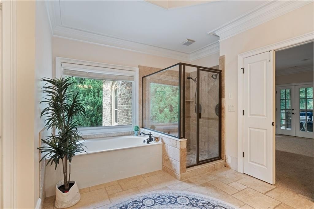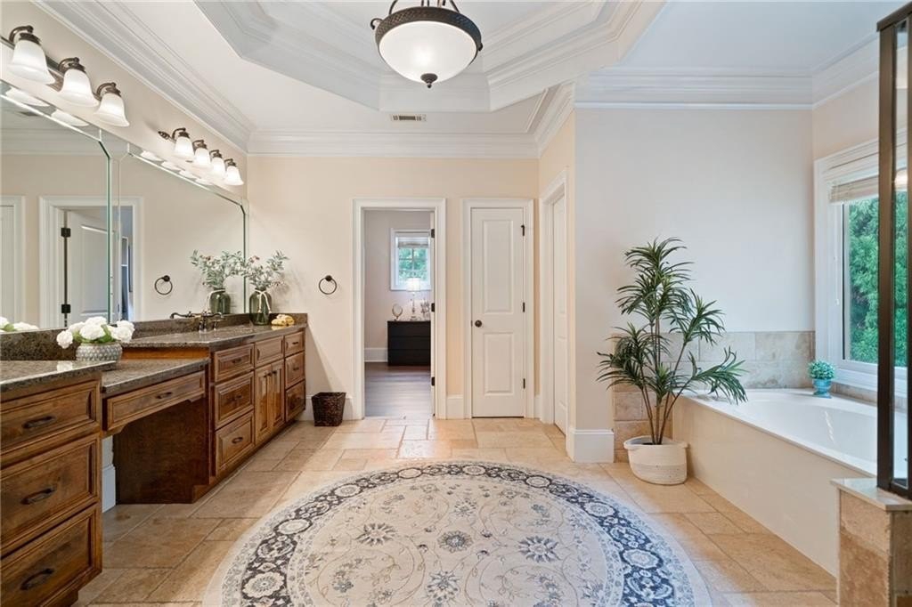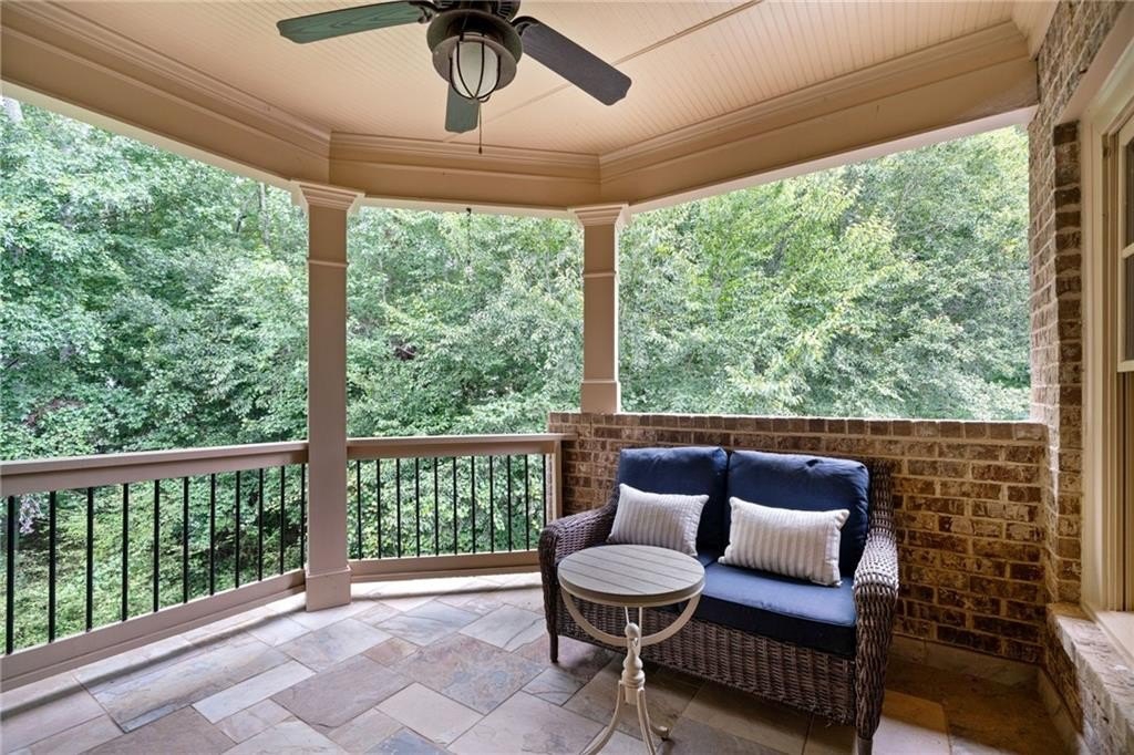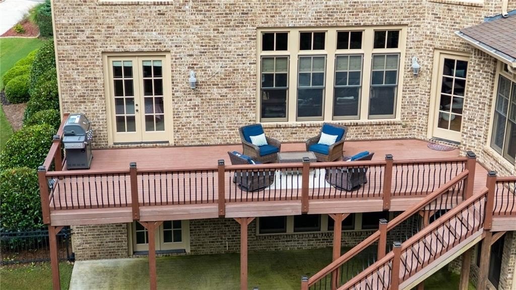 Welcome to this breathtaking FOUR-SIDED BRICK, covered natural stone entryway residence where timeless luxury and elegant design greet you from the moment you arrive. Located on a cul-de-sac in the prestigious gated TURNBERRY community, with the most HIGHLY RATED SCHOOLS and LOW TAX Forsyth Co. Walking into a wide foyer to be greeted with the full natural light that this home has to offer. The main floor showcases rich hardwood flooring, private home office with wood paneling and coffered ceiling , the family room impresses with its dramatic coffered ceiling, built-in custom cabinetry and the primary fireplace offering a warm and inviting space for relaxation, open to the great room with its own fireplace and the views of the massive backyard. Soaring 11- to 12-foot ceilings, and exquisite CROWN MOLDING throughout. The GOURMET KITCHEN is a showpiece, featuring ceiling-height cabinetry that blends style and function, while adjacent to formal dining room comfortably seats 12+ guests-perfect for hosting unforgettable gatherings. The main level is complete with a beautifully appointed in-law suite with its own private ensuite bathroom. Step outside to an extra-large Trex deck overlooking a fully leveled, professionally landscaped 100% PRIVATE almost 1 acre backyard-an ideal setting for outdoor entertaining or peaceful retreat. Beneath it all lies a massive unfinished basement with high ceilings and open space, ready to be transformed into your dream gym, theater, game room, or additional living suite. Upstairs, the home continues its theme of grandeur with 10- to 11-foot ceilings, detailed crown molding, and a BONUS ROOM , MASSIVE MASTER SUITE , and three more bedrooms, each with its OWN FULL ENSUITE BATHROOM, ensuring comfort and privacy for all. The master suite is a true sanctuary, generously sized with a cozy seating area anchored by a FIREPLACE, a PRIVATE BALCONY for morning coffee or evening stargazing, and a spa-inspired bathroom adorned with NATURAL STONE finishes that evoke tranquility and indulgence. HIS AND HERS closets offer boutique-style storage, completing a retreat that redefines luxury living. Completing this exceptional home are 3 covered garage spaces Every inch of this residence has been thoughtfully crafted to deliver refined elegance, and timeless comfort.