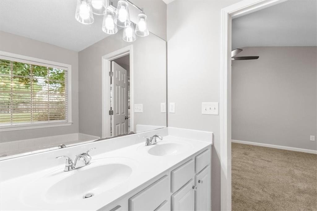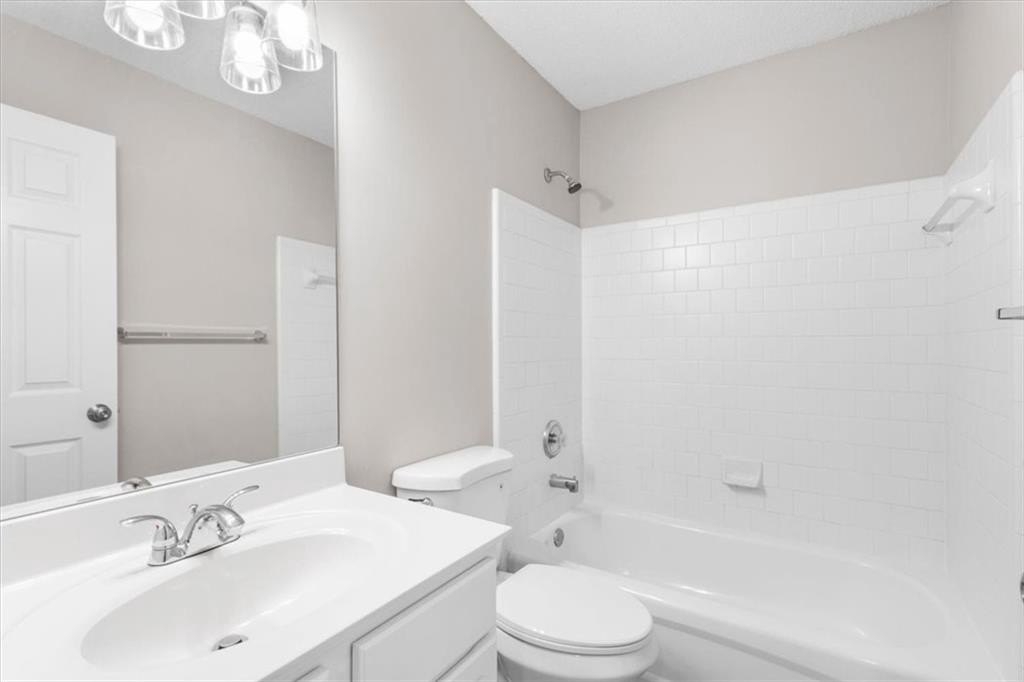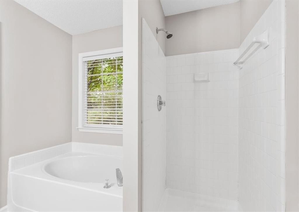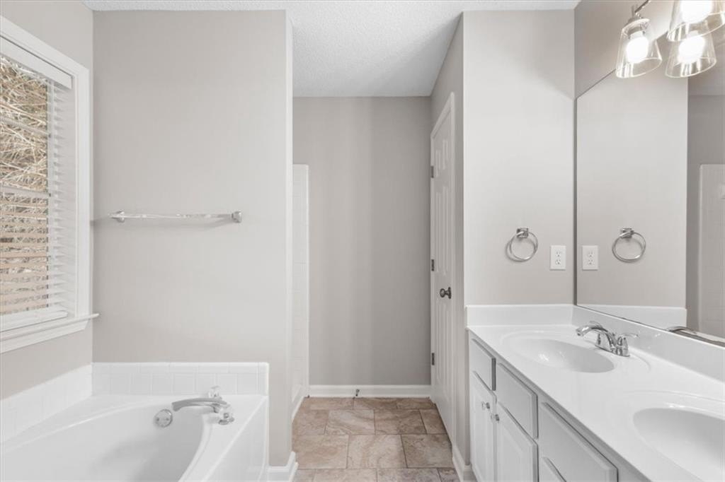 Step inside to find a spacious family room that flows into the eat-in kitchen, complete with white appliances and plenty of space for gatherings. The primary suite offers a double vanity, separate tub and shower, and a generous layout for comfort and convenience. Two additional bedrooms provide ample space for family, guests, or a home office.