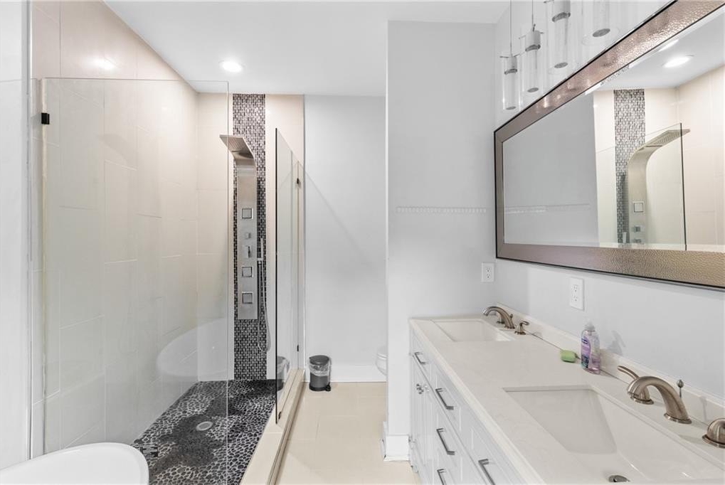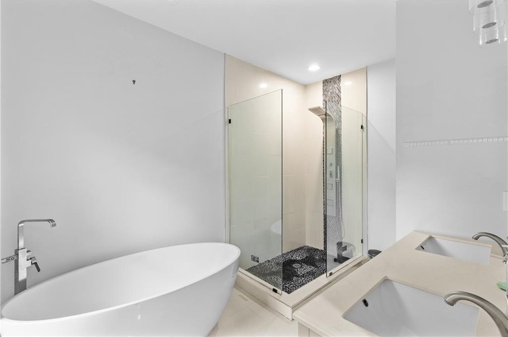 The heart of the home is a fully reimagined kitchen, complete with sleek new cabinets, quartz countertops, a touchless faucet, and premium Samsung Elite appliances. Every bath feels like a private spa with custom vanities, updated fixtures, a freestanding soaking tub, and luxurious shower spa systems.