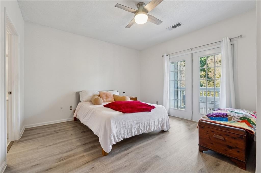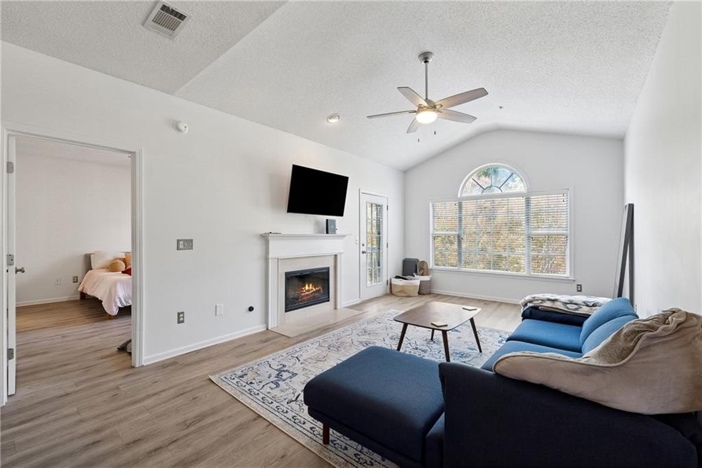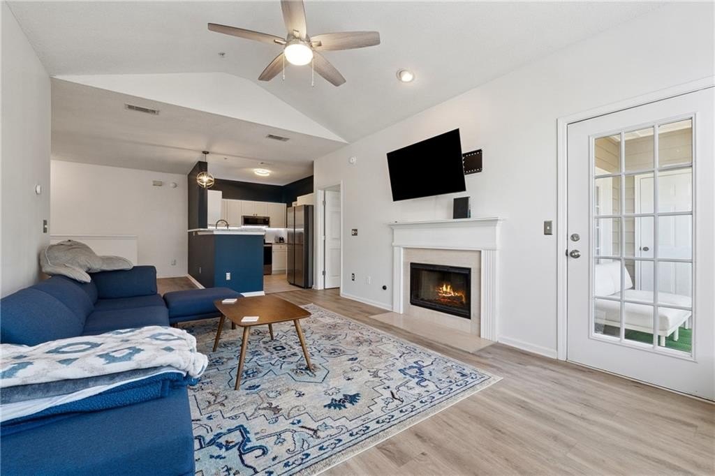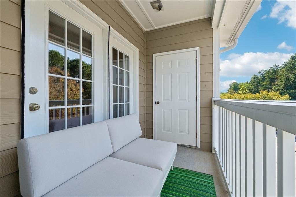 Welcome to your DREAM home nestled in the serene, gated Woodlands At Webb Bridge community. This beautifully updated condo sits in an unbeatable location, just steps from DOWNTOWN Alpharetta and AVALON. Enjoy upscale living at an affordable price in one of North Fulton’s most sought-after neighborhoods! Thoughtful split-bedroom floor plan ensures privacy, with a PRIMARY suite featuring custom walk-in closets and romantic French doors opening to a private balcony. Newly installed hardwood-like floors, quartzite countertops, stylish backsplash, and stainless steel appliances create a sophisticated and inviting atmosphere. A NEWER HVAC unit and roof add peace of mind. The fireside family room flows seamlessly into an open-concept dining area and a sleek white kitchen with a breakfast bar, perfect for entertaining guests or COZY nights in. Savor morning coffee on the covered front porch or unwind on the PRIVATE balcony with tranquil wooded views. Additional storage off the patio keeps things organized.