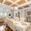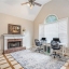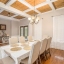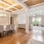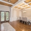 Step up to the full-length covered front porch and through the double-door entryway, where you are greeted by a soaring vaulted foyer with beamed ceilings and hardwood floors throughout. The formal dining room, with space for up to 12 guests, is accented by wood beams for a warm and elegant touch.