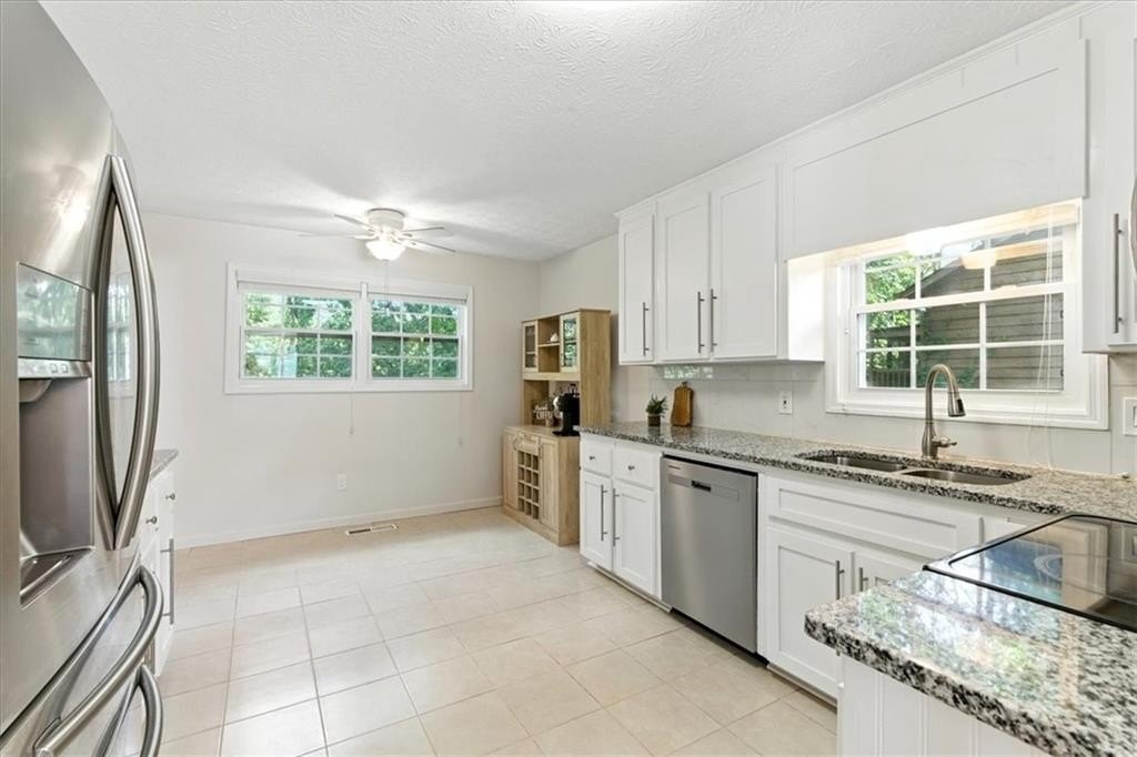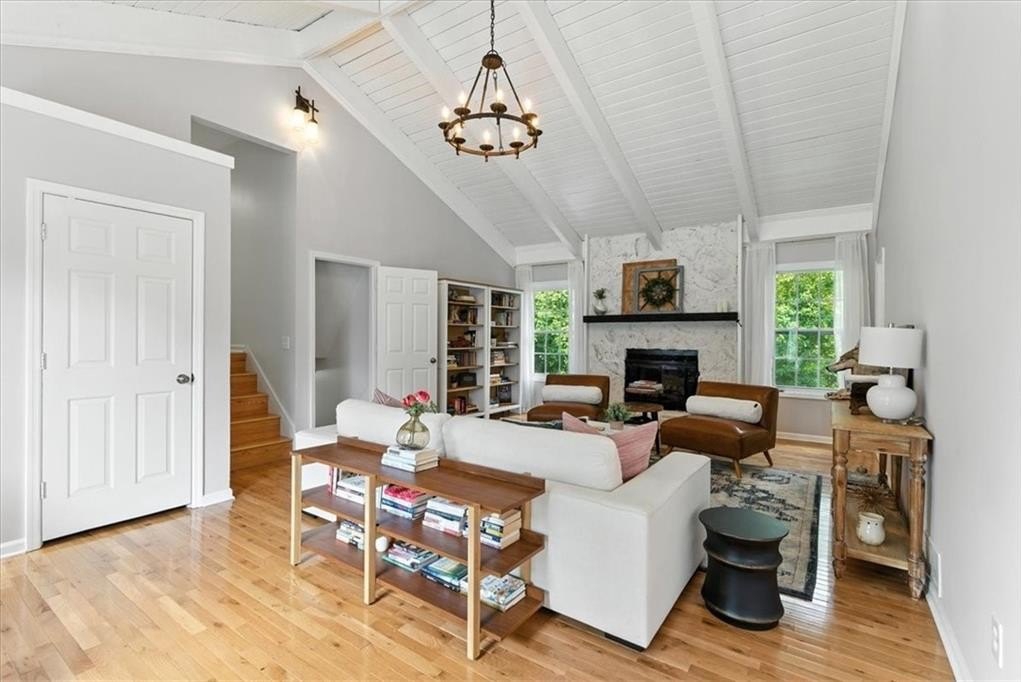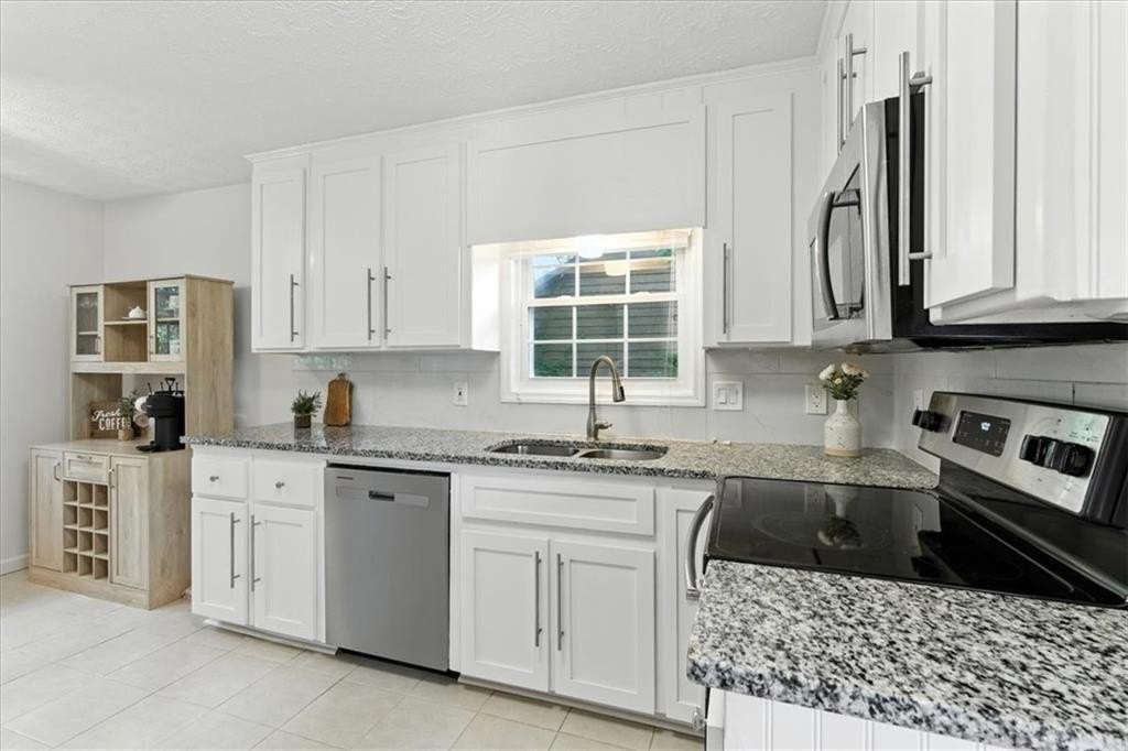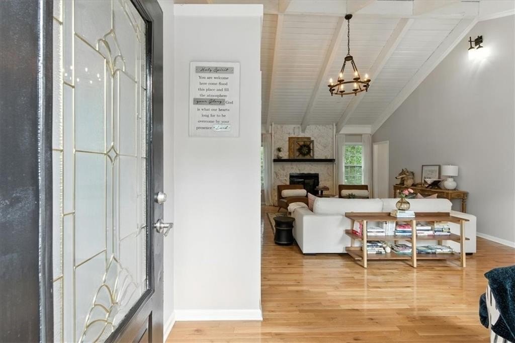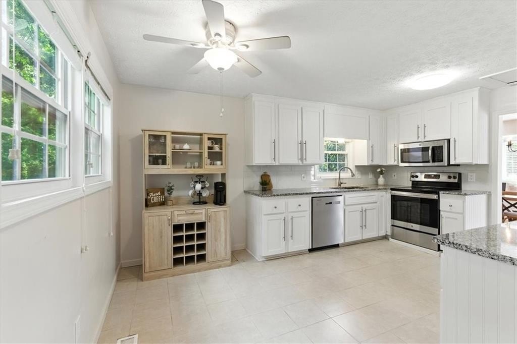 Upon entering, you are greeted by an open main living area featuring soaring high ceilings that create an expansive and airy atmosphere. The well-designed layout seamlessly connects the living, dining, and kitchen areas, making it perfect for entertaining. The kitchen features new stainless steel appliances and plenty of counter space for all your culinary needs. Large, newer windows flood the space with natural light, highlighting the fresh paint and elegant finishes.