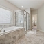 The oversized owner’s suite is tucked away for privacy and includes direct access to the covered back patio, a luxurious en-suite bath with double vanities, a tiled shower, soaking tub, and a generous walk-in closet. Two secondary bedrooms share a convenient Jack-and-Jill bathroom on the opposite side of the home.