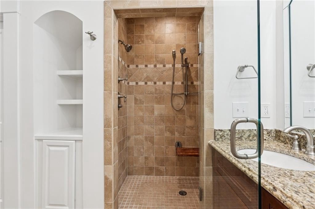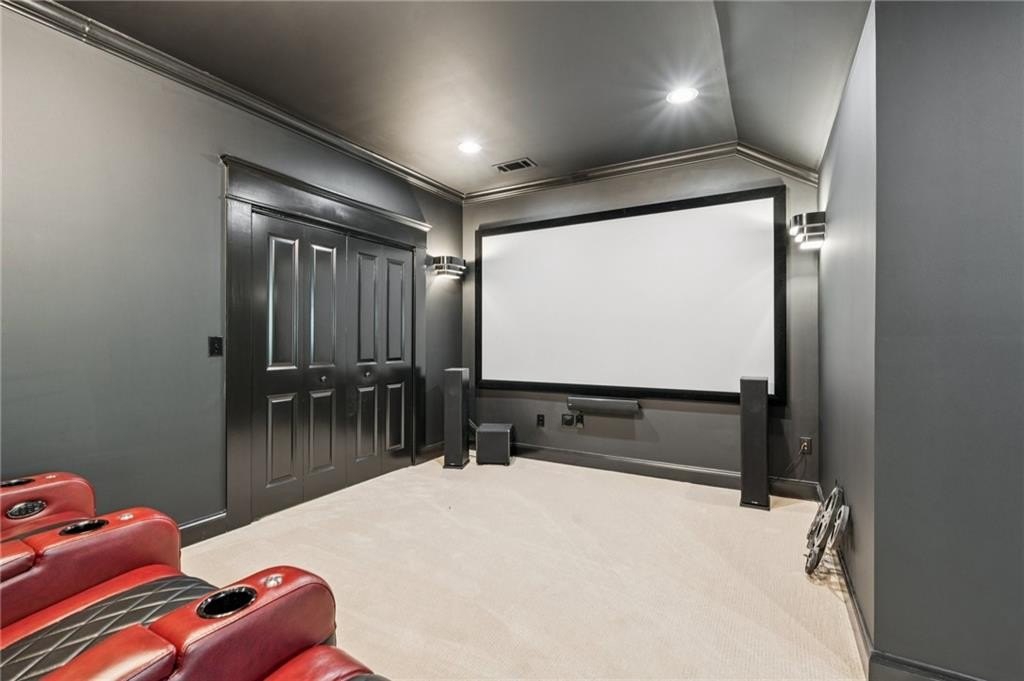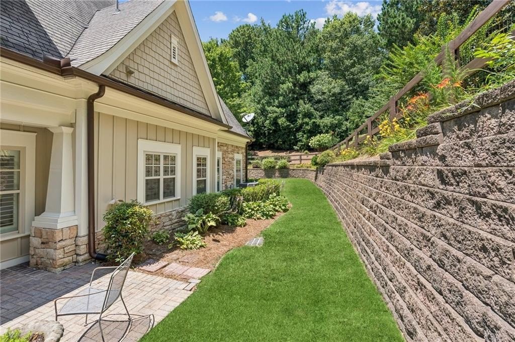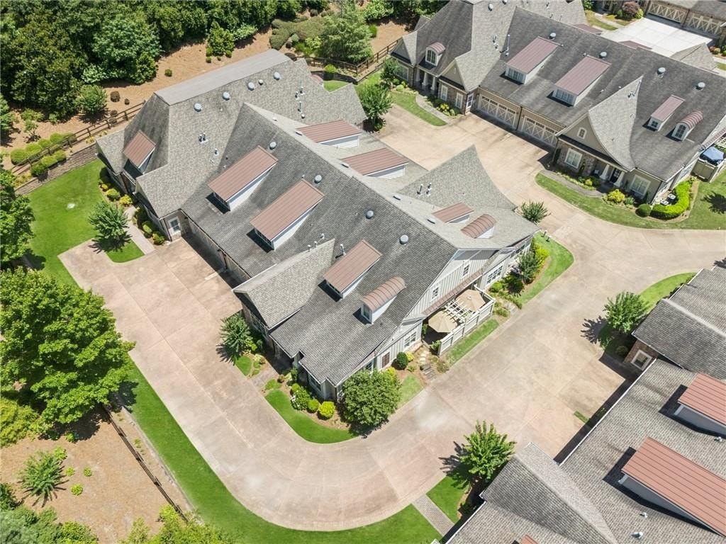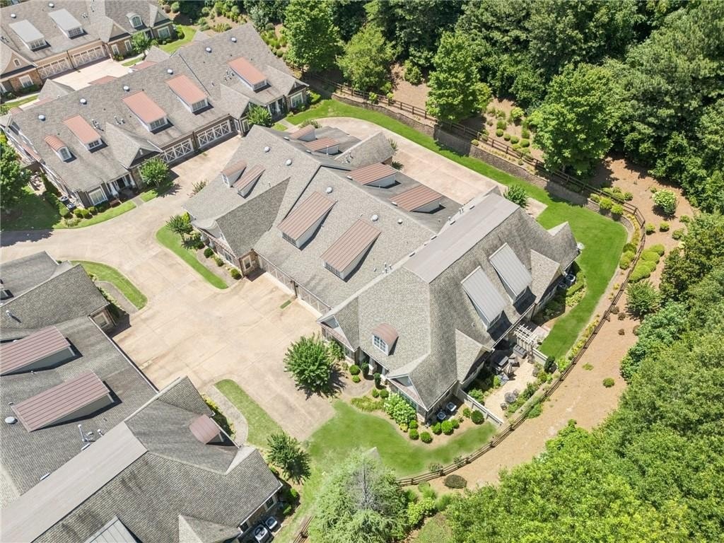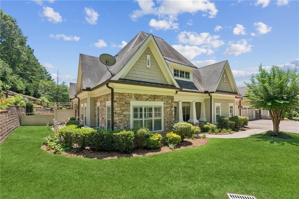Discover refined living in this impeccably maintained 3 bedroom, 3.5 bath home, thoughtfully designed space. Located in the highly desirable Wellstone adult community in Cumming, this attached condominium lives like a single-family home and offers premium finishes, convenience, and versatility at every turn. Best location in neighborhood with extreme privacy and green space. Step into a bright, open floor-plan with rich hardwood floors, extensive trim detail, and a coffered ceiling that sets the tone in the spacious fireside living room. The chef’s kitchen is an entertainer’s dream, featuring granite countertops, tile backsplash, stainless steel appliances, a center island, pantry with slide-out shelves, and view to the living and dining areas. The main level double master suites are a true retreat, complete with a spa-like bath, oversized double vanities, frameless glass showers with multiple shower heads, soaking tub, and two custom walk-in closets each. Upstairs, you'll find a full bath, a bonus flex space, and a private home theater – already outfitted and ready for your movie nights. The home also includes a rare stair lift for accessibility, custom window shutters throughout, generous closets, and a laundry room with sink and storage. Enjoy the covered front porch, backyard patio, and zero-maintenance exterior thanks to HOA-managed landscaping. The two-car garage, newer mechanicals, and access to community clubhouse, fitness center, and pool make this a truly low-maintenance, upscale lifestyle. The 2nd floor bedroom is ready for gym or seller will replace with carpet to match and remove mirrors.
