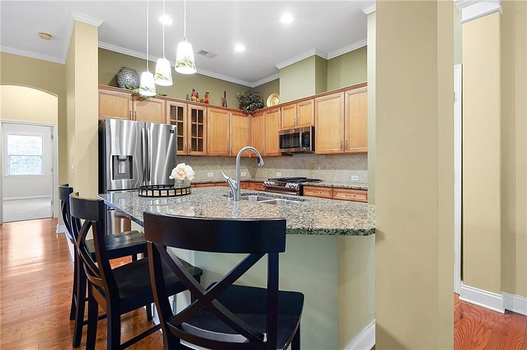Spacious & Open Floor Plan- this end-unit offers generous living space designed for both comfort and entertaining. 2 large bedrooms and 2.5 baths, giving you privacy and flexibility. Open-concept kitchen featuring stainless steel appliances, a large island, granite countertops, and a stylish tile backsplash. Pull out drawers in cabinets for organizing and accessibility. Stunning hardwood floors, wrought-iron stair balusters, upgraded lighting & fixtures.