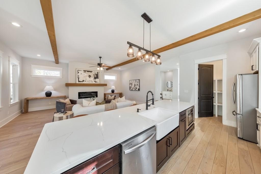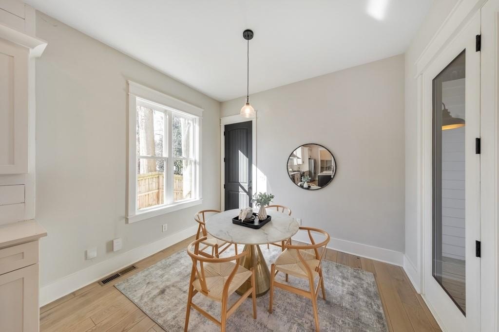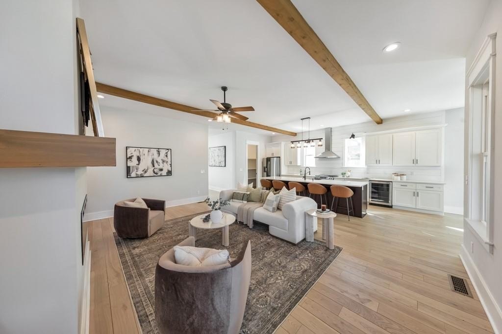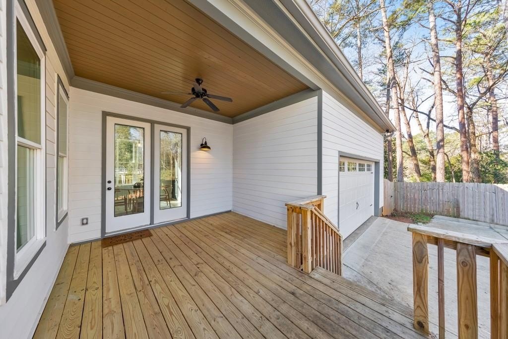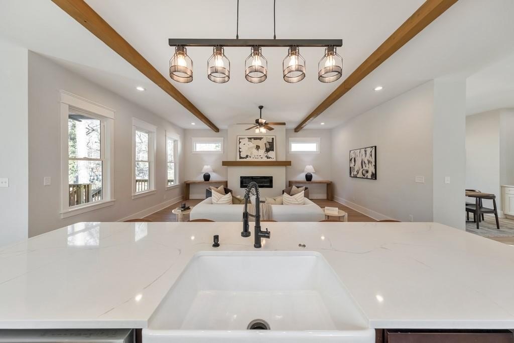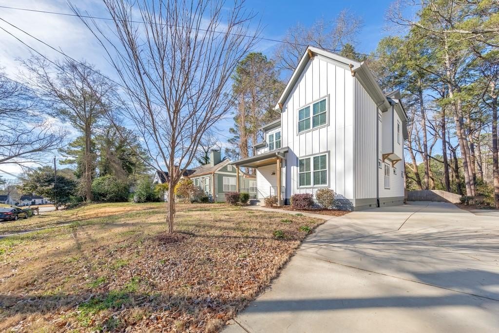 Welcome to this stunning modern retreat in the heart of Atlanta! Built in 2021, this exceptional 4-bedroom, 3.5-bathroom residence showcases impeccable craftsmanship and high-end designer finishes at every turn. A welcoming covered front porch leads into a dramatic two-story foyer. Entertain in style in the elegant dining room, complete with custom built-in bookshelves and a sleek wet bar, or relax in the fireside family room highlighted by beamed ceilings and expansive windows. The chef's kitchen is a showstopper with a large center island for gathering, stone countertops, crisp white cabinetry, a sunny breakfast room, and a walk-in pantry offering abundant storage. Upstairs, a spacious loft provides the perfect flex space for a lounge, home office, or play area. The luxurious primary suite impresses with tray ceilings and a spa-inspired ensuite featuring dual vanities, a soaking tub, and a double-head walk-in shower, plus an oversized custom closet with built-in storage. Two generously sized secondary bedrooms share a beautifully appointed full bath, and the convenient upper-level laundry room completes the floor. Step outside to enjoy year-round living on the covered side porch or gather with friends around the firepit in the large, fenced backyard. An attached two-car garage adds everyday ease. Perfectly positioned near I-20 and I-285, John A. White Golf Course, and a wealth of premier shopping, dining, and entertainment, this stunning home blends modern luxury with unbeatable Atlanta convenience.