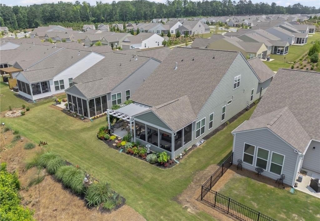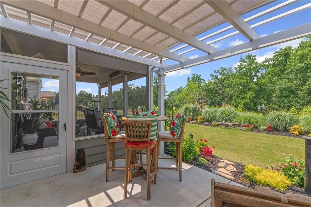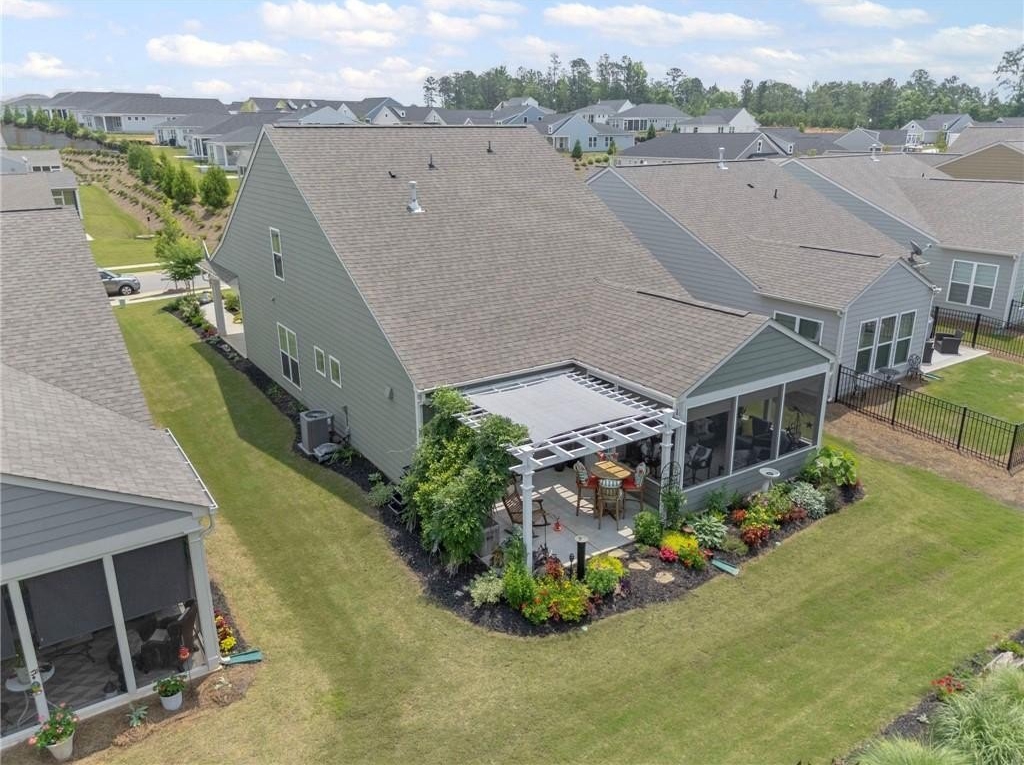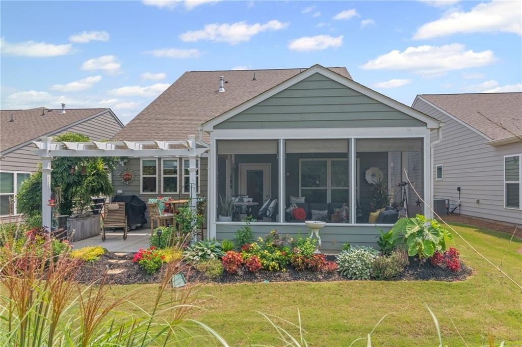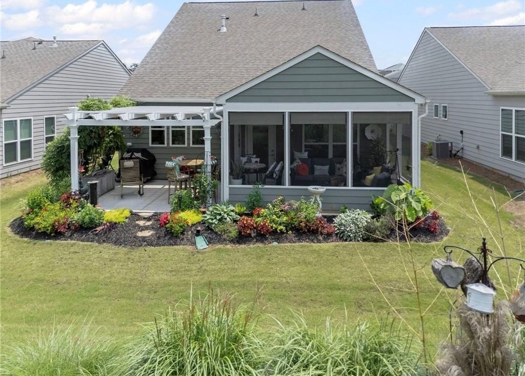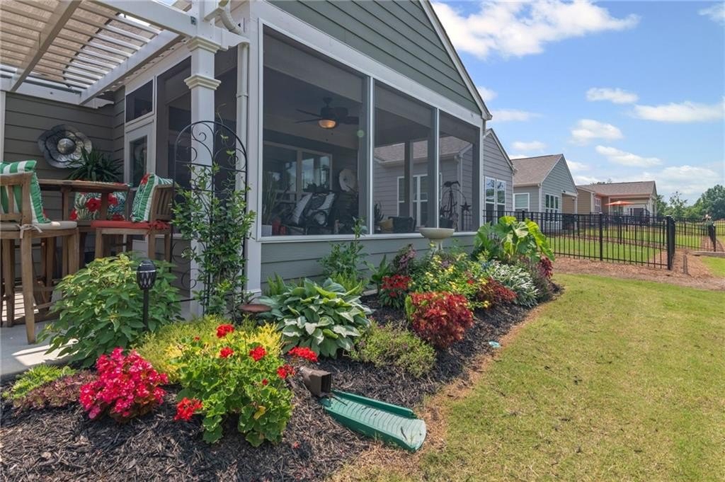 Step outside to a screened in lanai complete with its own fan and custom blinds — an ideal spot for morning coffee or evening relaxation. Beyond, a pergola on a solid slab with security lighting offers both charm and peace of mind. Perennial gardens in the front and back yards provide vibrant color and greenery with minimal upkeep.