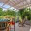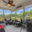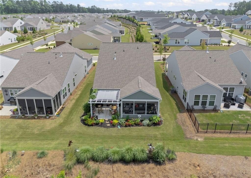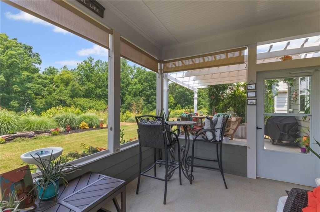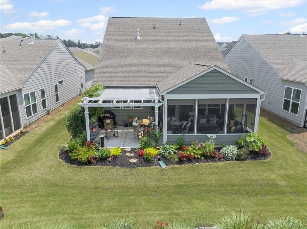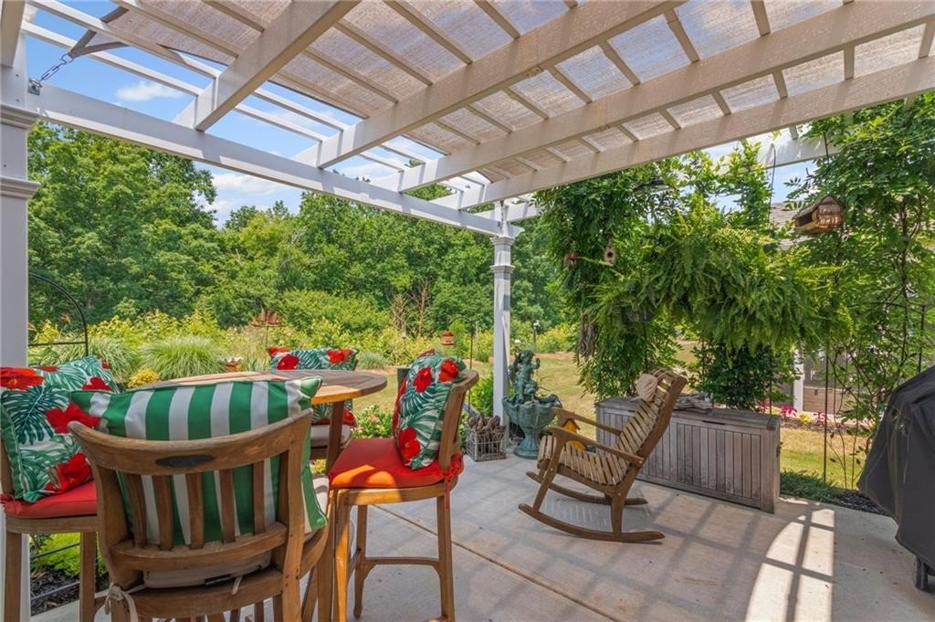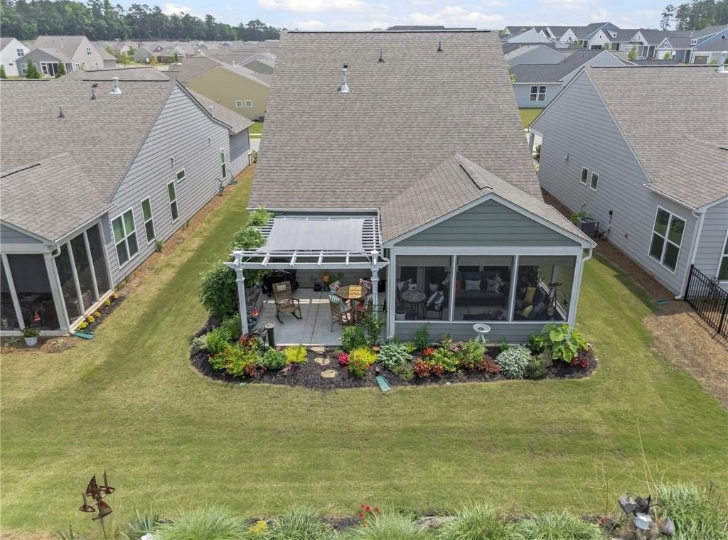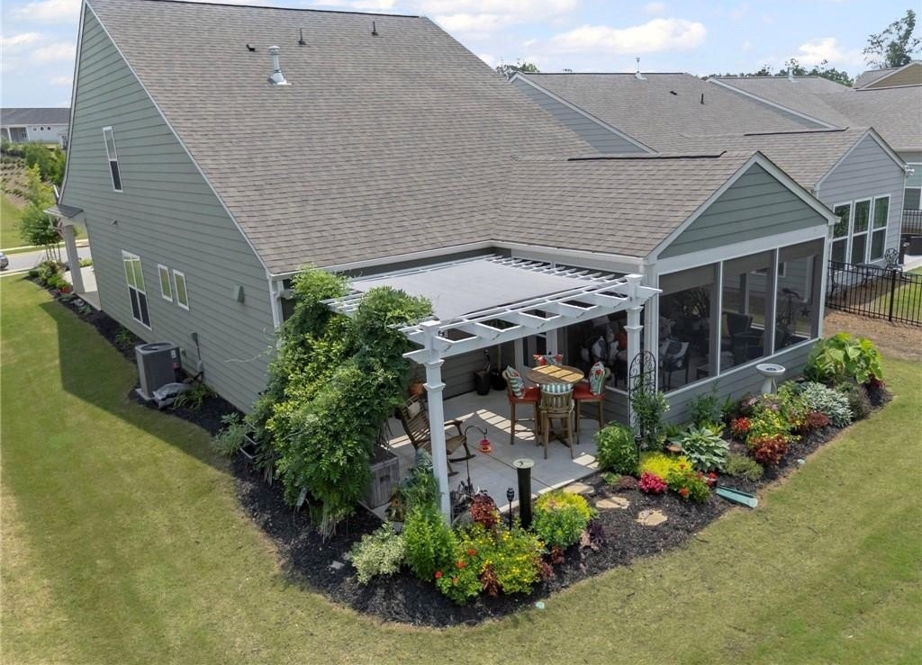 Step outside to a screened in lanai complete with its own fan and custom blinds — an ideal spot for morning coffee or evening relaxation. Beyond, a pergola on a solid slab with security lighting offers both charm and peace of mind. Perennial gardens in the front and back yards provide vibrant color and greenery with minimal upkeep.