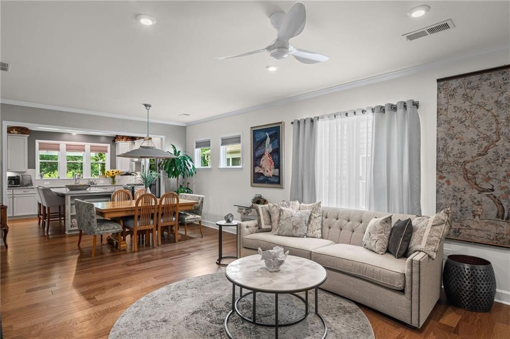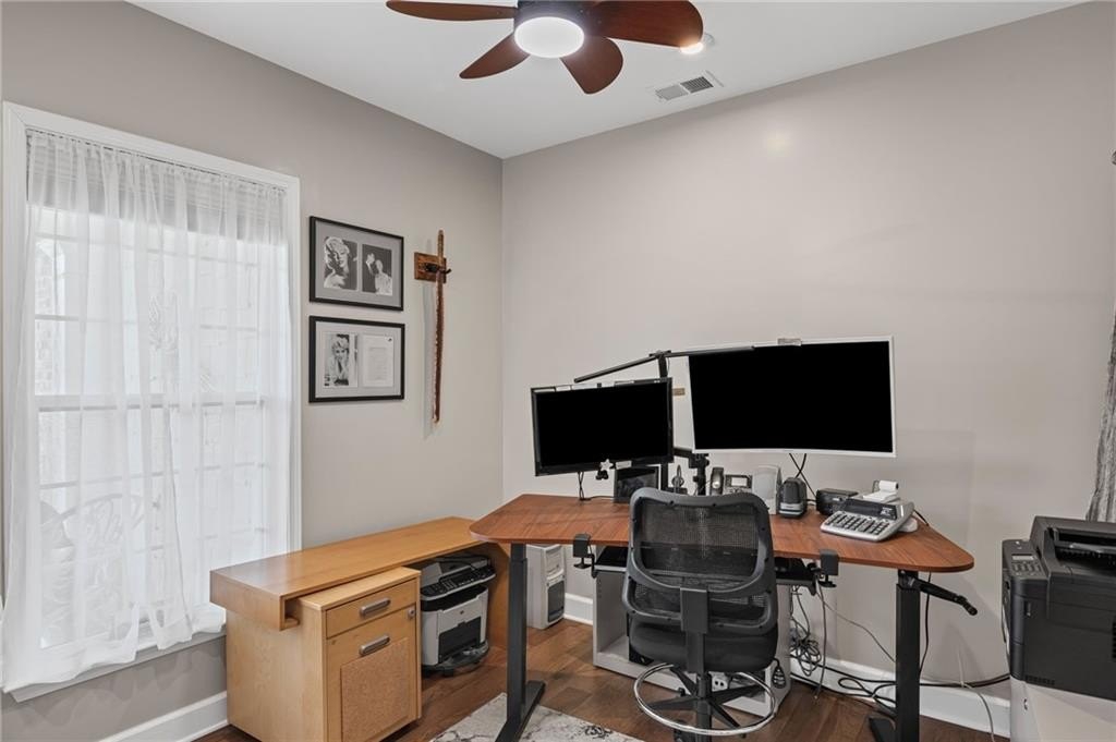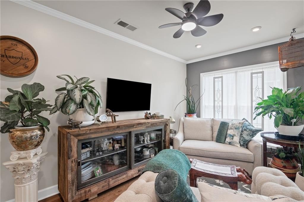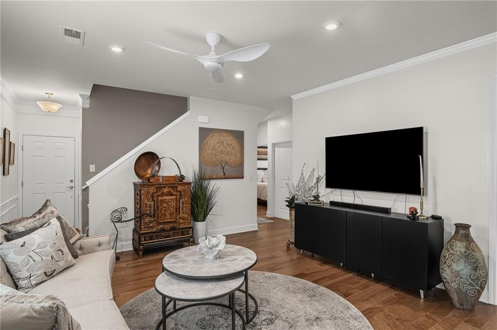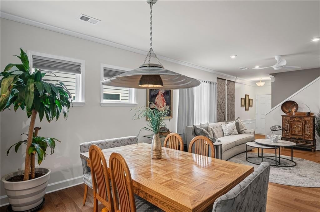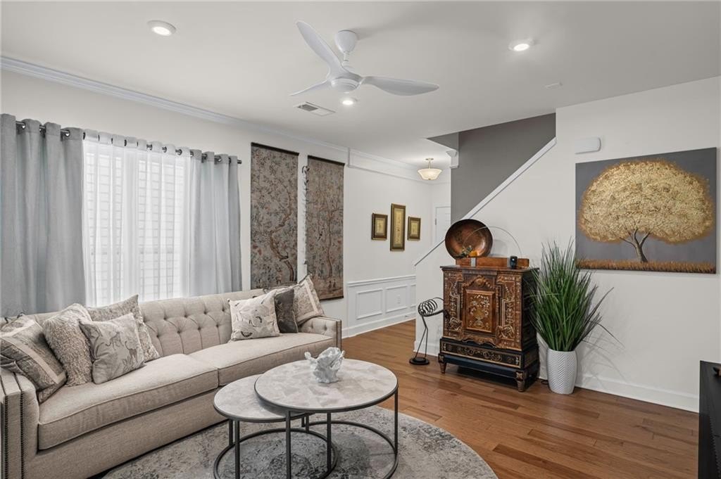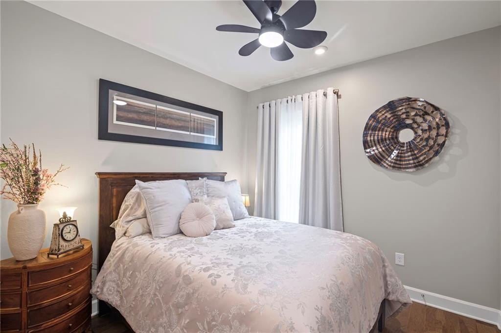 Inside, the home features fresh interior paint in Sherwin Williams Cashmere, creating a warm and elegant ambiance throughout. Custom blinds, updated ceiling fans, and beautiful wood flooring enhance the home’s modern yet inviting feel.