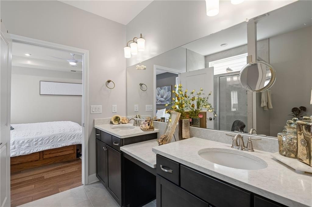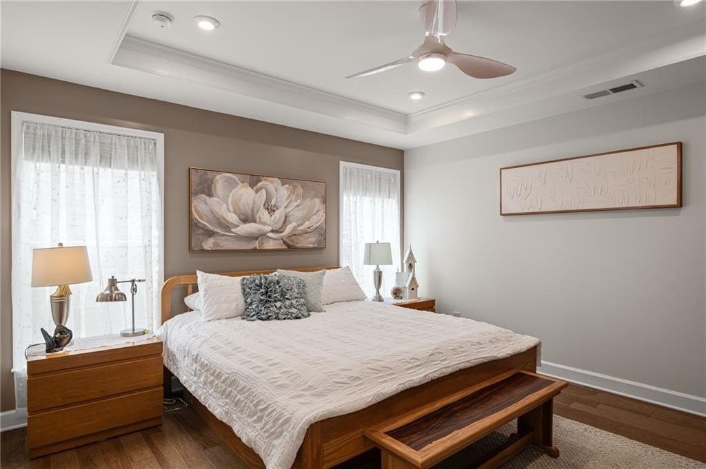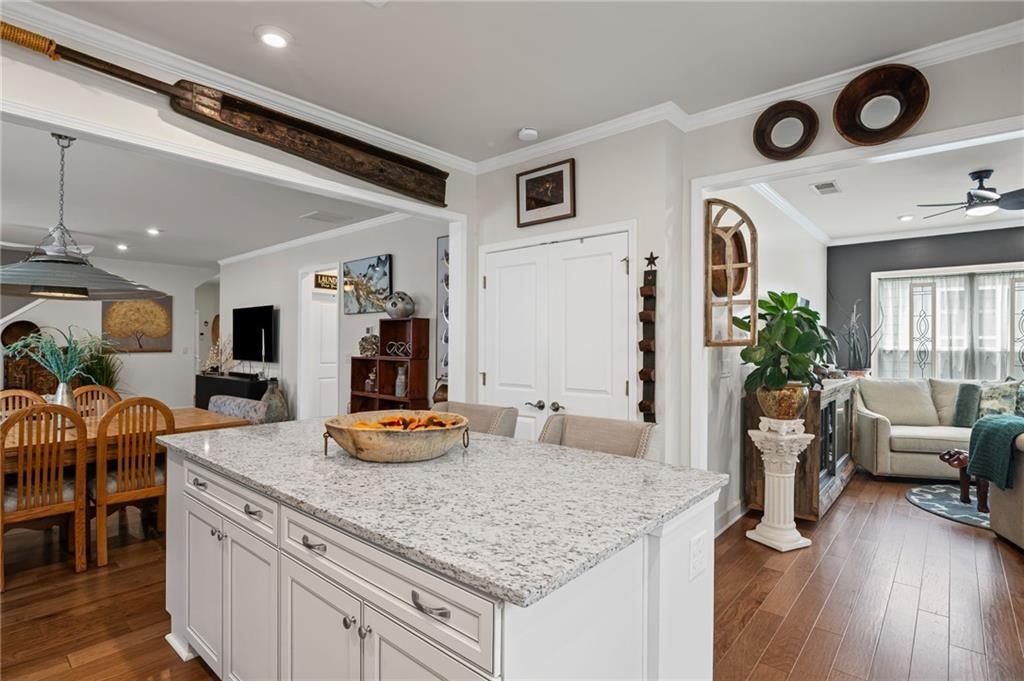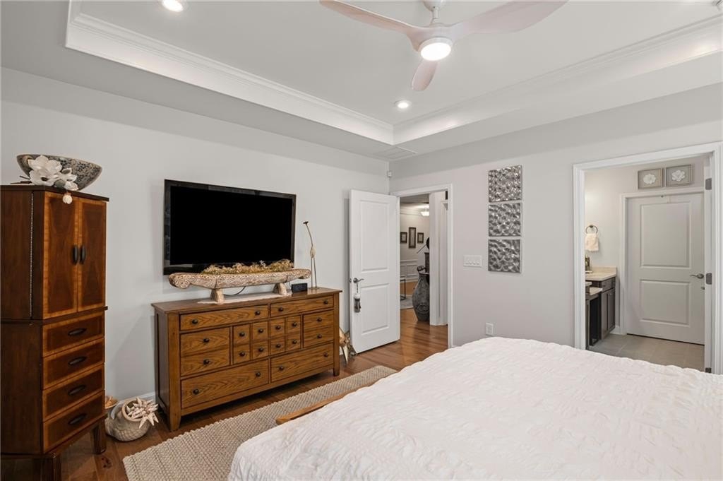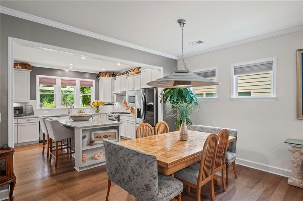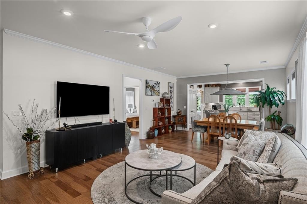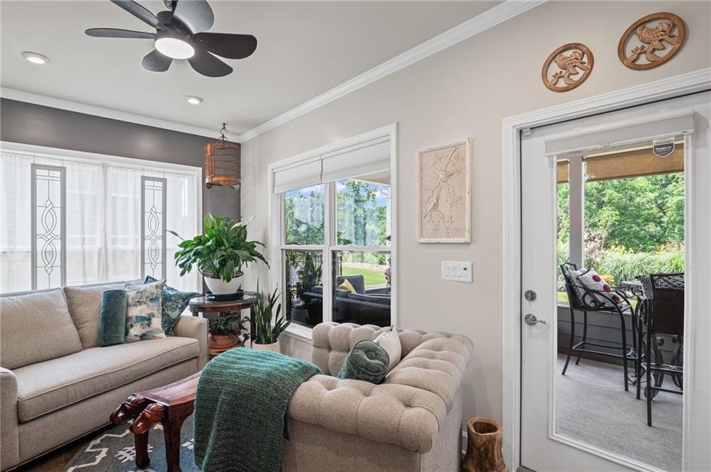 Inside, the home features fresh interior paint in Sherwin Williams Cashmere, creating a warm and elegant ambiance throughout. Custom blinds, updated ceiling fans, and beautiful wood flooring enhance the home’s modern yet inviting feel.