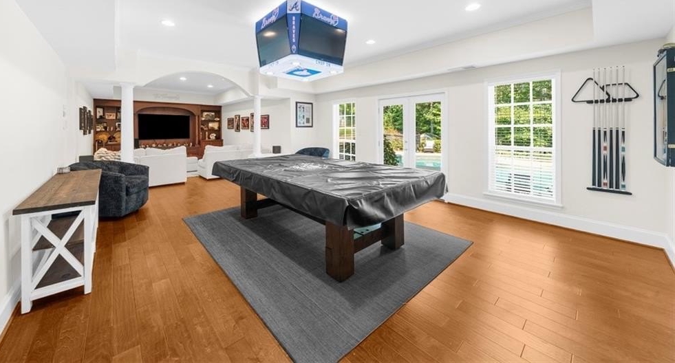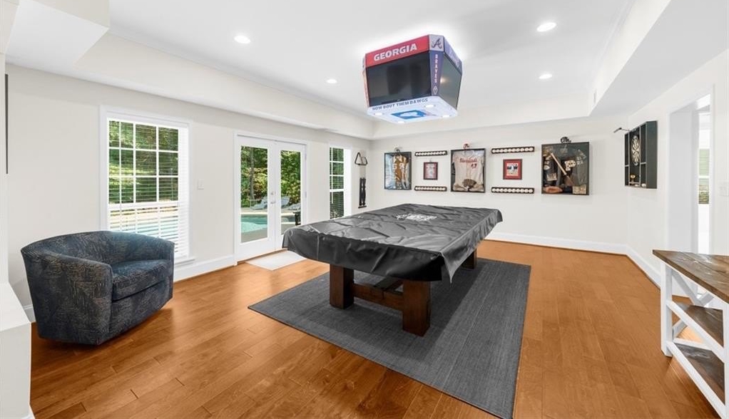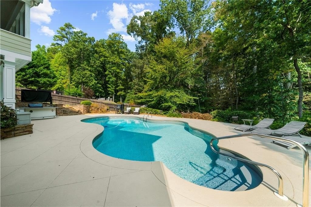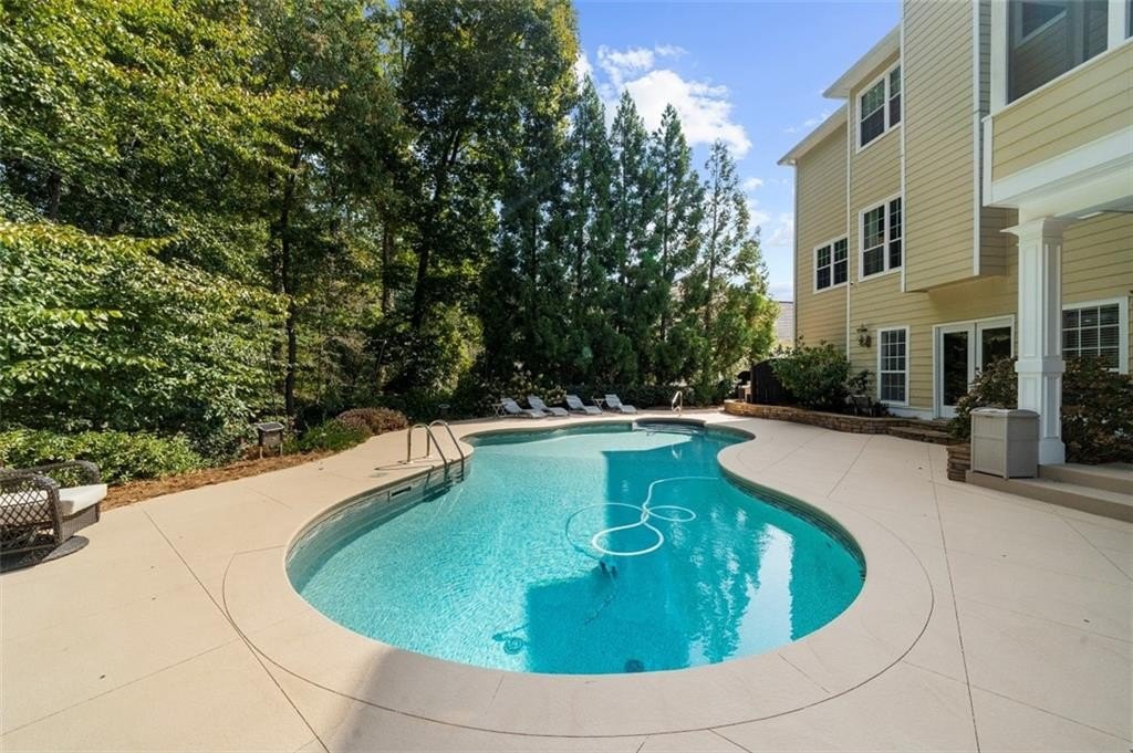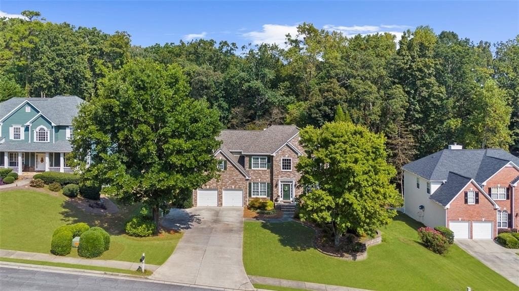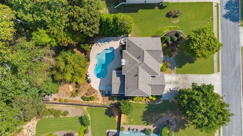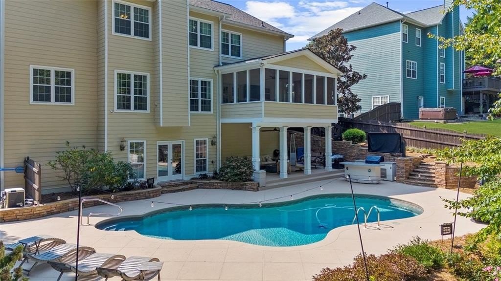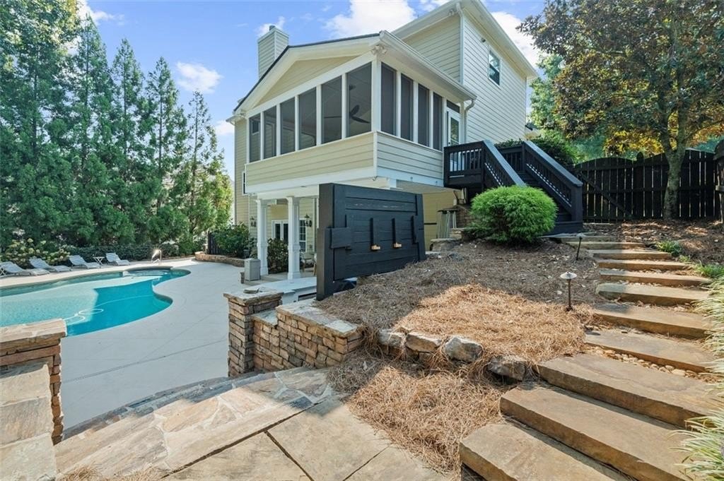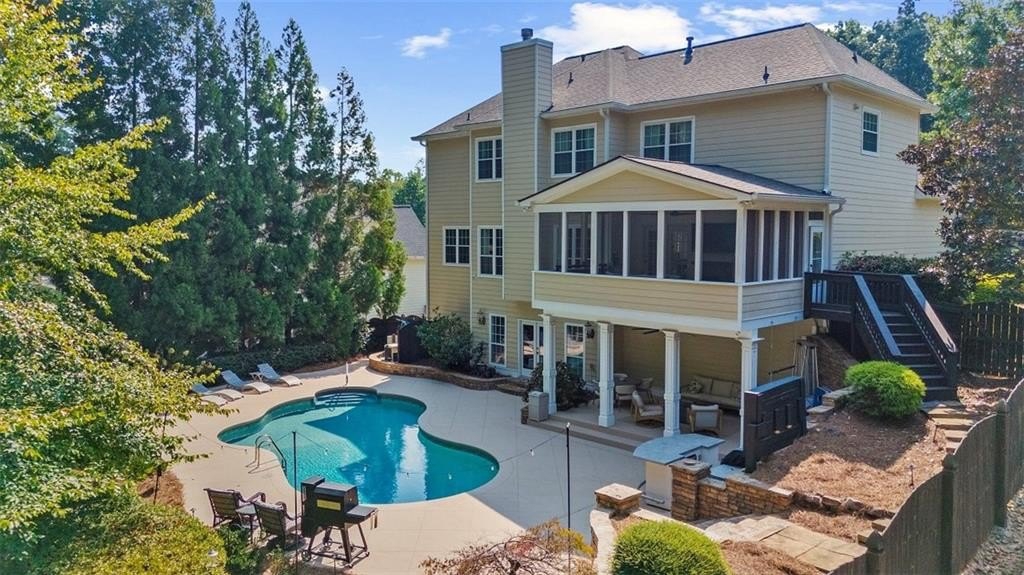 This beautifully maintained home blends timeless design with modern updates, creating the perfect retreat. Step inside to a jaw-dropping two-story foyer and immediately feel the warmth of this inviting space. Highlights include updated windows, newer carpet, a recently repainted exterior with Hardie Plank siding and brick front, and an epoxy-finished oversized garage. A private office with custom built-ins and a new aluminum-clad door offers the perfect work-from-home space, while the large dining room flows easily into the open-concept kitchen and living room. The oversized kitchen features wood-stained cabinetry, stainless steel appliances, a stunning backsplash, and a sink window framing incredible outdoor views. Step directly onto the expansive screened-in porch, which overlooks the private backyard oasis. The fireside living room with coffered ceilings is perfect for gatherings, and hardwood floors run throughout the main level and upstairs hallways. The owner's suite is oversized with space for a sitting area and a fully renovated marble bathroom with soaking tub, double vanities, and a large walk-in closet. Upstairs, you'll find three more spacious bedrooms, a full bath, and a walk-in laundry room. The finished basement is a true showstopper, complete with a wet bar, full bath, oversized bedroom, custom built-ins, theater room, and game room. Outside, enjoy resort-style living with a large saltwater pool, expansive pool deck, covered patio, and private fire pit area. The landscaped backyard extends beyond the fence to the serene creek, offering unmatched privacy and natural beauty. With a 30-year architectural roof (only 5 years old) and a location minutes from Kennesaw Mountain, Marietta Square, Downtown Acworth, shopping, dining, I-75, and more, this home offers the best of convenience and tranquility. Don't miss the chance to own this one-of-a-kind property!