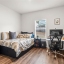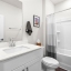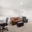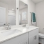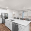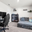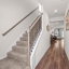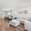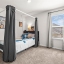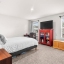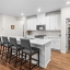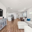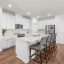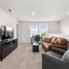 The open-concept main level boasts 9-ft ceilings, a bright living area, and a chef’s kitchen featuring quartz countertops, sleek white cabinetry, custom pantry shelving, stainless steel appliances with an induction range, and an oversized island ideal for gatherings. A bedroom and full bath on the main floor provide excellent flexibility for guests or multi-generational living.