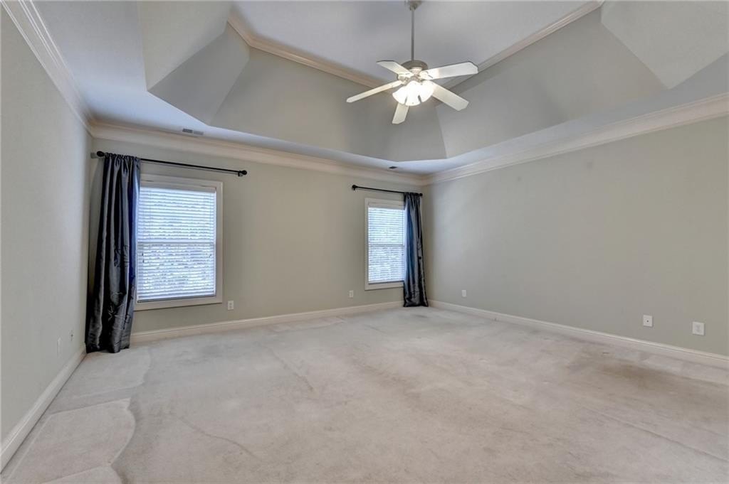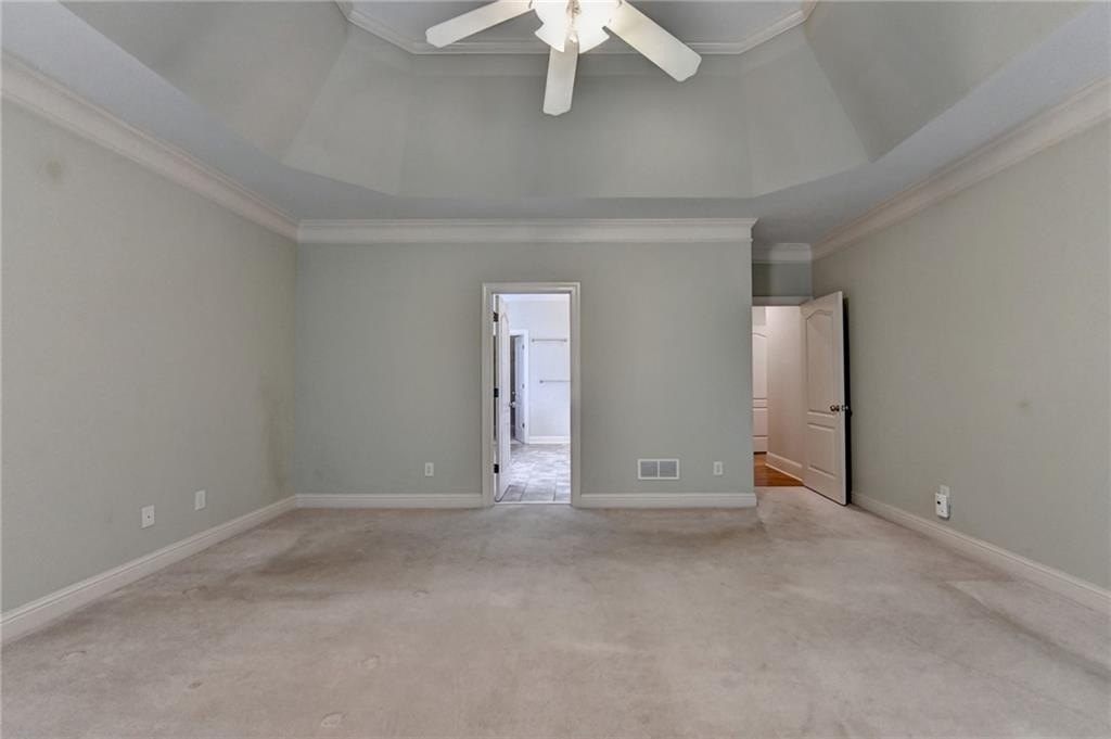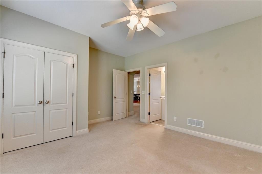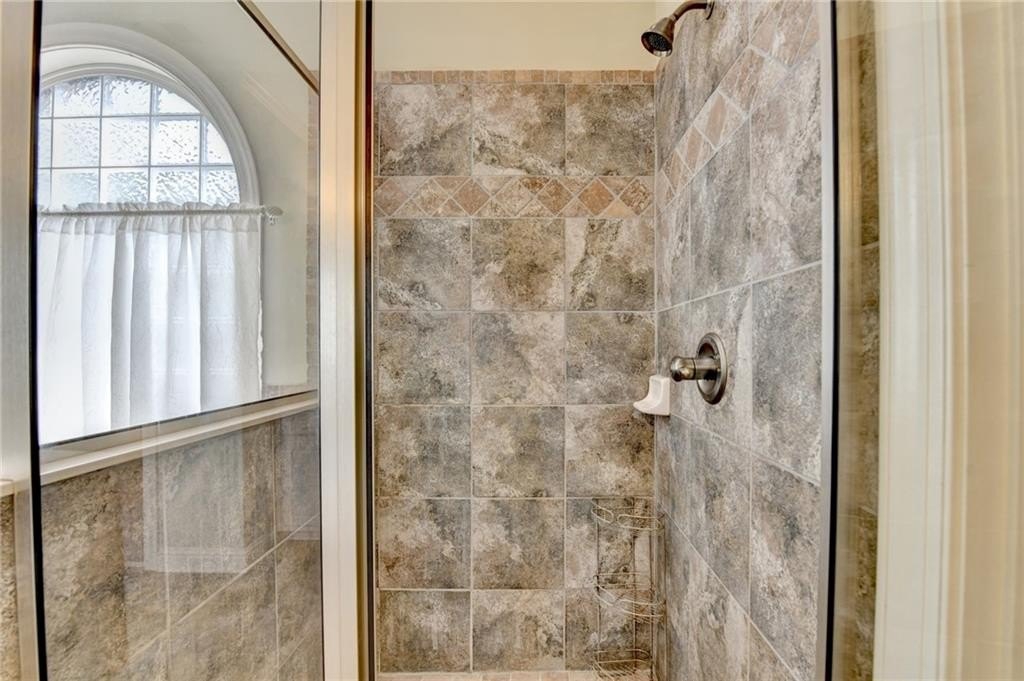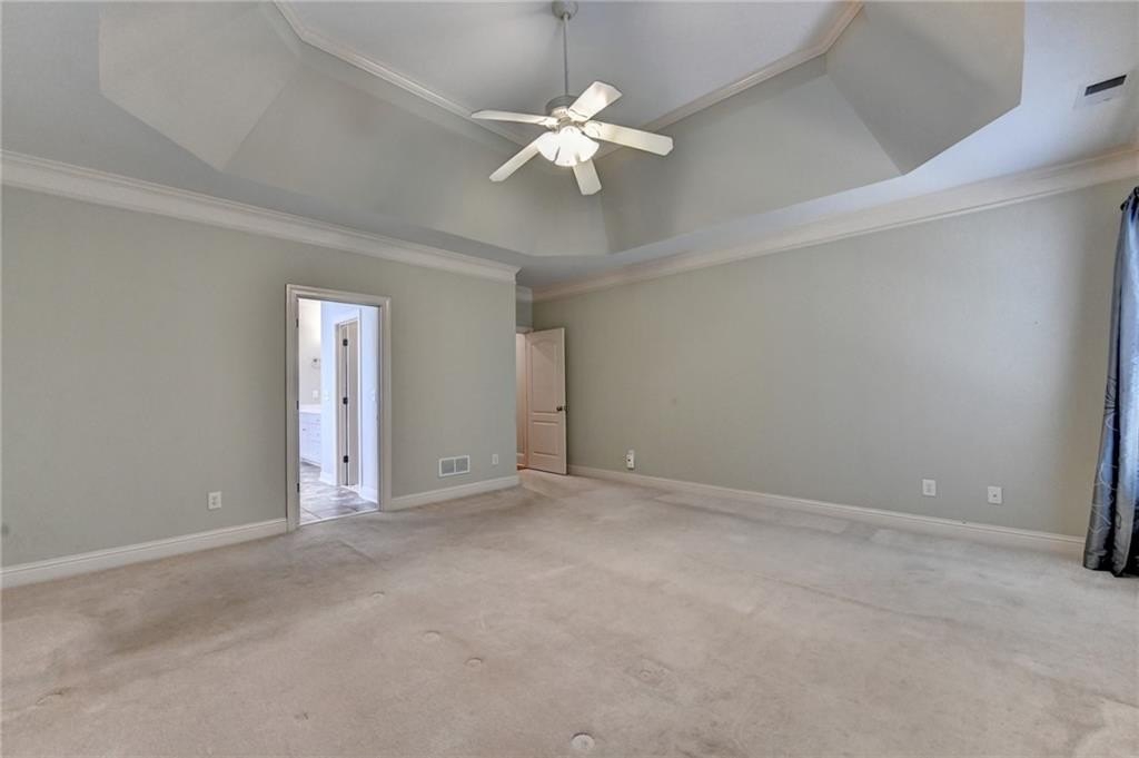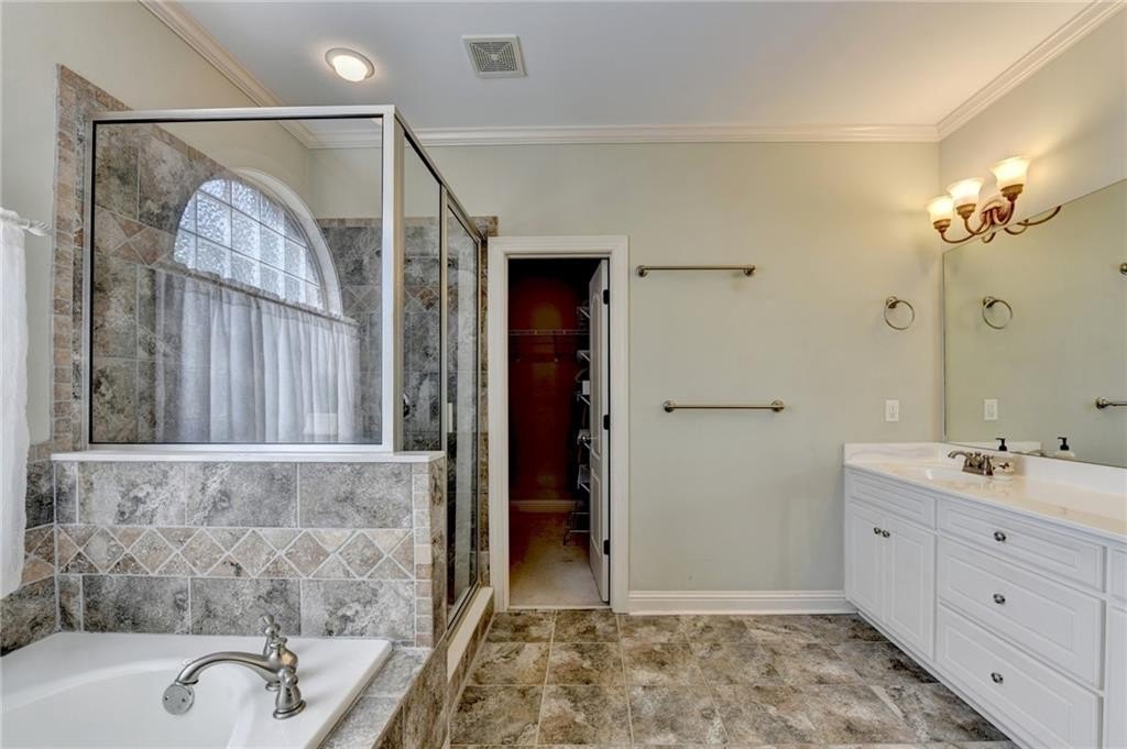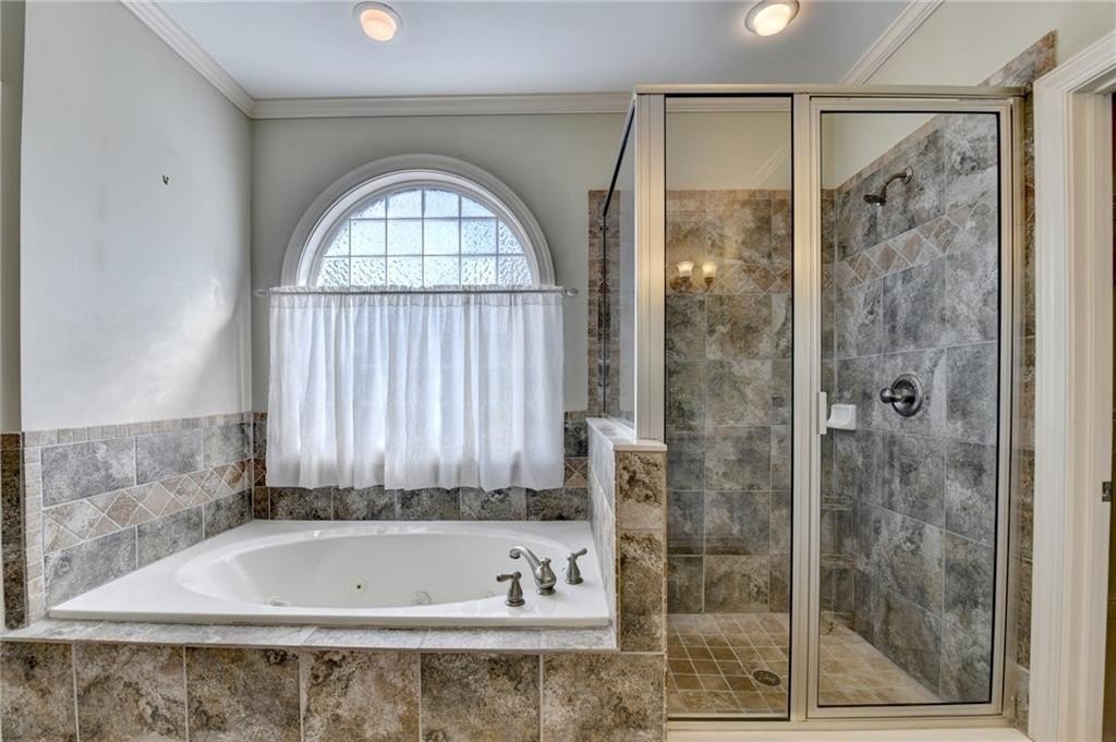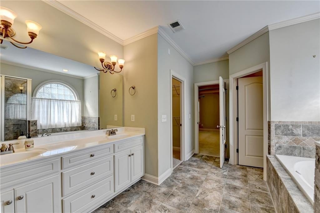 The primary suite on the main level features a spa-inspired bath with dual vanities, jetted tub, oversized tile shower, and two walk-in closets. Two additional main-level bedrooms share a full bath, while the upper level provides a generous in-law/teen suite with private bath.