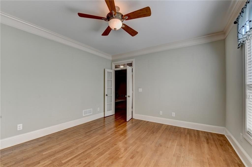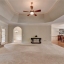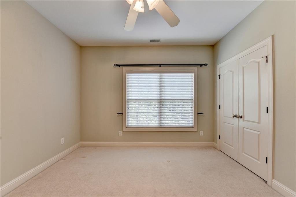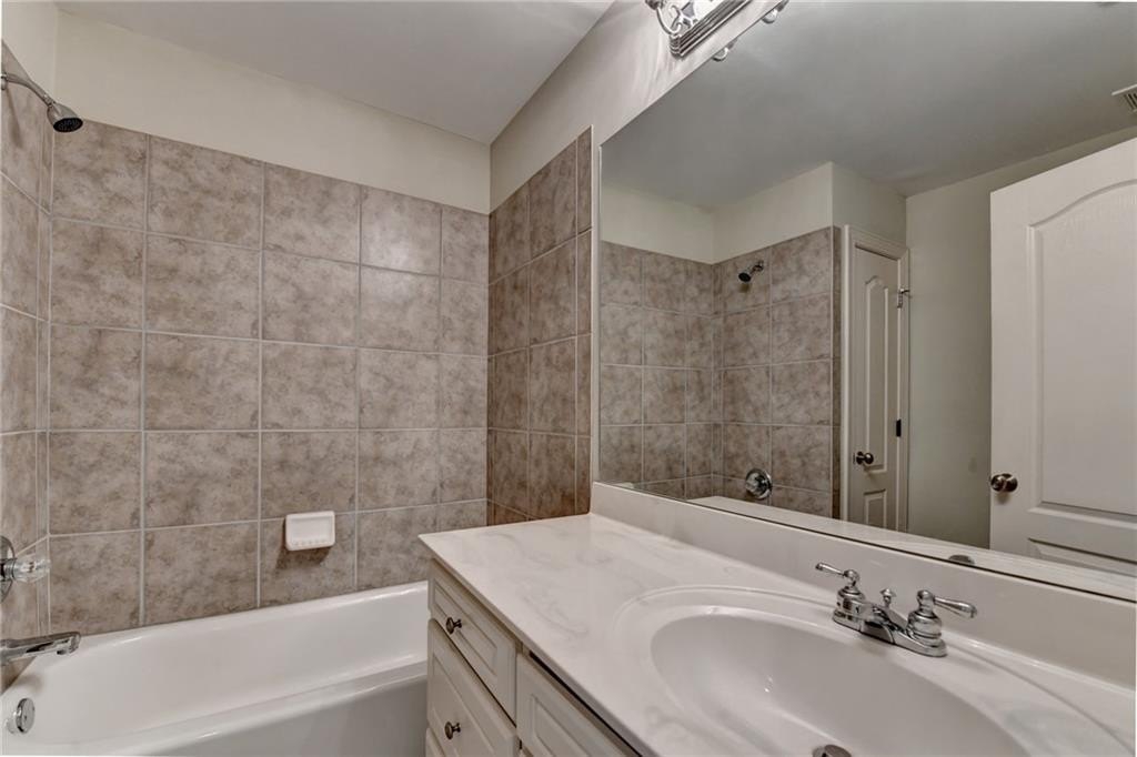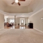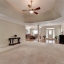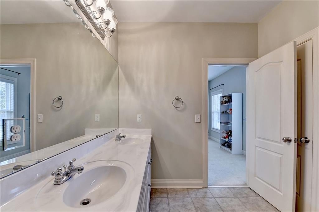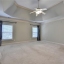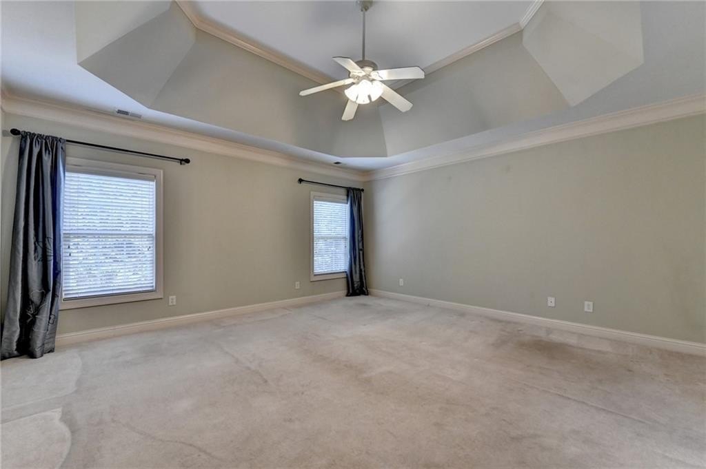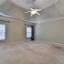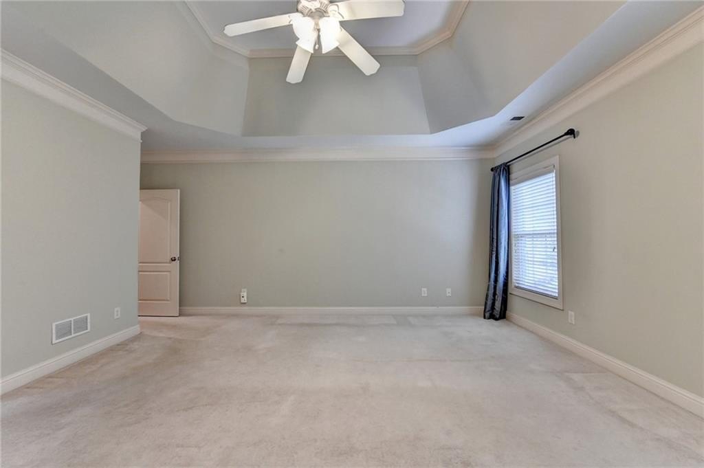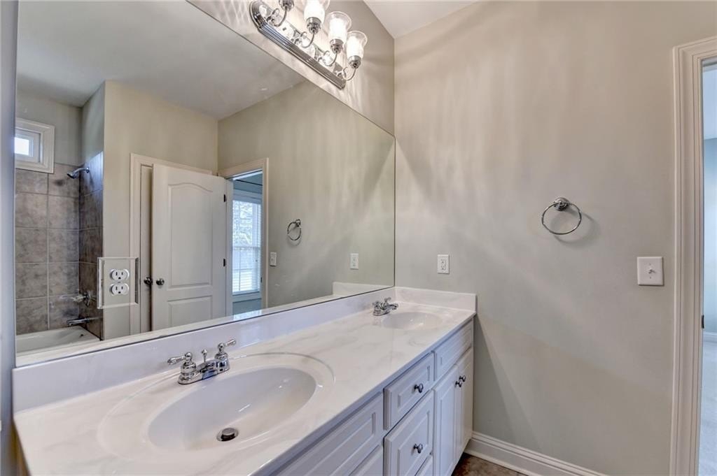 The primary suite on the main level features a spa-inspired bath with dual vanities, jetted tub, oversized tile shower, and two walk-in closets. Two additional main-level bedrooms share a full bath, while the upper level provides a generous in-law/teen suite with private bath.