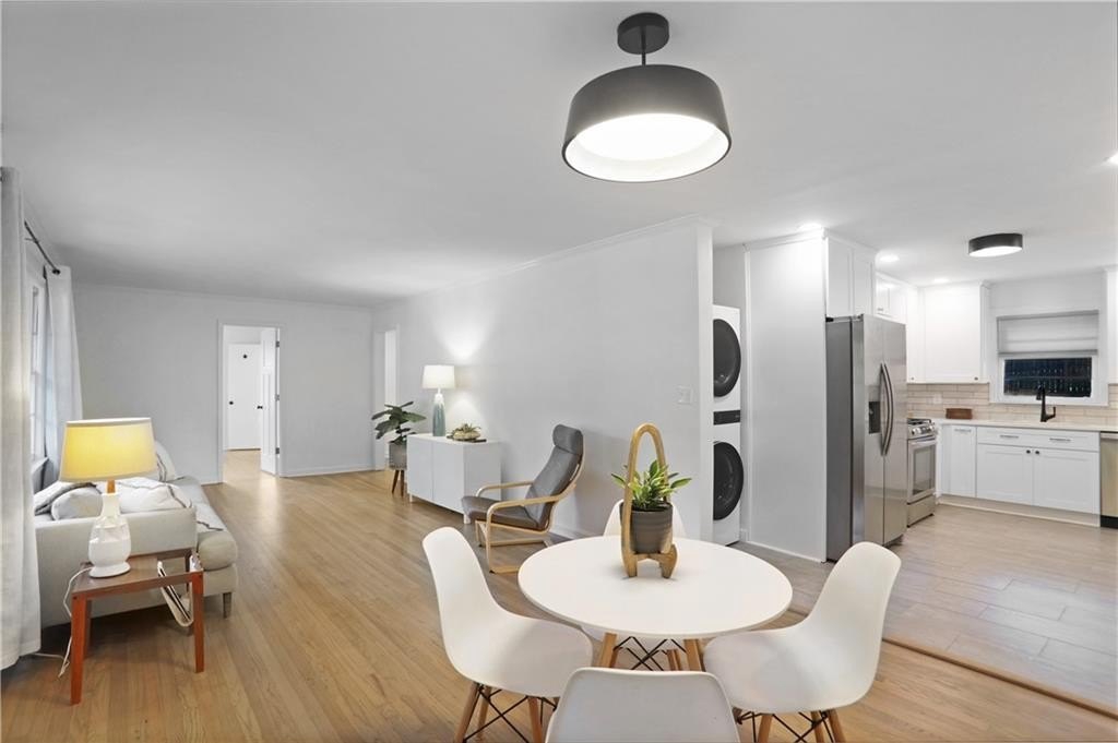 INSIDE THE HOME: Picture-perfect landscaping and a wide, flat brick exterior set the tone for this thoughtfully updated home. Expansive original windows flood the space with natural light, while refinished oak hardwood floors and custom mid-century modern details add warmth and character. The fully renovated kitchen features quartz countertops, brand-new stainless steel appliances (including a stackable washer/dryer), soft-close solid wood cabinetry, and space for your personal touches.
