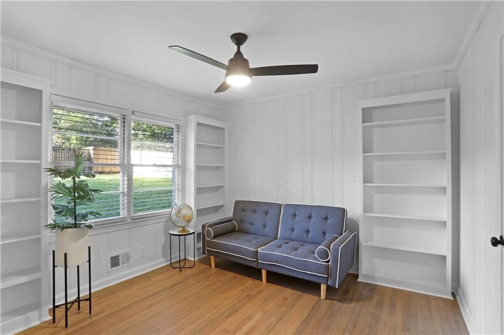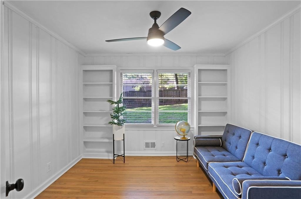 LAYOUT & LIVING SPACE: With a split-bedroom layout, the front suite offers privacy with its sleek, modern bathroom, while two additional bedrooms share a spacious, spa-like bath with soaking tub and tiled shower. One bedroom, accented with floor-to-ceiling built-ins and original paneling, makes the perfect home office, nursery, or library.