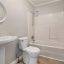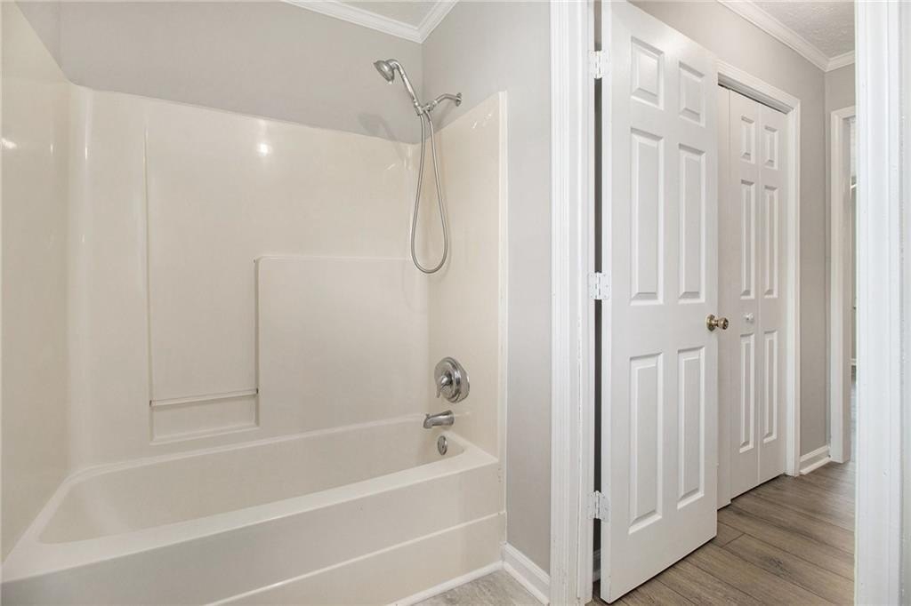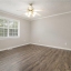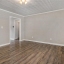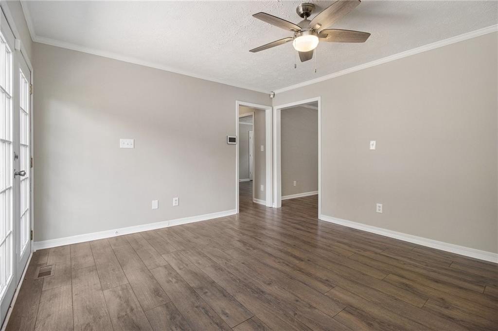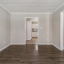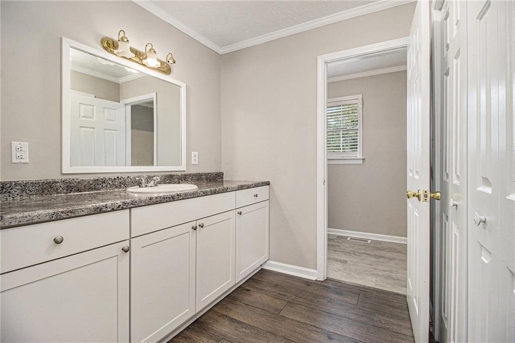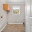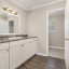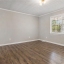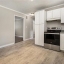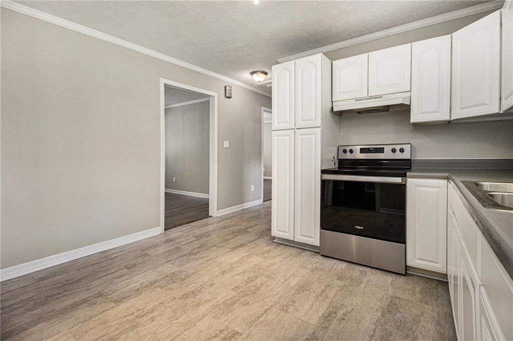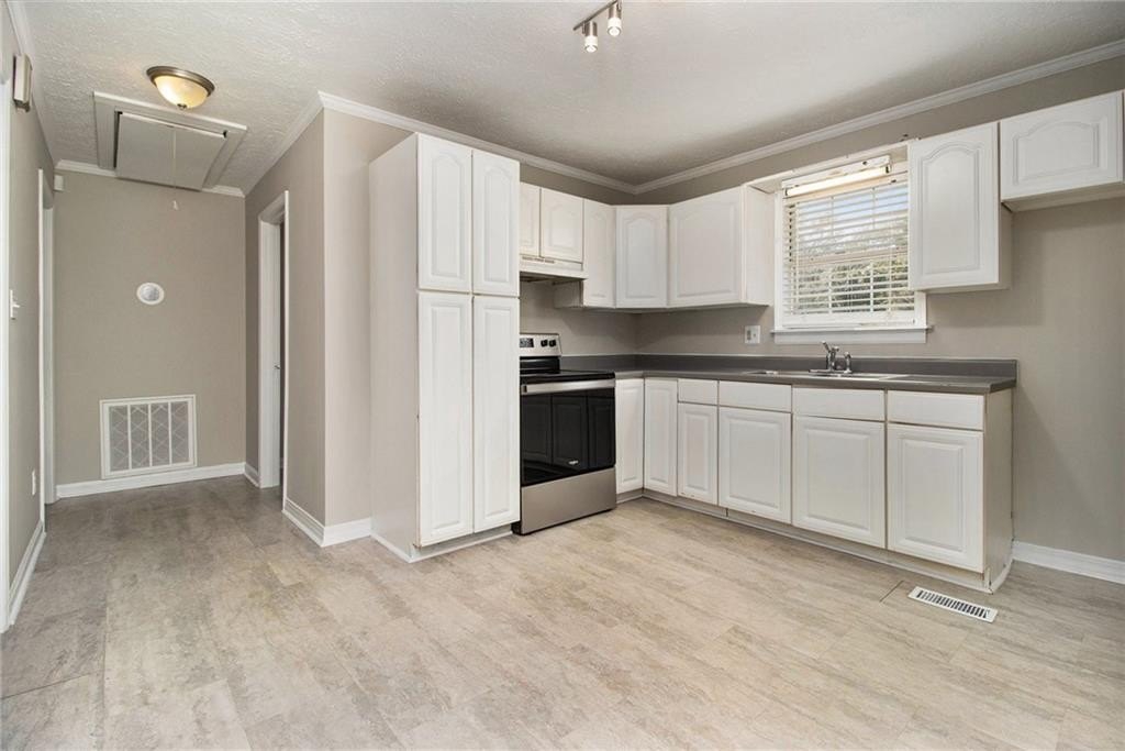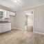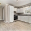 flooring throughout for a modern touch. The all-white eat-in kitchen features a