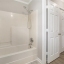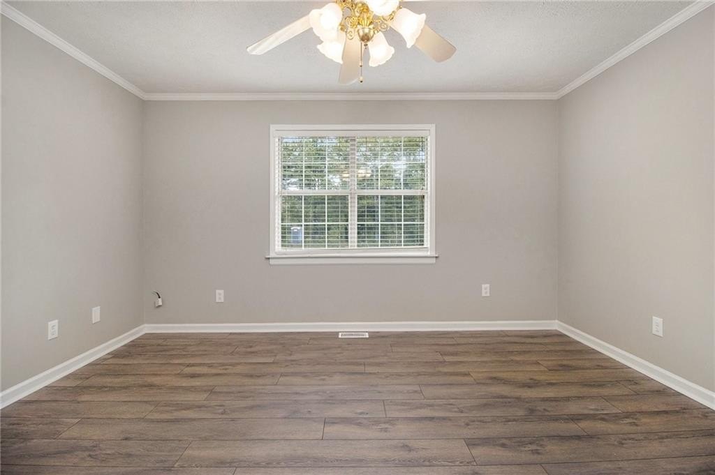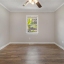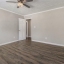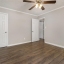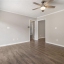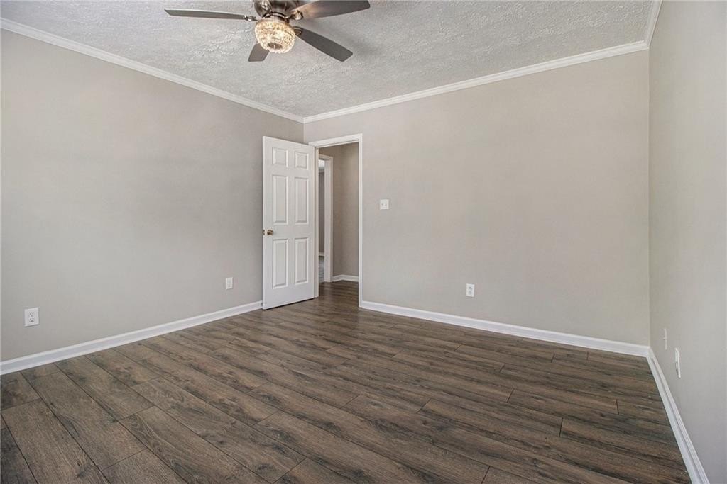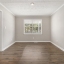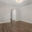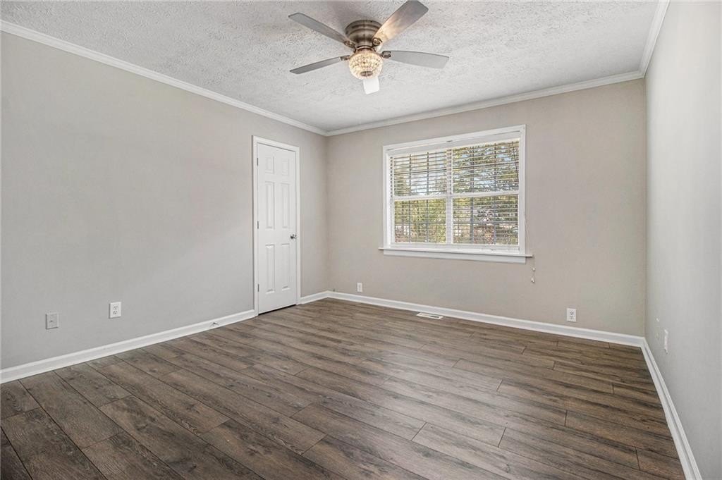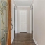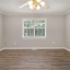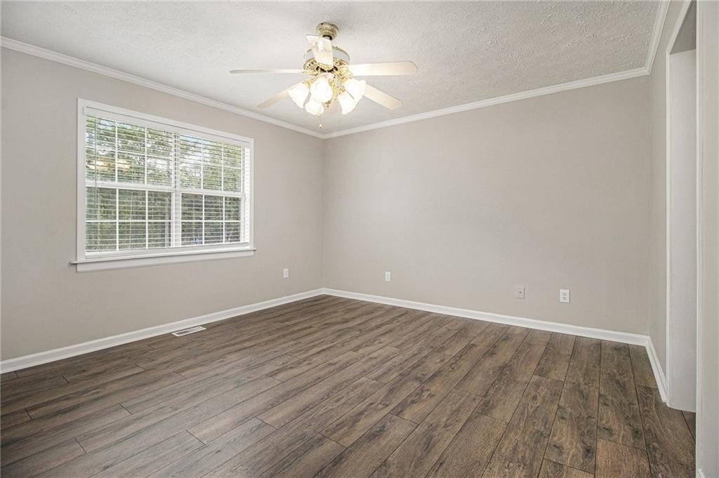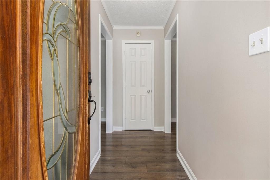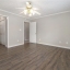 flooring throughout for a modern touch. The all-white eat-in kitchen features a