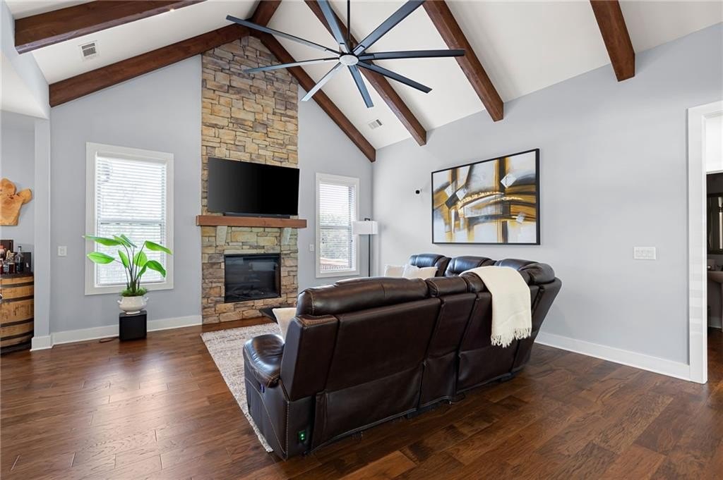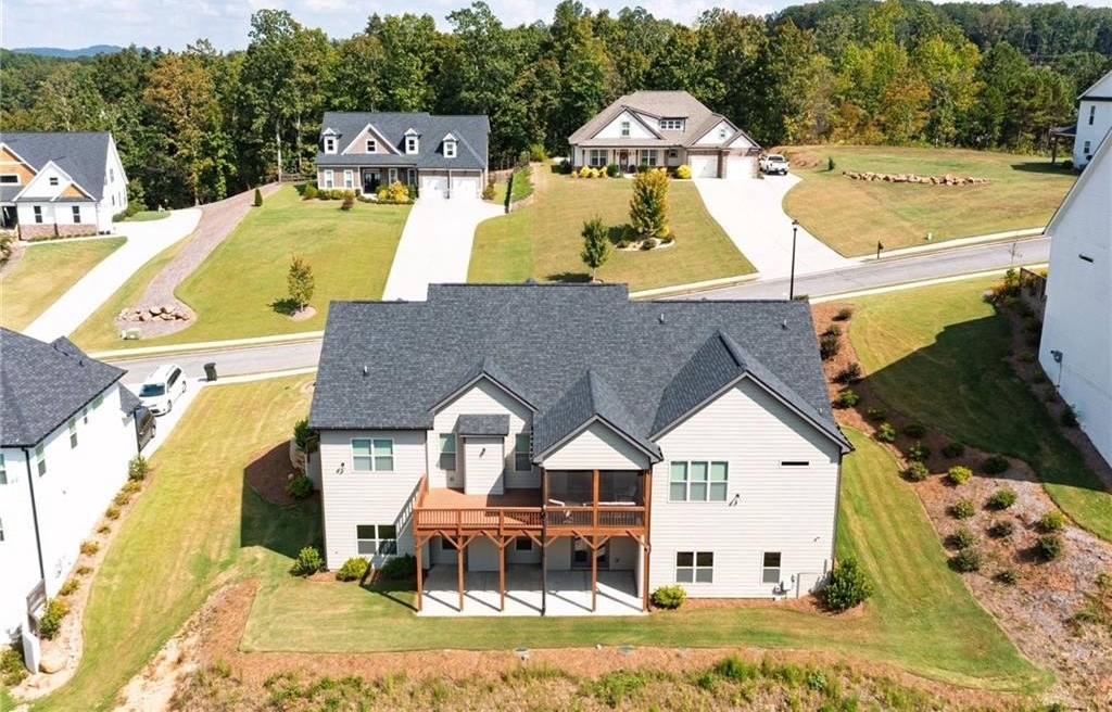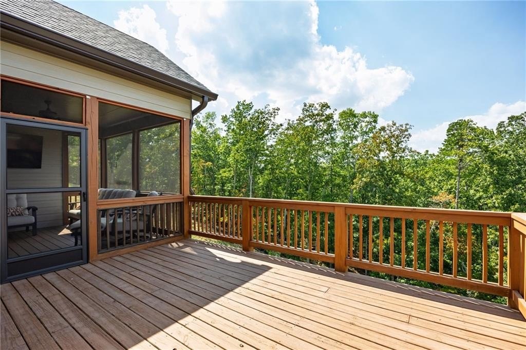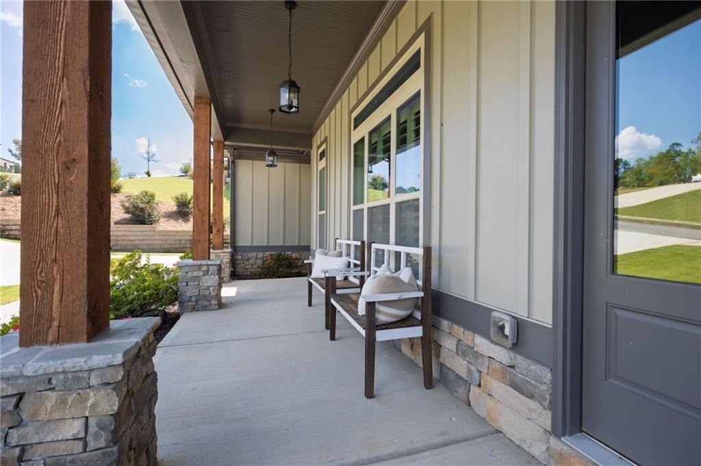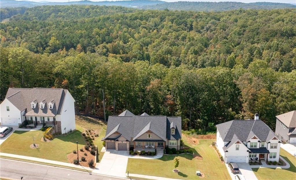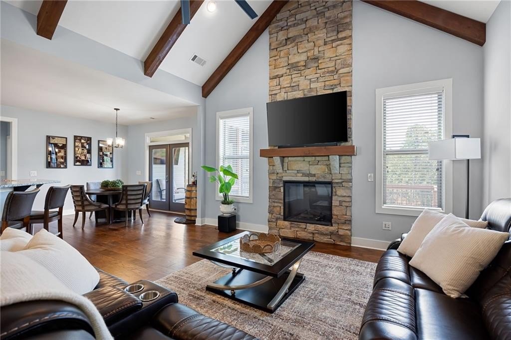 Better Than New with Stunning Views! This beautifully designed Modern Craftsman home offers the perfect blend of charm and contemporary comfort, featuring a striking multi-texture exterior with stone, board and batten, and shake-style siding. A welcoming front porch with stone and cedar accents leads to a double-door entry that opens into a thoughtfully designed open-concept main level. Inside, enjoy vaulted beamed ceilings, a cozy stone-surround fireplace, hardwood floors throughout, and 4-inch plantation shutters for a touch of elegance. The spacious kitchen boasts granite countertops, a breakfast bar, stainless steel appliances, updated stained cabinetry, recessed lighting, and a bright breakfast area. Step through double doors to a screened-in porch with beautifully stained beadboard ceiling, ceiling fan, and TV mount—perfect for relaxing or entertaining. The adjacent deck offers additional outdoor living space to enjoy the breathtaking views. The split bedroom floor plan ensures privacy, with the primary suite thoughtfully placed to take full advantage of the scenery. The spa-like primary bathroom includes a double vanity and an oversized walk-in shower with double entry, ceiling-mount rain shower, and a wall-mounted shower head. Two additional bedrooms on the main level share a full bath, and a half bath adds extra convenience. A dedicated laundry room with cabinetry and a mudroom off the garage enhance everyday functionality. Upstairs, you'll find a spacious fourth bedroom or bonus room complete with its own full bath and attic storage. The huge unfinished basement is already stubbed for a bathroom and kitchen, ready for your customization. Step outside to the extended concrete patio—an ideal space for outdoor entertaining. Less than 3 miles from 1-75! Everything is 3 years young!