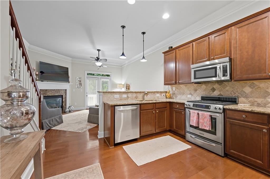 Welcome to Cobblestone at Brookhaven, a highly sought-after gated community! This stunning 3-bedroom townhome offers a thoughtful split floor plan, with each bedroom featuring its own private bath. On the main level, you’ll find original hardwood floors, a separate dining room (perfect as an office or flex space), a half bath, and an open kitchen overlooking the bright and spacious living area and fireplace. Step outside to the private balcony overlooking a peaceful wooded backdrop, ideal for relaxing or entertaining. Upstairs, the oversized primary suite boasts trey ceilings, a custom walk-in closet, and a spa-like bathroom with a soaking tub, separate shower, and double vanity. The second upstairs bedroom also offers a walk-in closet and en-suite bath, conveniently located near the laundry room with the W/D included. The terrace level provides a third bedroom with en-suite bath and walk-out access to a private patio. This home includes a one-car garage with driveway parking and ample storage. Residents enjoy a quiet, well-maintained community with a pool, plenty of guest parking, access to Briarwood Park, I-85, GA-400, and all the shopping and dining along Dresden.