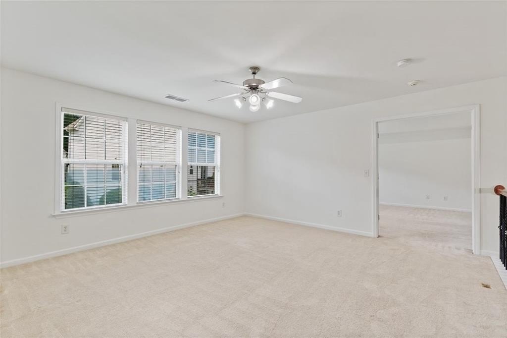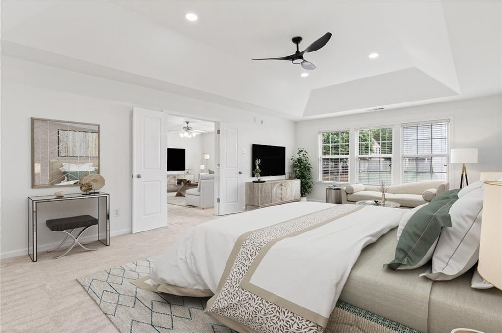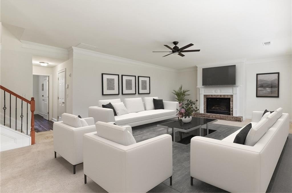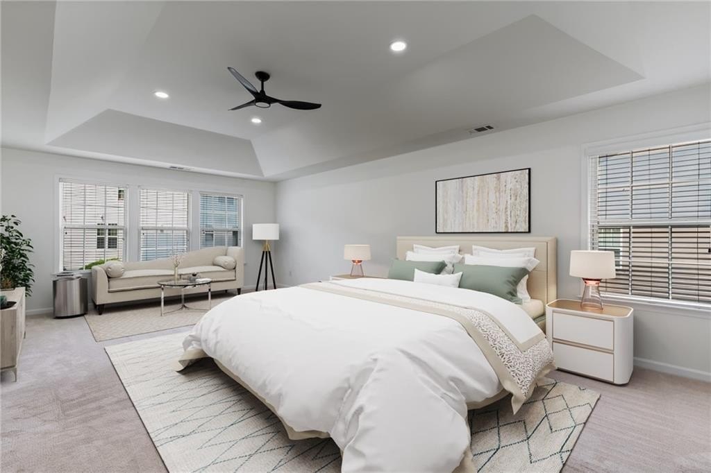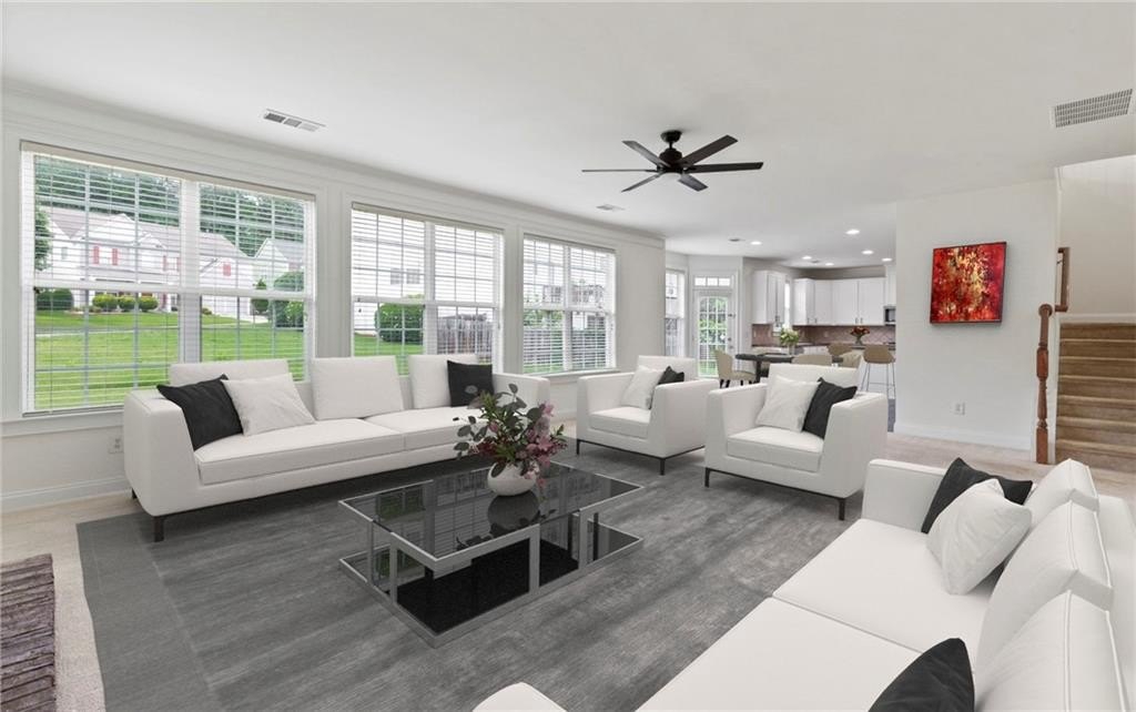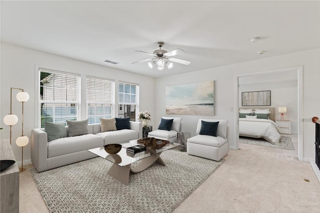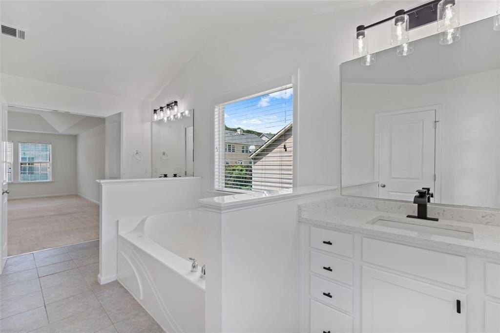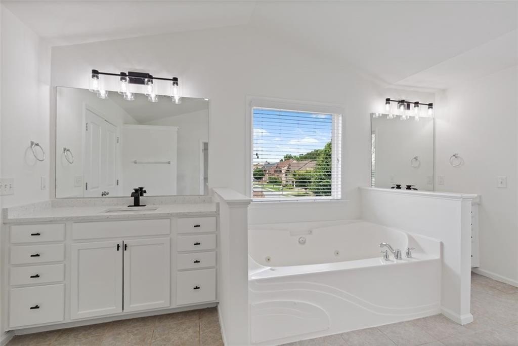 —an inspired culinary space featuring newly painted white cabinetry, a generous island, a walk-in pantry, and ample storage. It opens seamlessly into the expansive living room, featuring a calming fireplace, where oversized windows frame views of the lush backyard and bathe the home in golden sunlight. Upstairs, a spacious loft provides the perfect flex space for entertaining or lounging. Three well-appointed secondary bedrooms offer comfort and scale, while the secondary bathrooms feature newly installed luxury LVP flooring. The owner's suite is a private sanctuary—complete with new recessed lighting and a lavish en-suite bath showcasing double vanities with fresh quartz countertops, a jetted soaking tub, a glass-enclosed shower, and an oversized walk-in closet. Outdoors, the private backyard is perfect for hosting or relaxing in your own serene escape. As part of a well-appointed community, residents enjoy access to resort-inspired amenities including a sparkling swimming pool, elegant clubhouse, tennis courts, basketball court, and playground—creating the perfect blend of luxury living and vibrant lifestyle. Every detail in this exceptional home has been curated for those who value beauty, light, and livability. A truly special offering where form and function meet in perfect harmony. Home is virtually staged