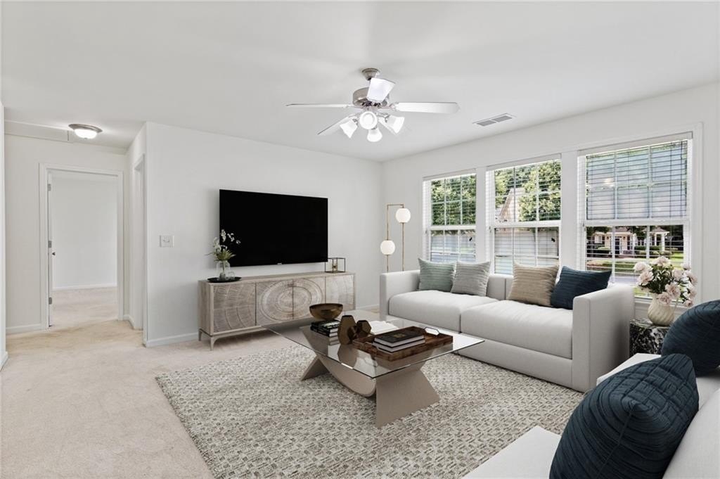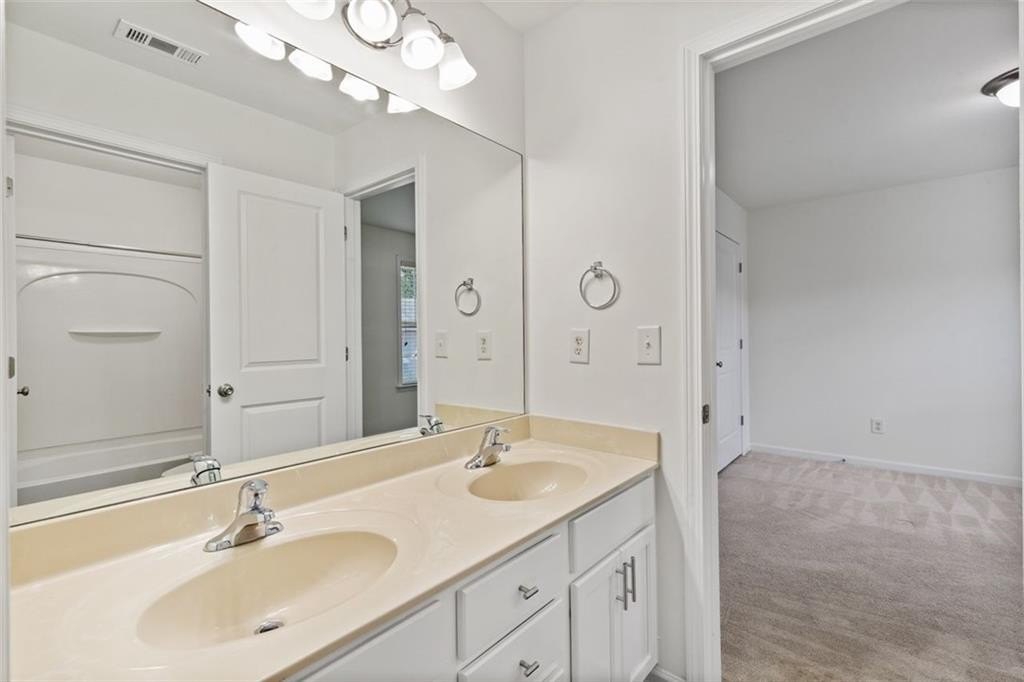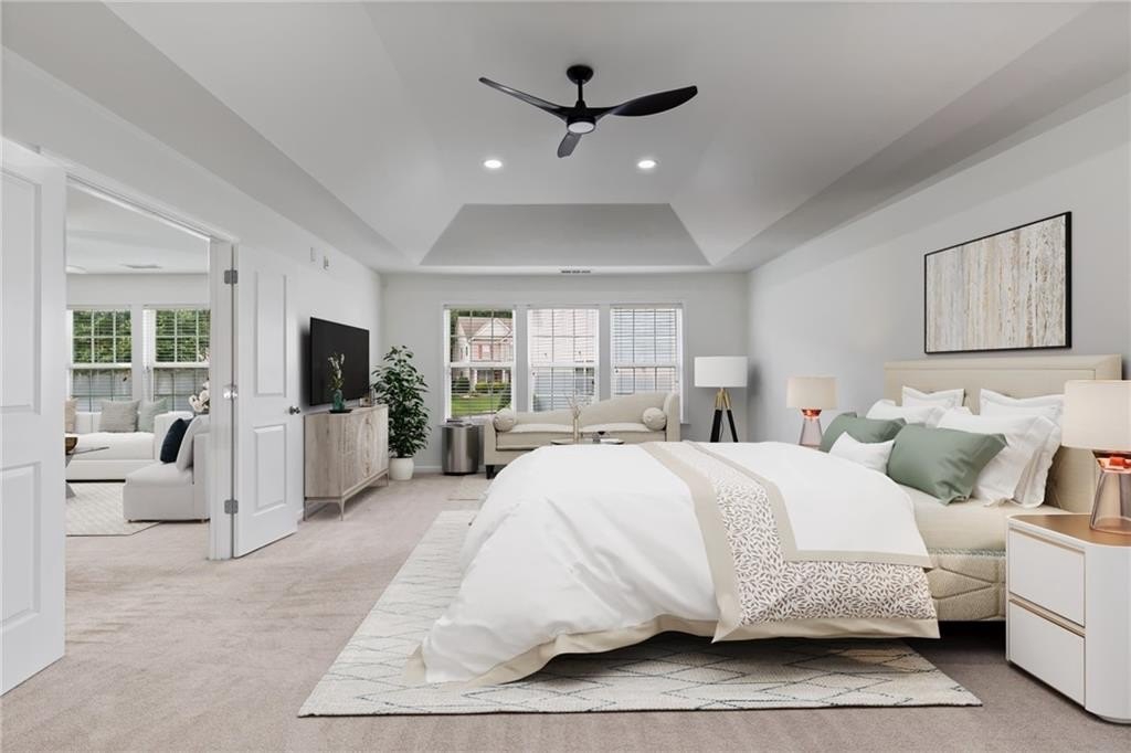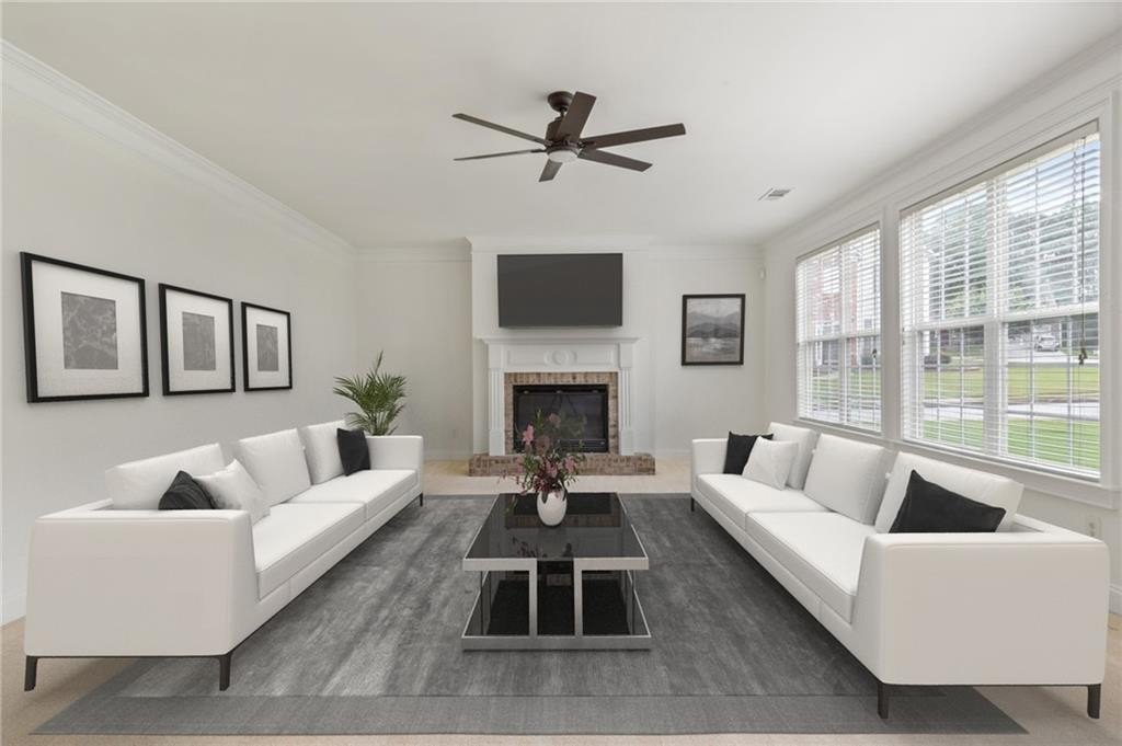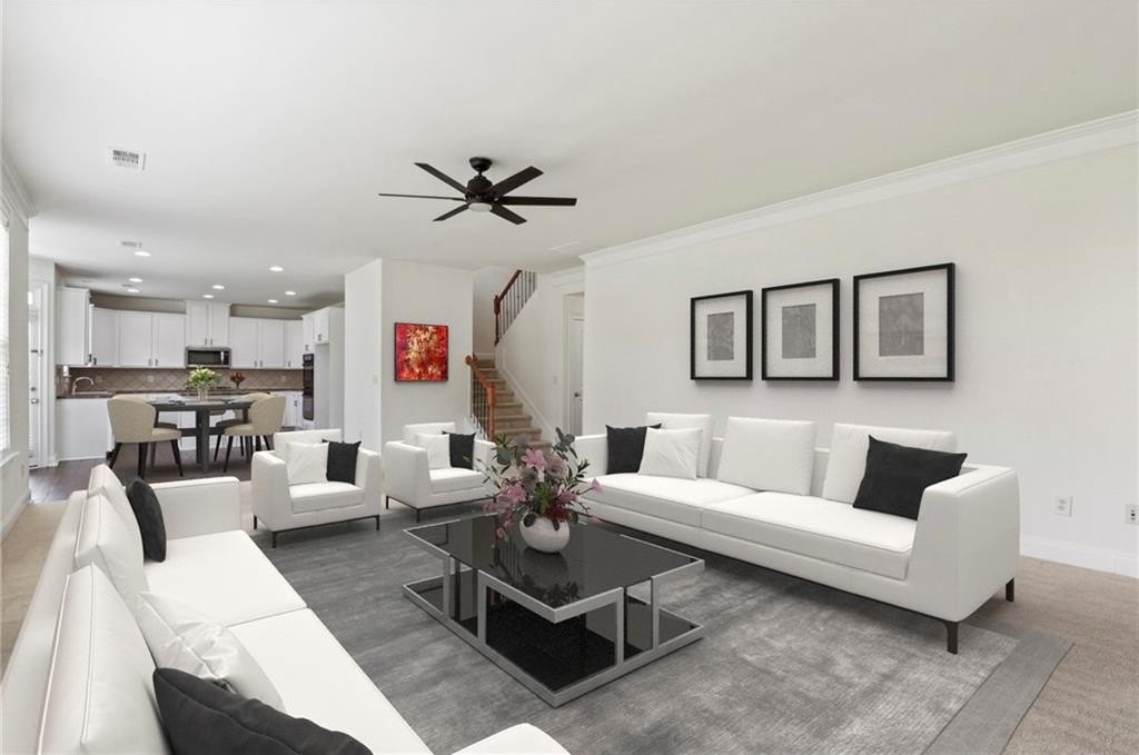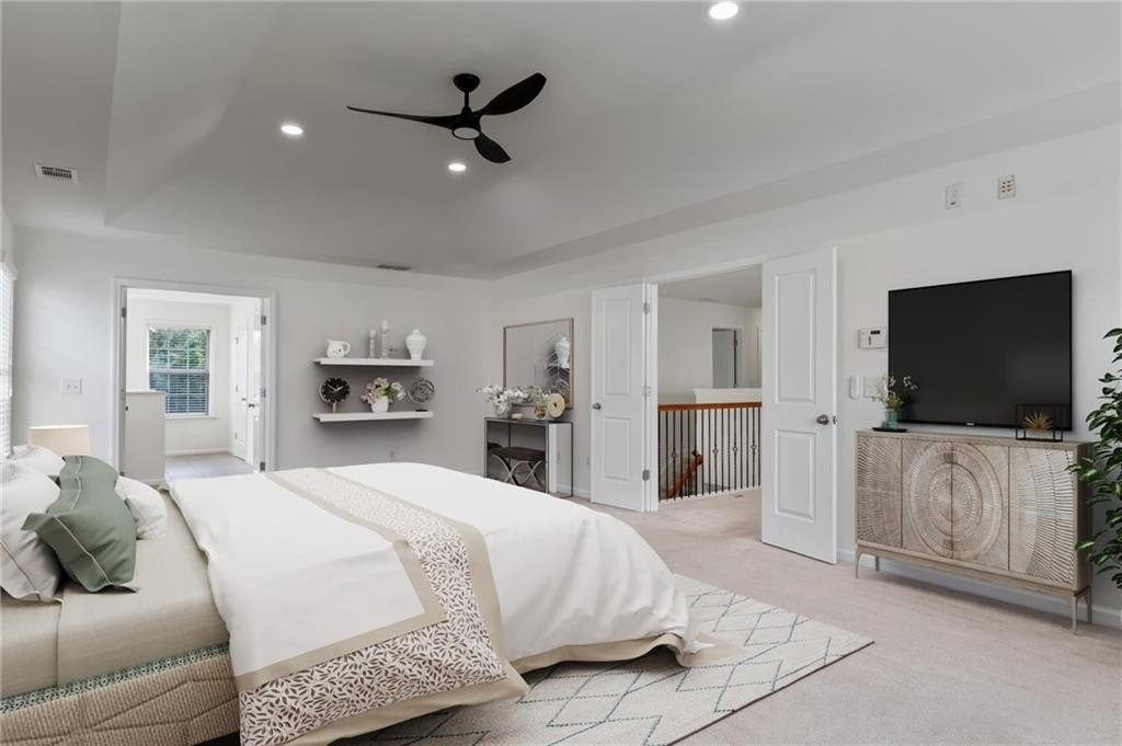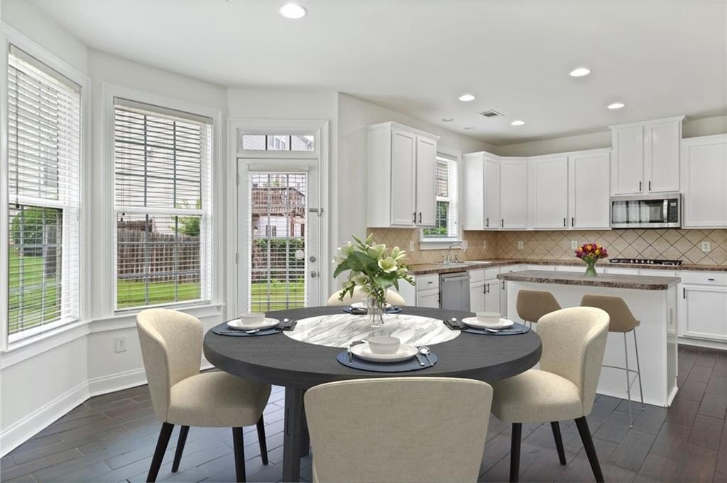 —an inspired culinary space featuring newly painted white cabinetry, a generous island, a walk-in pantry, and ample storage. It opens seamlessly into the expansive living room, featuring a calming fireplace, where oversized windows frame views of the lush backyard and bathe the home in golden sunlight. Upstairs, a spacious loft provides the perfect flex space for entertaining or lounging. Three well-appointed secondary bedrooms offer comfort and scale, while the secondary bathrooms feature newly installed luxury LVP flooring. The owner's suite is a private sanctuary—complete with new recessed lighting and a lavish en-suite bath showcasing double vanities with fresh quartz countertops, a jetted soaking tub, a glass-enclosed shower, and an oversized walk-in closet. Outdoors, the private backyard is perfect for hosting or relaxing in your own serene escape. As part of a well-appointed community, residents enjoy access to resort-inspired amenities including a sparkling swimming pool, elegant clubhouse, tennis courts, basketball court, and playground—creating the perfect blend of luxury living and vibrant lifestyle. Every detail in this exceptional home has been curated for those who value beauty, light, and livability. A truly special offering where form and function meet in perfect harmony. Home is virtually staged