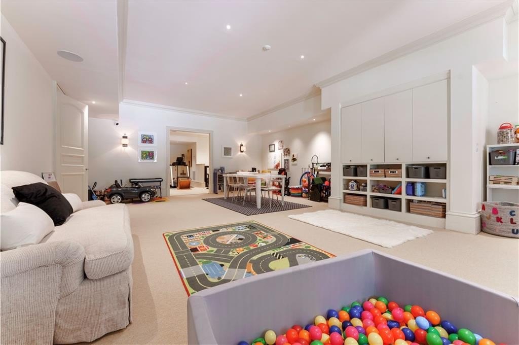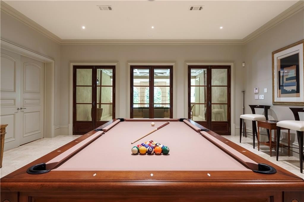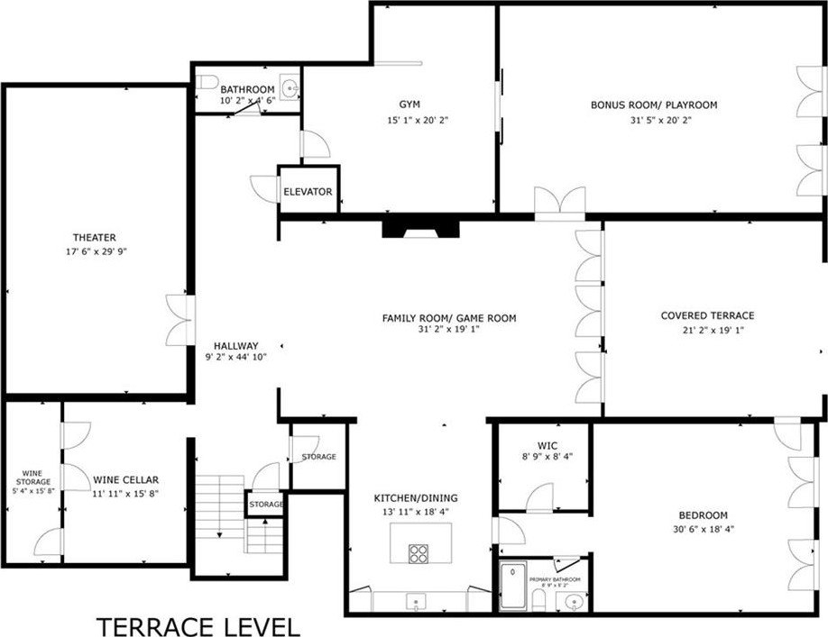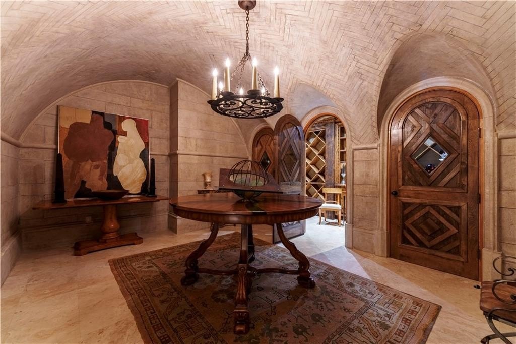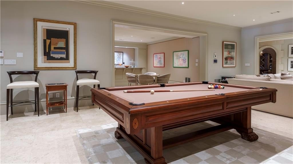 The terrace level is designed for entertainment and relaxation, featuring a wine cellar, home theater, game room, bar, guest quarters, and playrooms. An elevator provides convenient access to all levels.